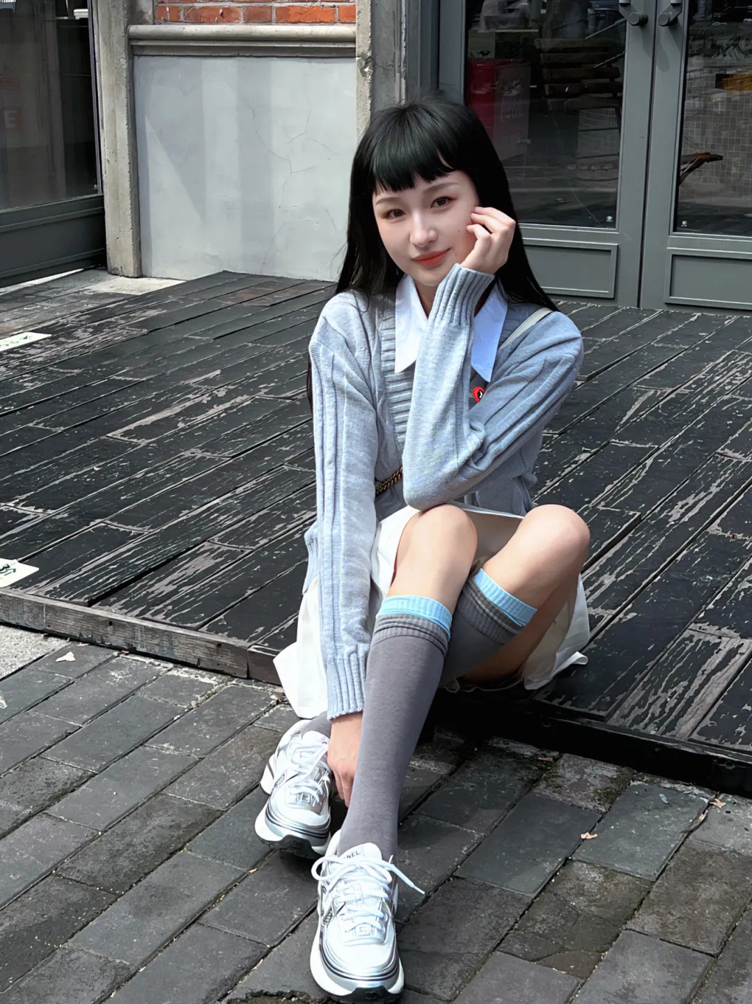 平时穿这种v领的毛衣,有时候还要思考很久这个内搭要怎么搭,这种假两件的款式直接解决烦恼,毛衣和衬衫的设计也很有学院的感觉,复古又减龄!