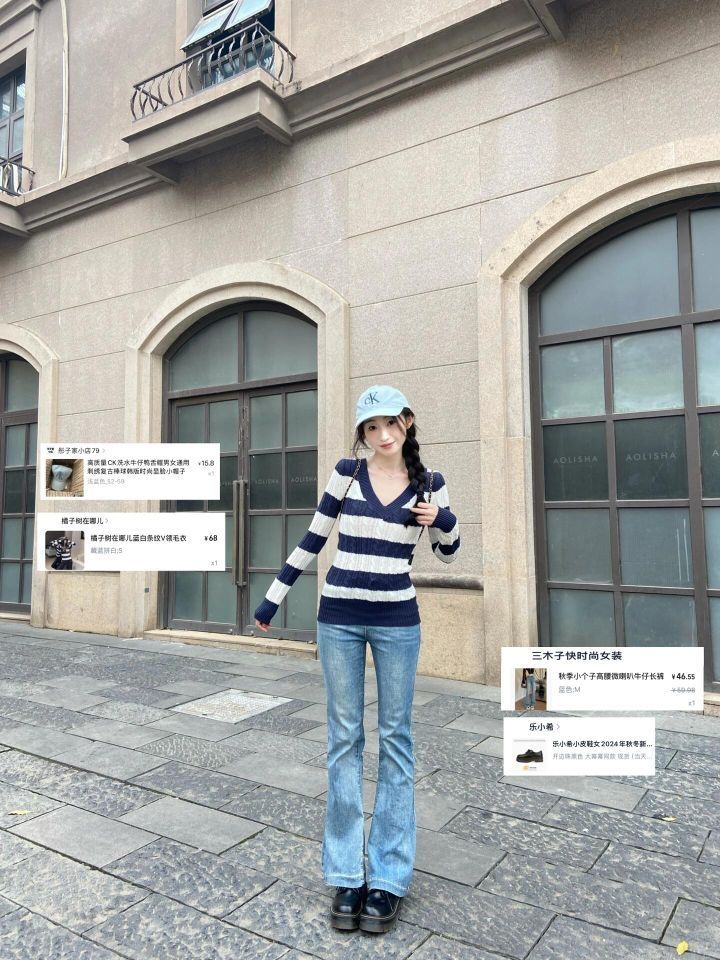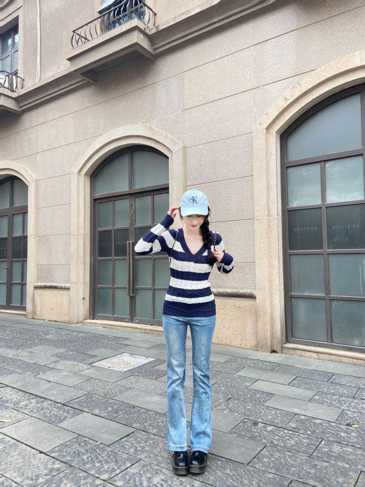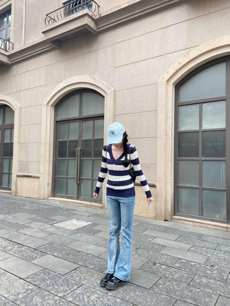蓝白条纹针织衫好显瘦~ 韩系显身材的一套