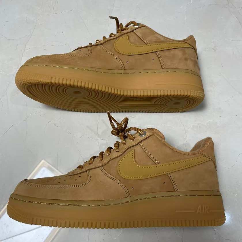小麦空军。球鞋还是板鞋你说了算。就是为秋冬准备的。— 保暖厚实。颜色正点。二。工业风十足。偶尔雨水天也不用担心。淋湿鞋面。表皮。容易留指纹。指甲划痕。不过材质这样。没多大事