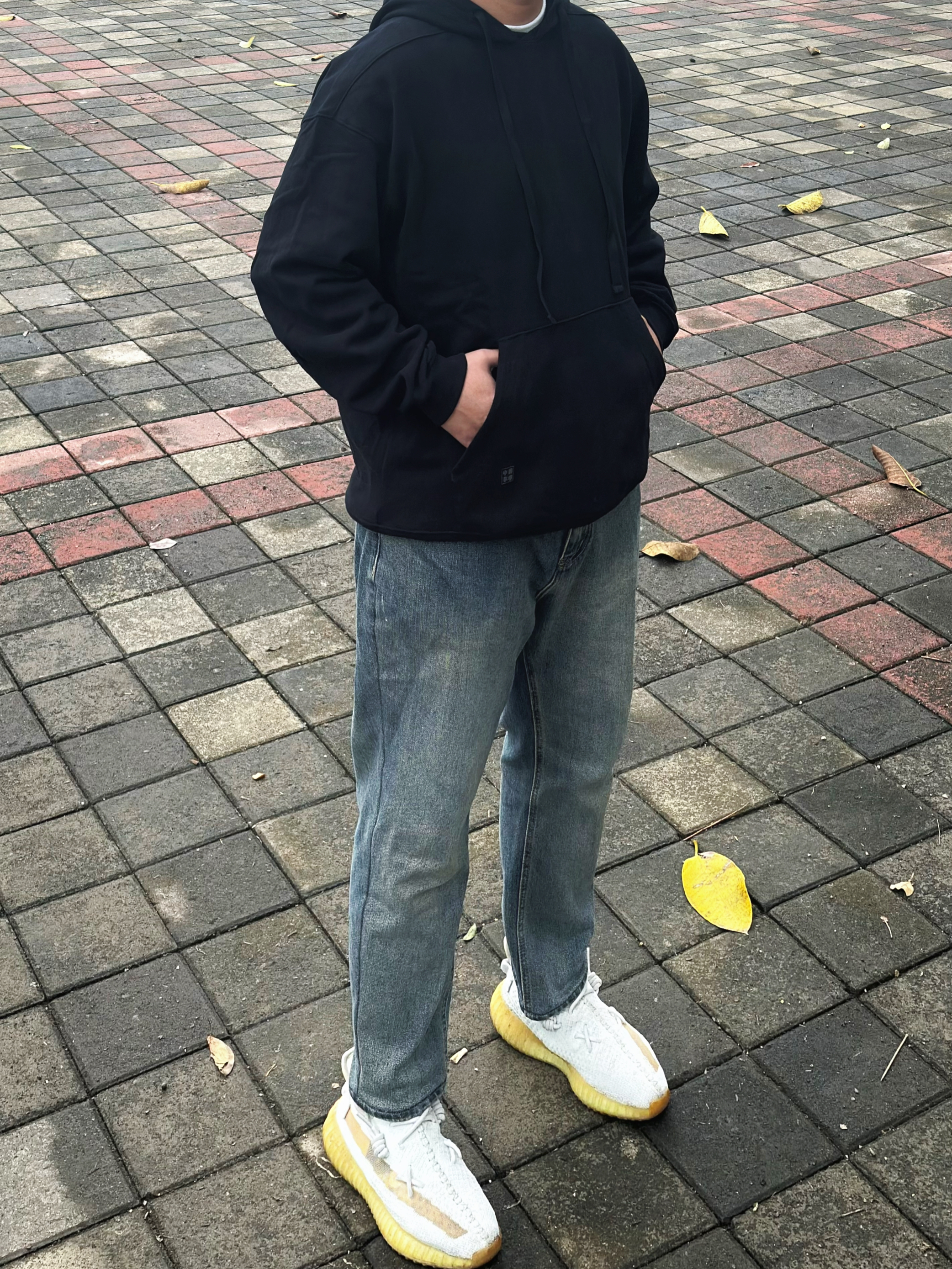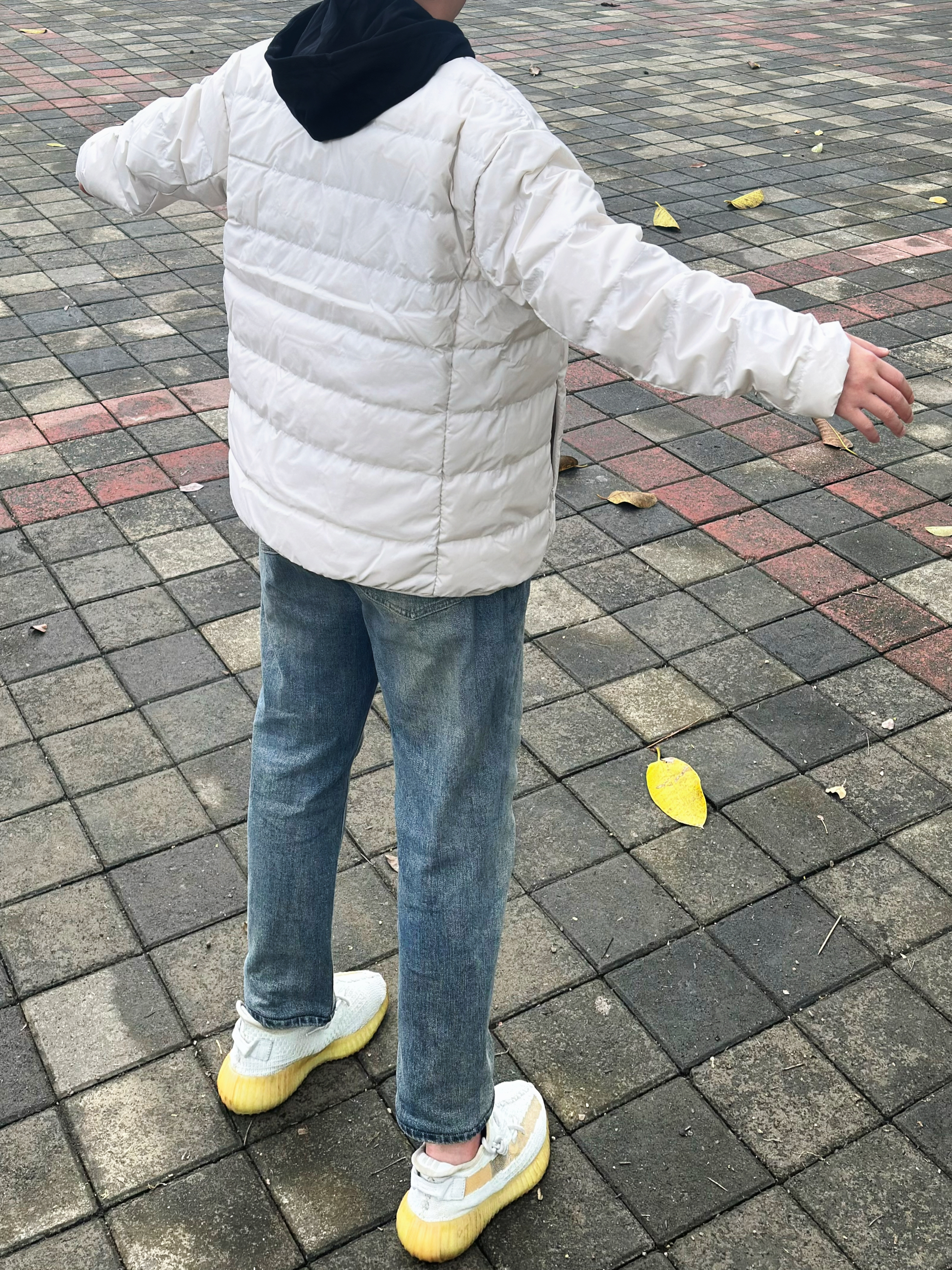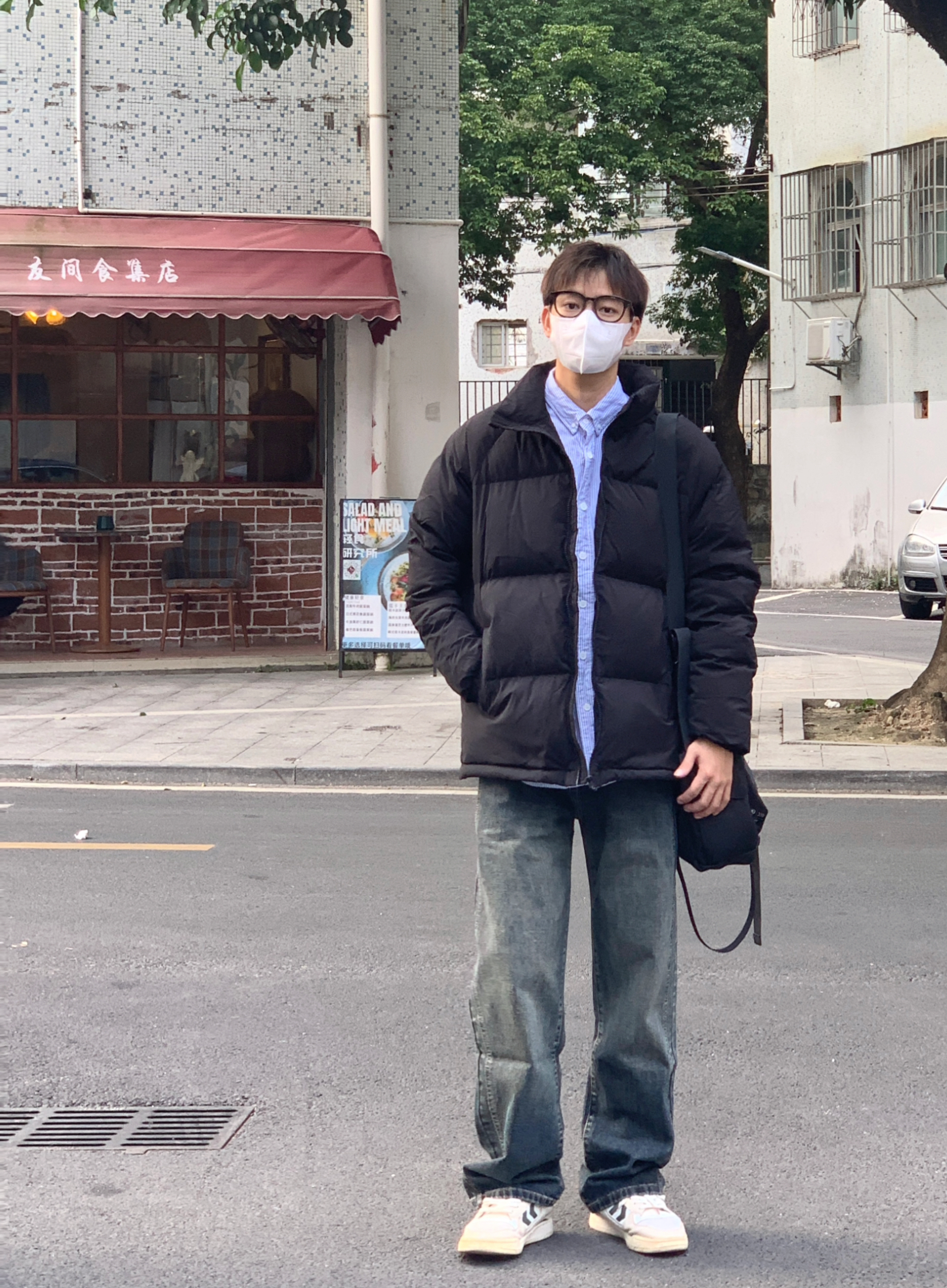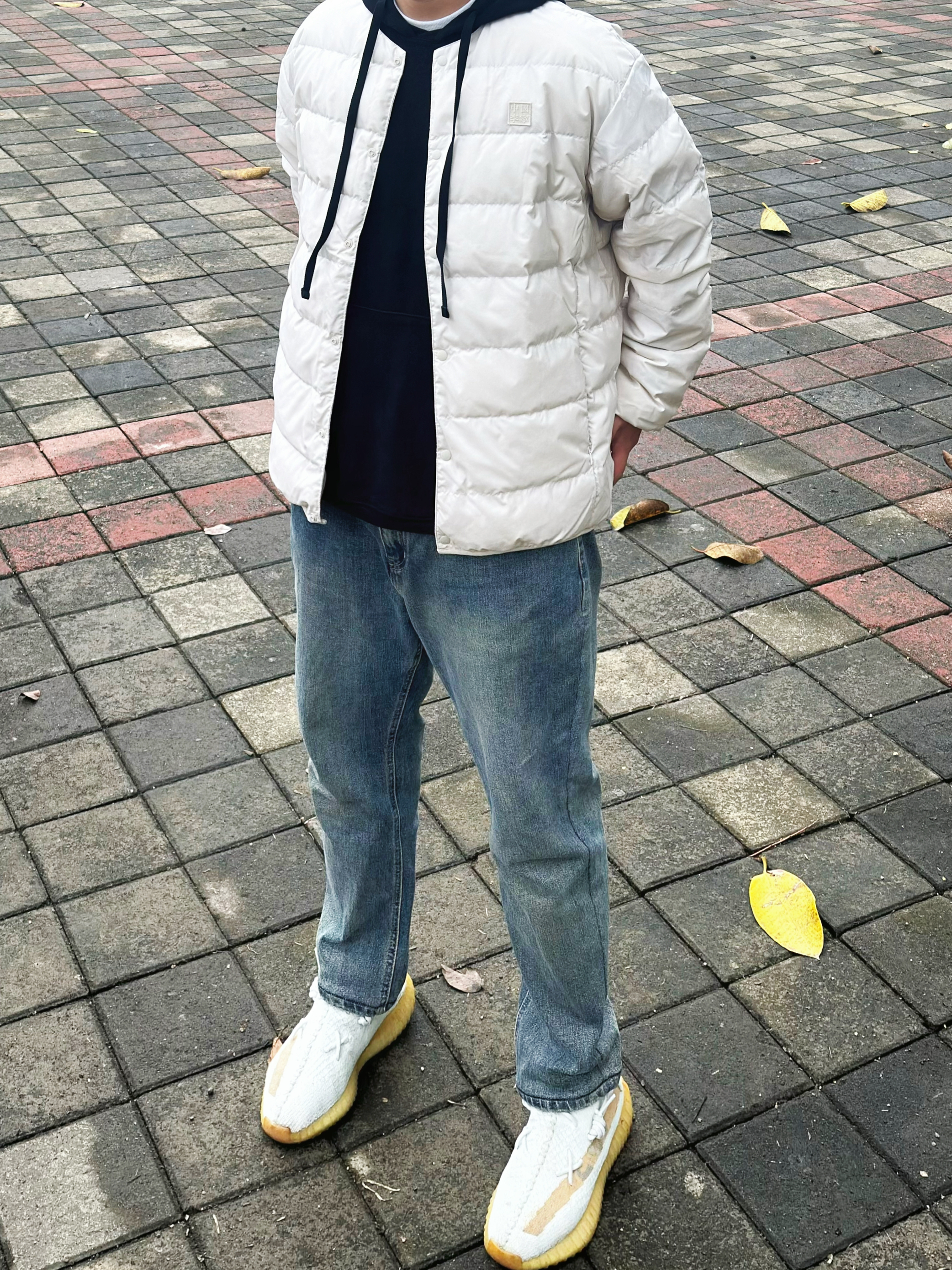 👔 上身一件中国李宁V领白色羽绒服 宽松版型 绒子含量有90% 暖和又蓬松 内里叠穿件黑色卫衣帽衫 更有层次感 👖 搭配一条直筒复古牛仔裤 秒变大长腿 版型宽松不挑身材 ☑️ 身高丨体重丨尺码 : 178丨90kg丨XL