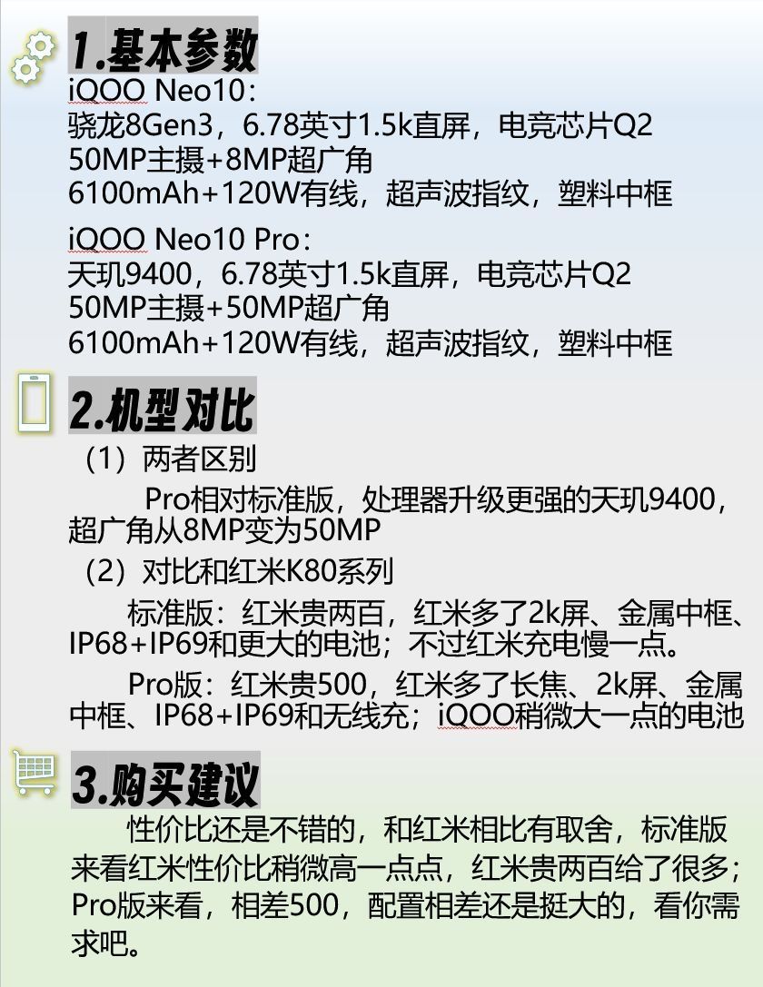 1.基本参数 iOOO Neo10: 骁龙8Gen3,6.78英寸1.5k直屏,电竞芯片Q2 50MP主摄+8MP超广角 6100mAh+120W有线,超声波指纹,塑料中框 iQOO Neo10 Pro: 天玑9400,6.78英寸1.5k直屏,电竞芯片Q2 50MP主摄+50MP超广角 6100mAh+120W有线,超声波指纹,塑料中框 2.机型对比 (1) 两者区别 Pro相对标准版,处理...