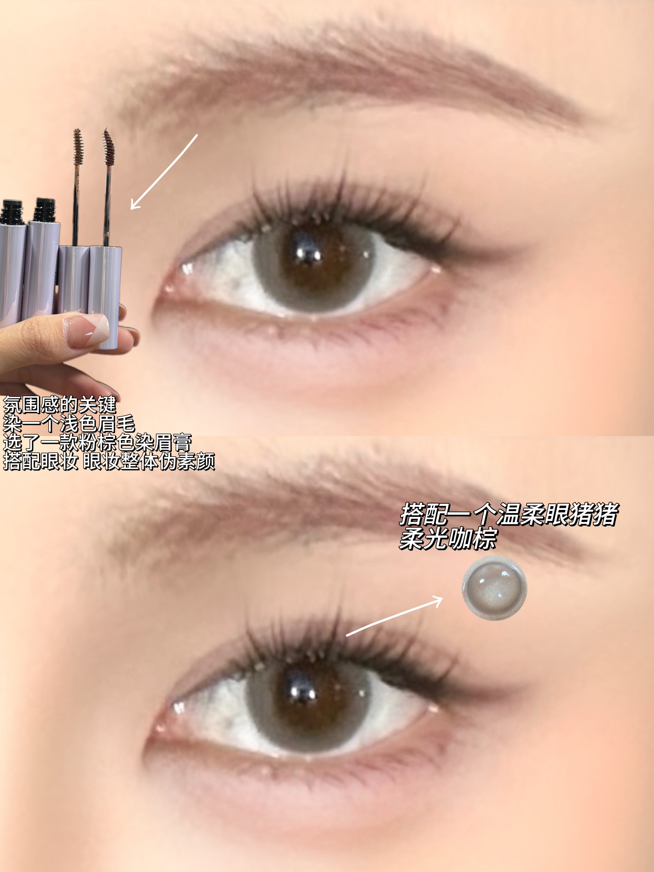 露丝的妆容真的很温柔 今天搭配一个粉棕色染眉膏 眼妆是温柔的粉嫩蜜桃色系 整个眼妆非常柔和 搭配一款眼猪猪完成