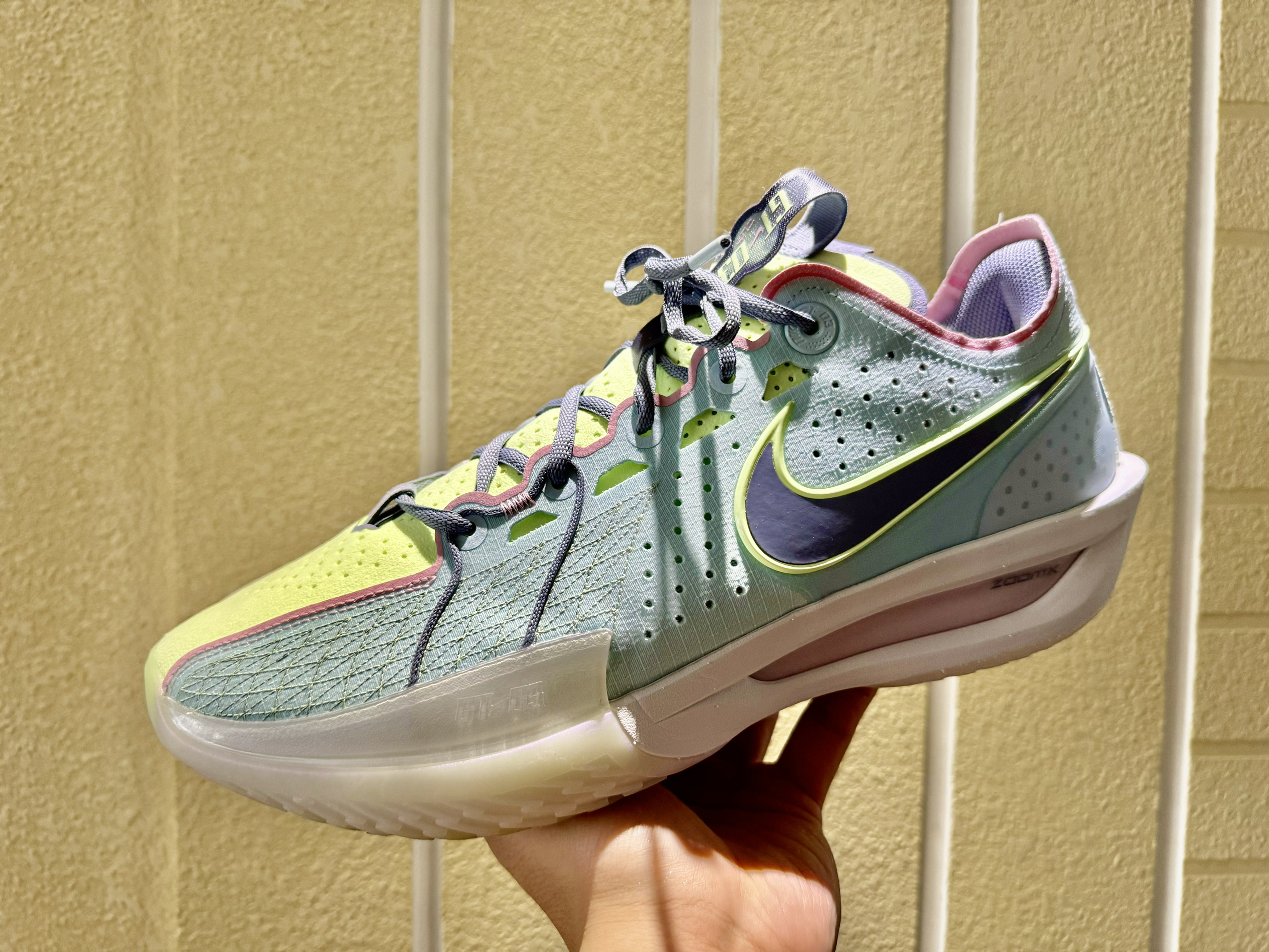 马卡龙配色充满夏季元素,200mx气垫提供了良好的脚感,个人在穿着打球时感觉重心略高,防侧翻性能一般,鞋楦较宽,适合宽脚,我是瘦脚型,未穿着精英袜时,鞋内空间会有余量,球鞋整体做工较廉价,个人认为不如前两代gt系列篮球鞋,希望nike可以在 4代中,予以改进