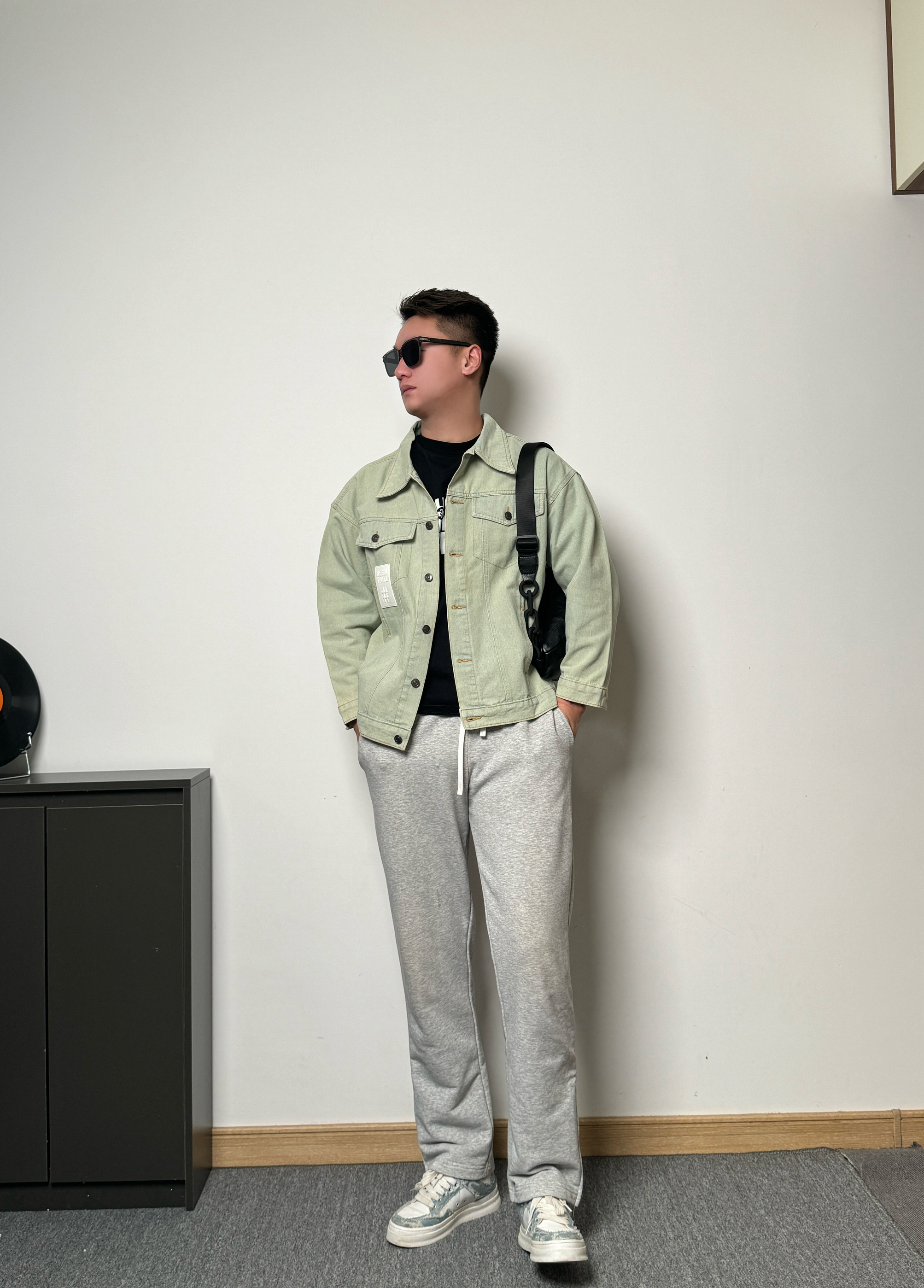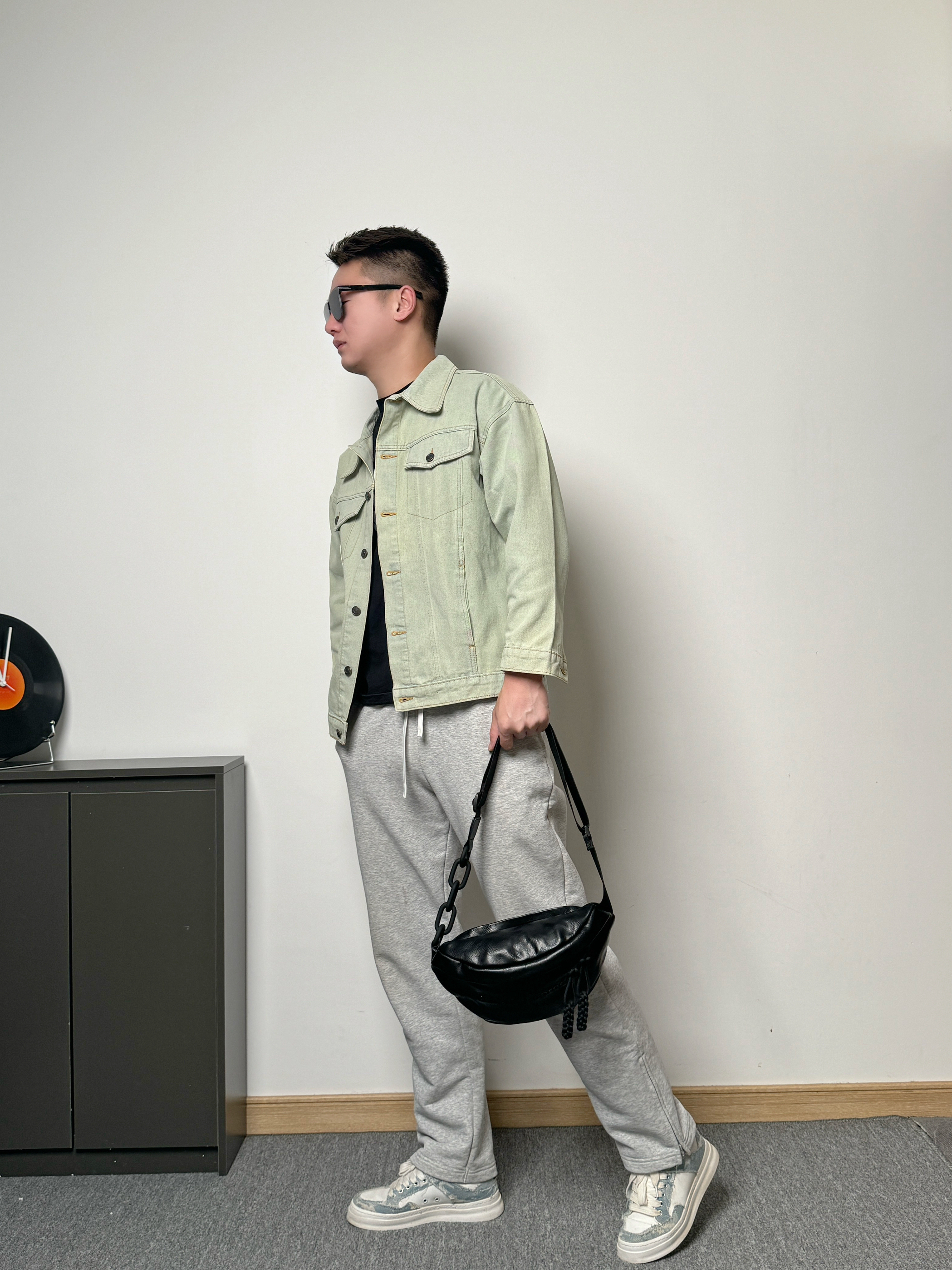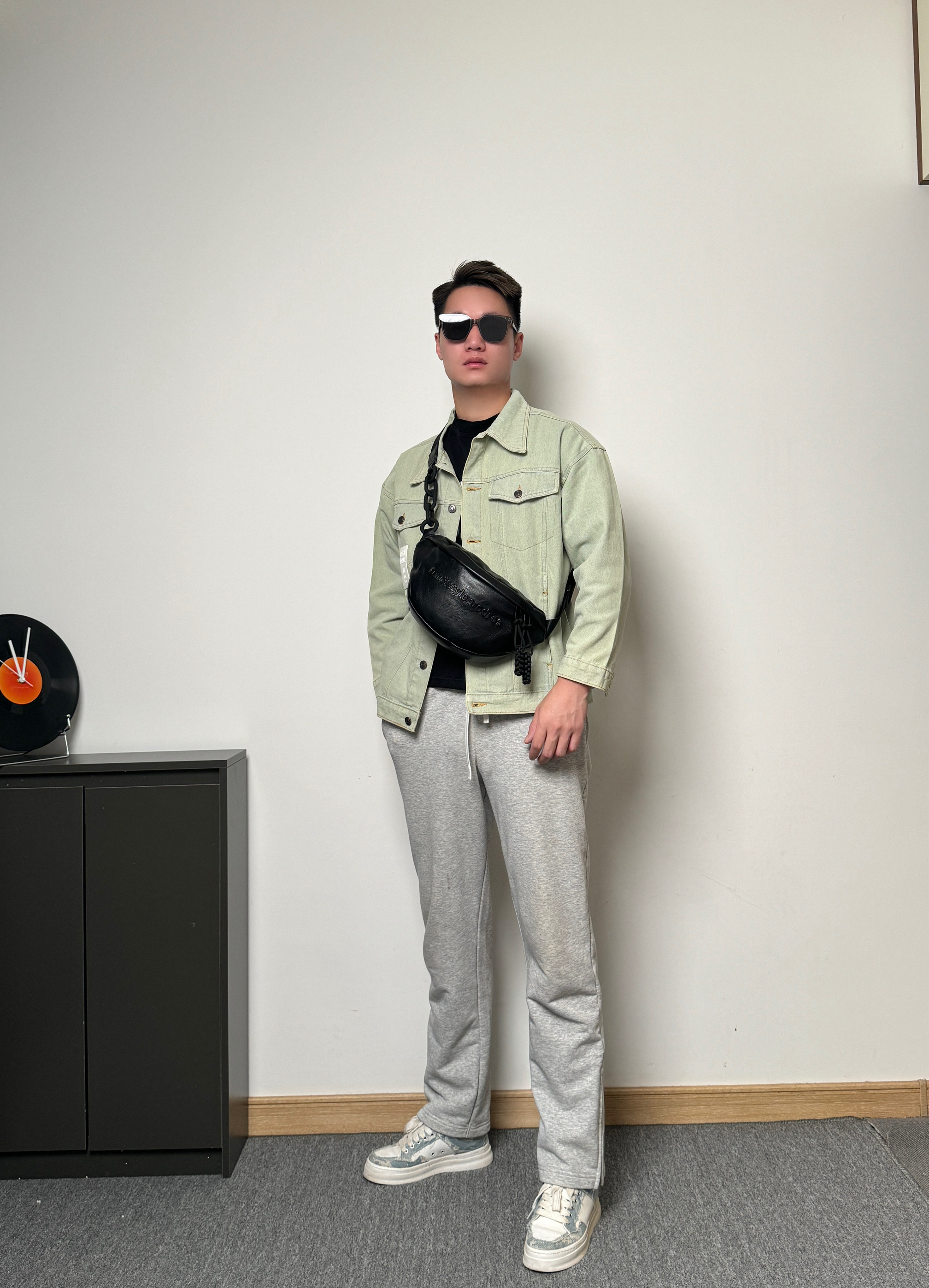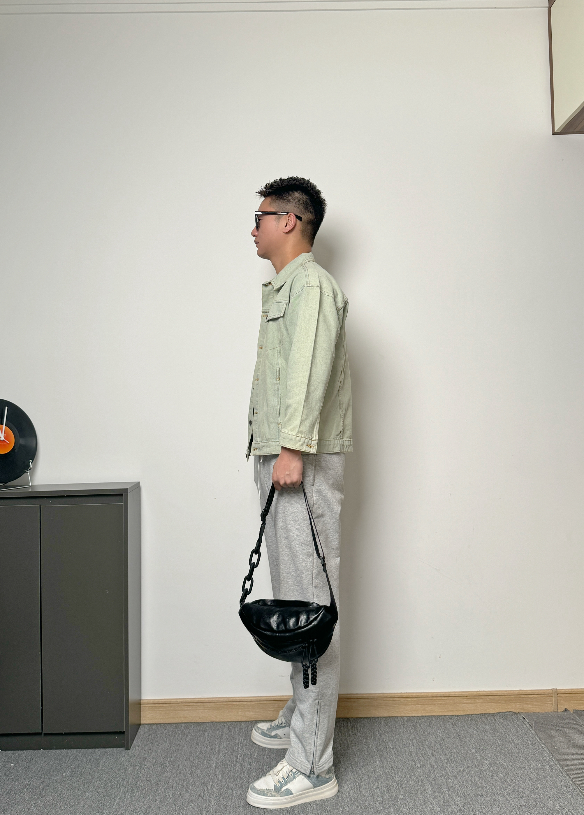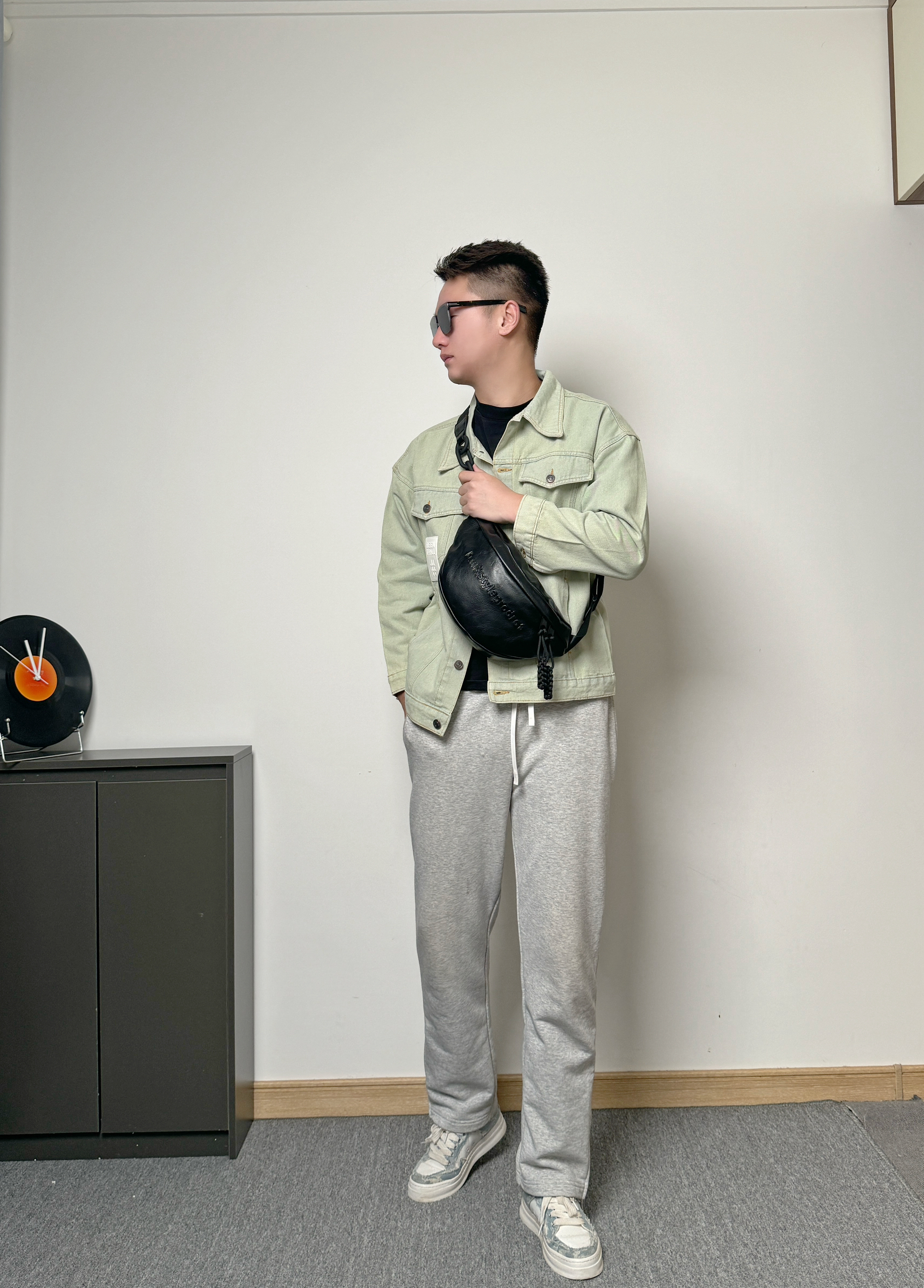 男生不仅要穿的帅气,背的包包也要酷! V 上身来淡绿色夹克 下身来条灰色运动裤,通勤又百搭! 包包是 白帆布大师 MASTER CANVAS 家的一款斜挎包!经典黑色真的可以跟我衣柜里的大部分衣服相契合,而且皮质超好,细腻有光泽,还特别好打理哦!日常背它真的好酷!肩带加宽不会勒肩膀,时尚又百搭,真的太喜欢了!