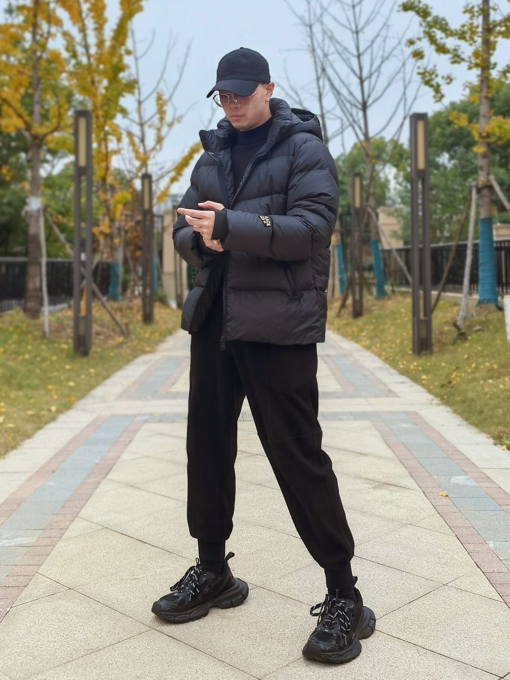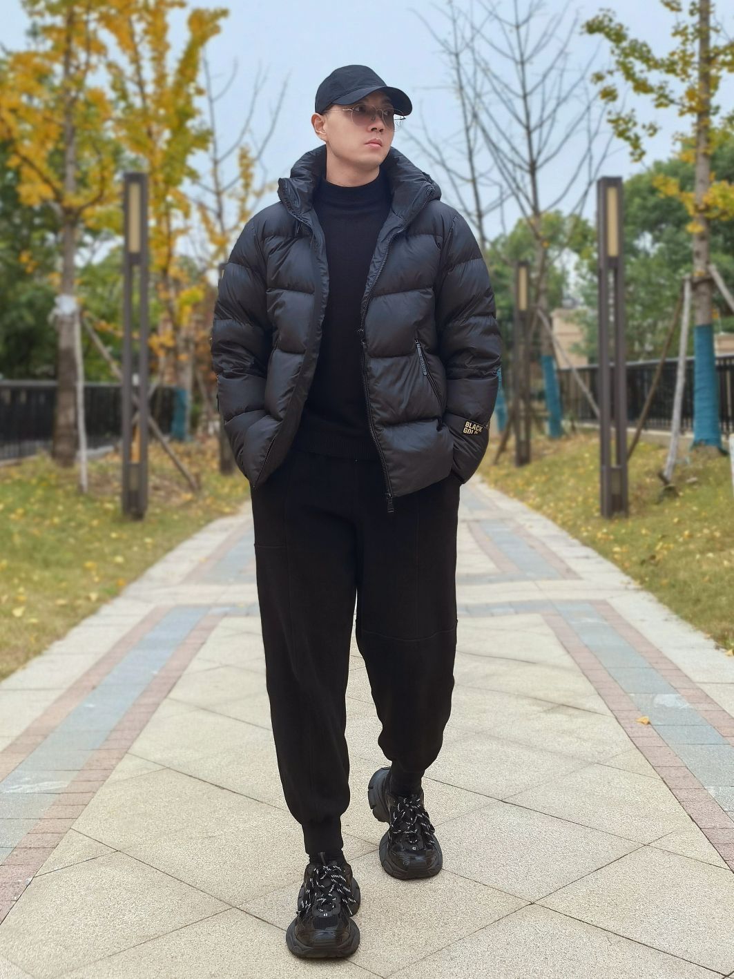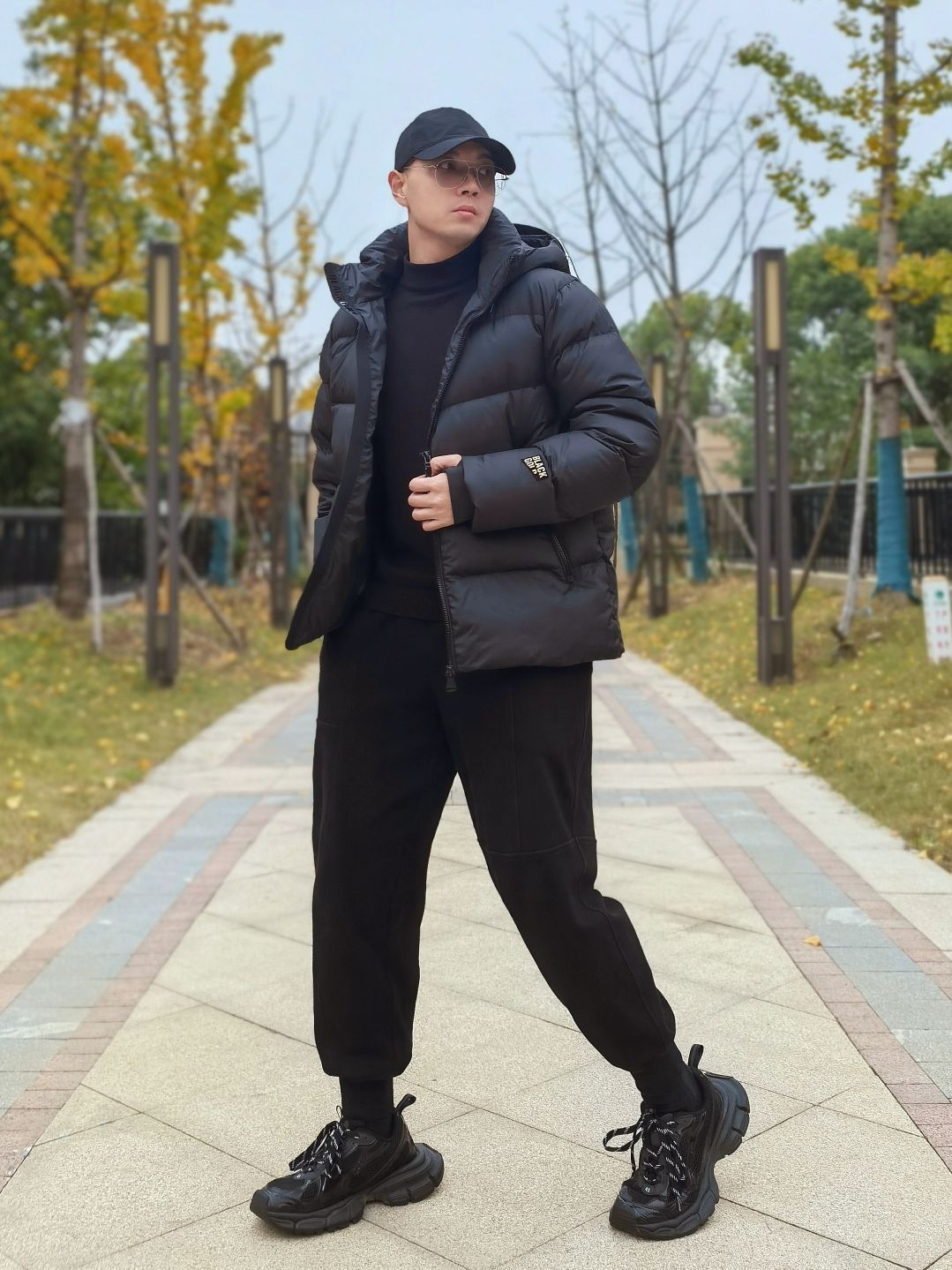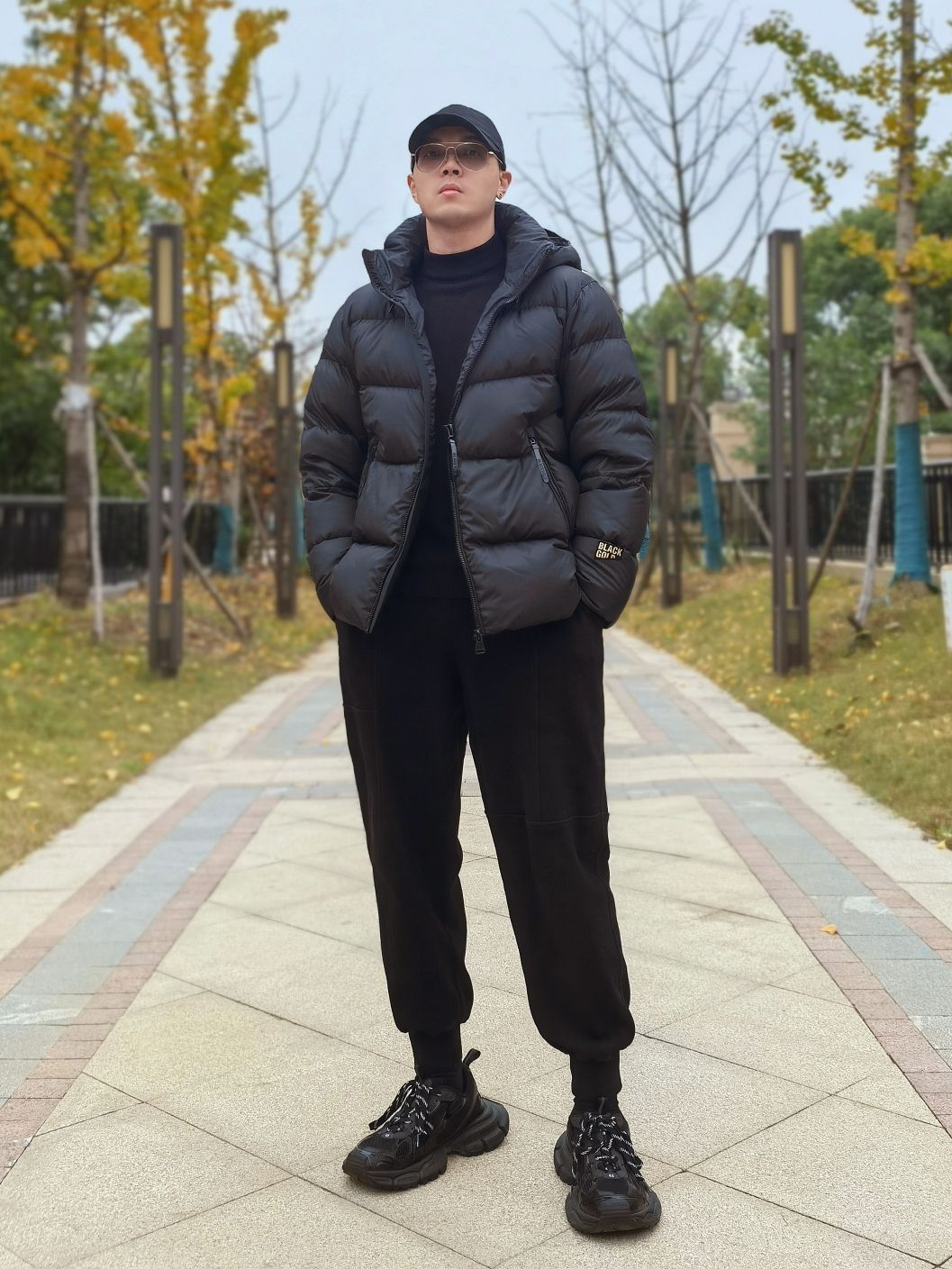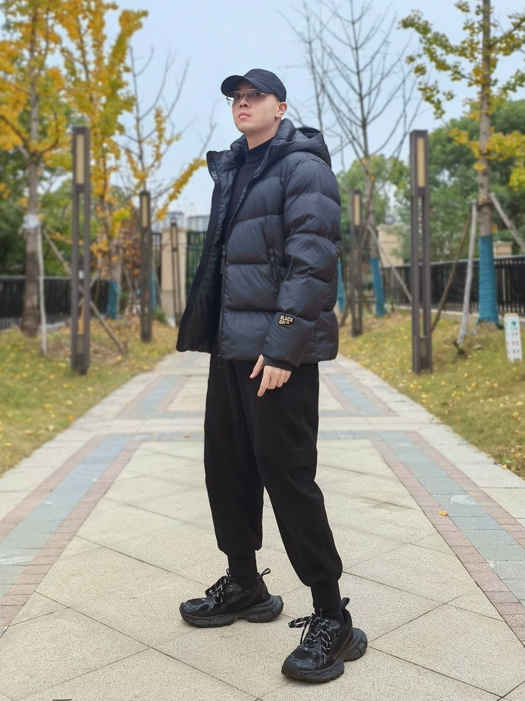 hello 大家好,这里是撒旦锅锅 💜179cm/80kg 🌞今日穿搭为运动休闲风格 搭配类型:羽绒服+运动裤+老爹鞋 羽绒服买过很多件了,这次入手的高梵黑金鹅绒服很惊喜,保暖性很高,黑色经典百搭, 下身搭配一条黑色运动裤,最后搭配一双黑色巴黎世家3xl老爹鞋,整体全黑系穿搭,潮酷风十足,运动休闲风满满✔️
