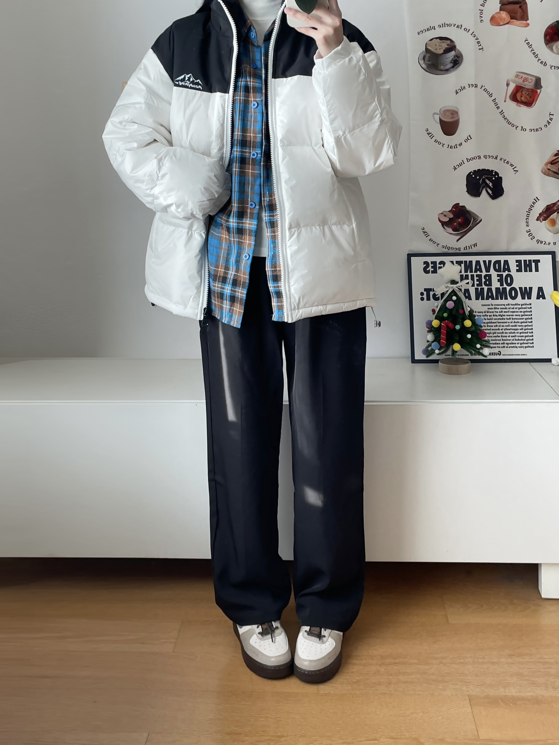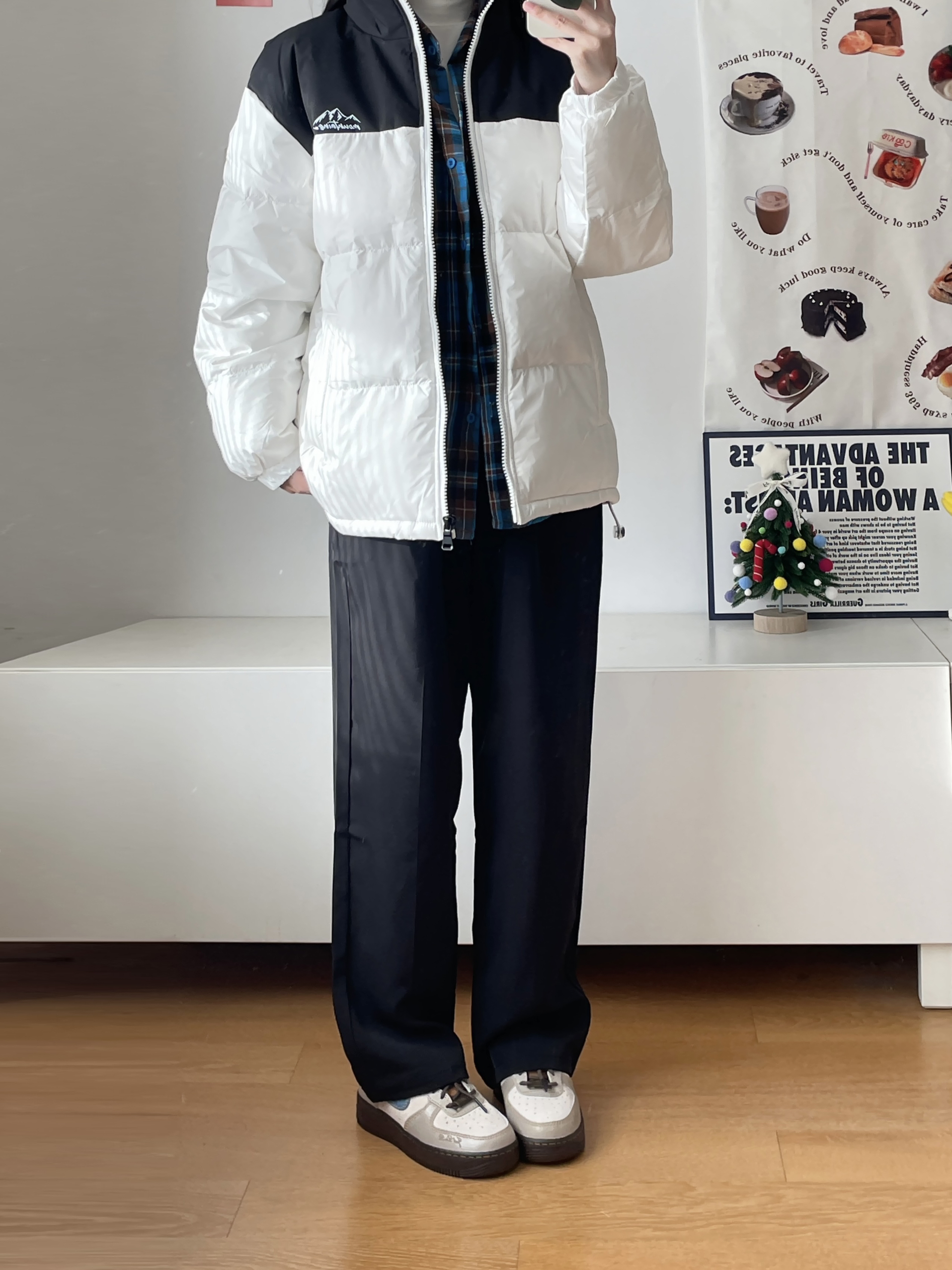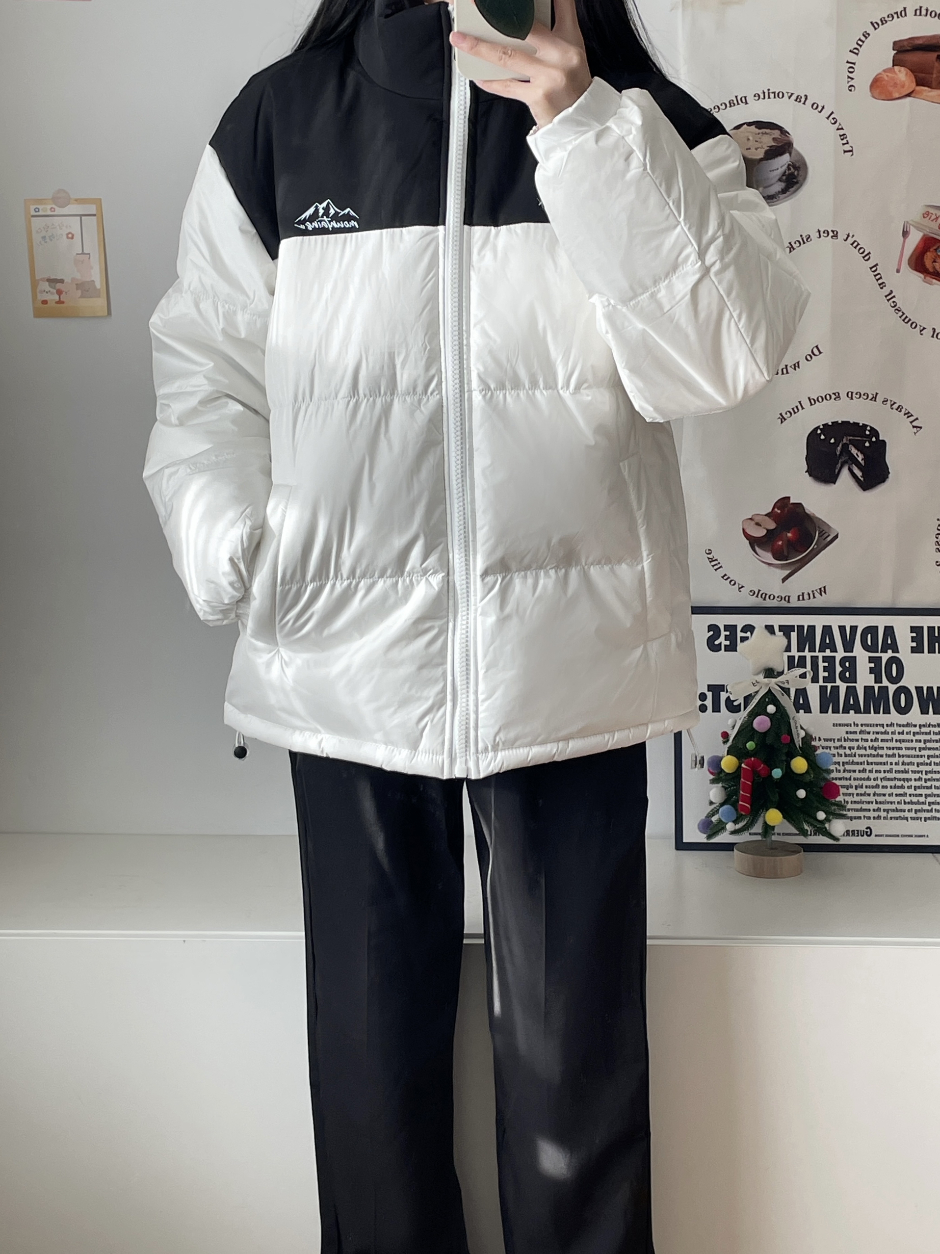 最近爱穿的羽绒服! 简单的黑白拼接 上身好暖和,是那种宽松的版型 是比较好搭配的颜色 叠穿了衬衫和白色长T 嘿嘿又是简单暖和的一套~ 164羽绒服穿的M