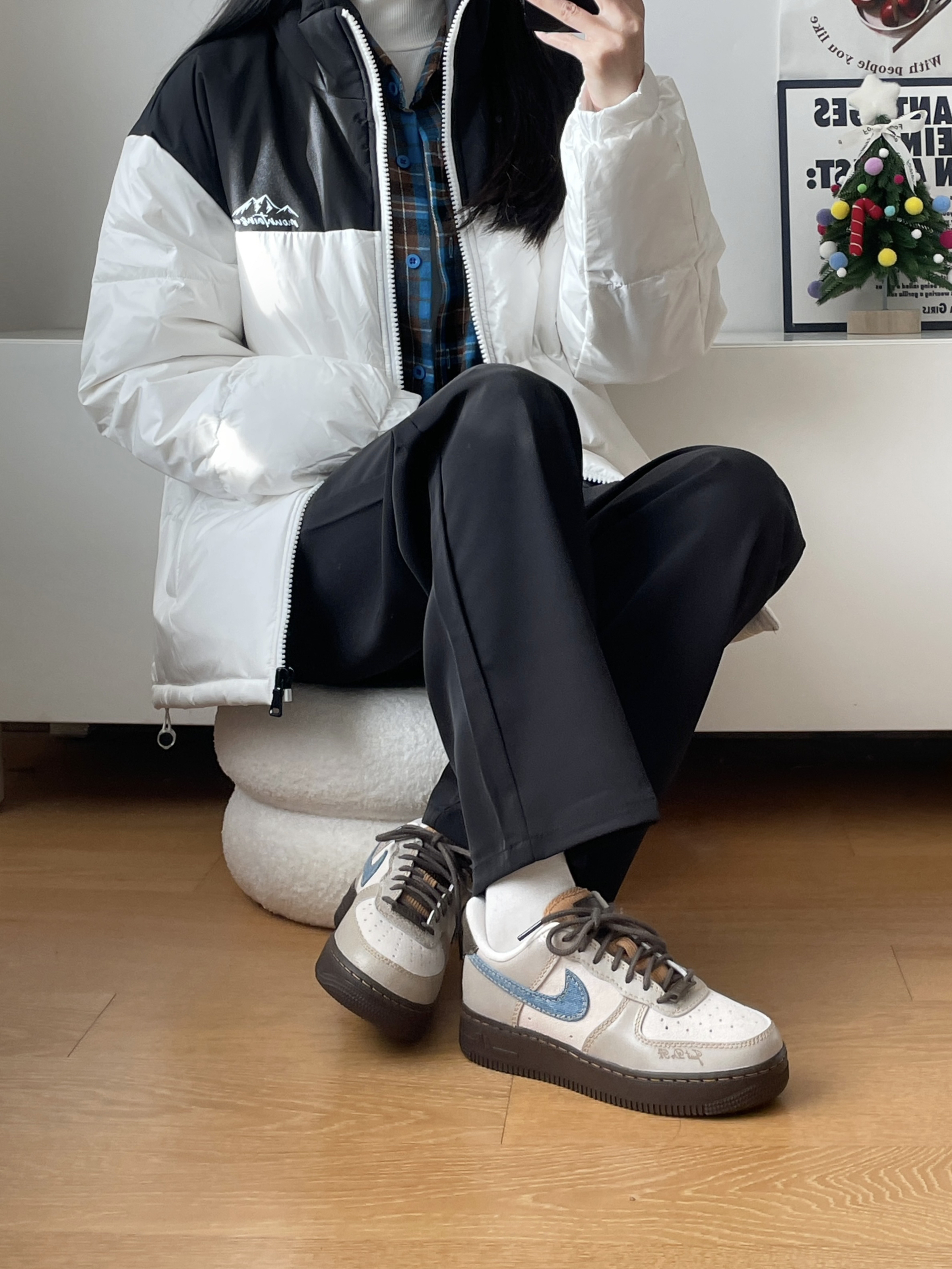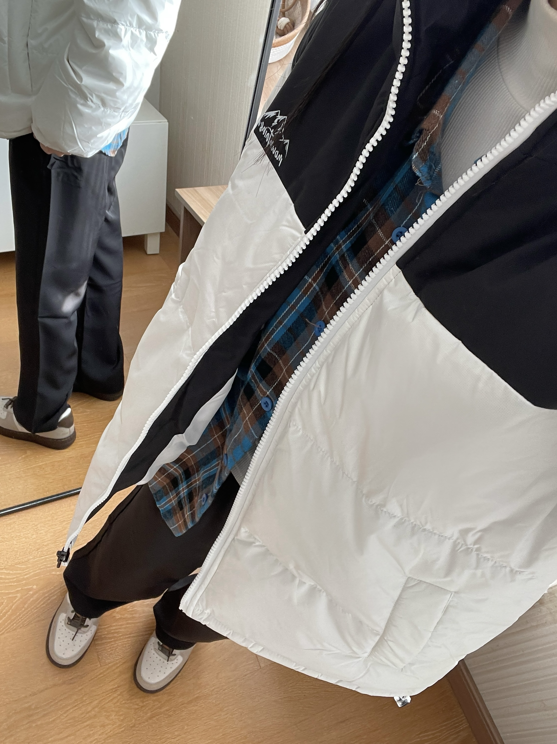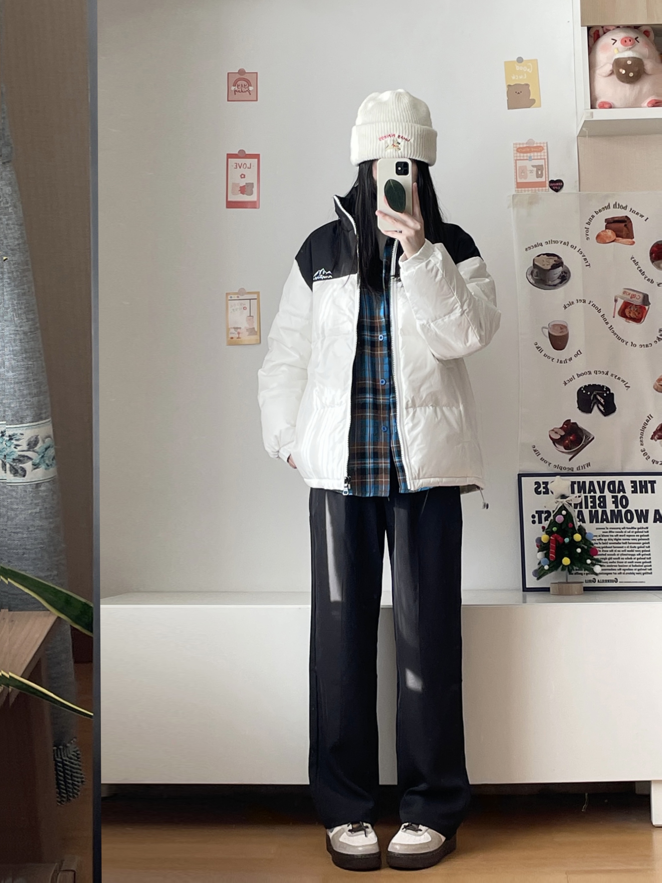 最近爱穿的羽绒服! 简单的黑白拼接 上身好暖和,是那种宽松的版型 是比较好搭配的颜色 叠穿了衬衫和白色长T 嘿嘿又是简单暖和的一套~ 164羽绒服穿的M