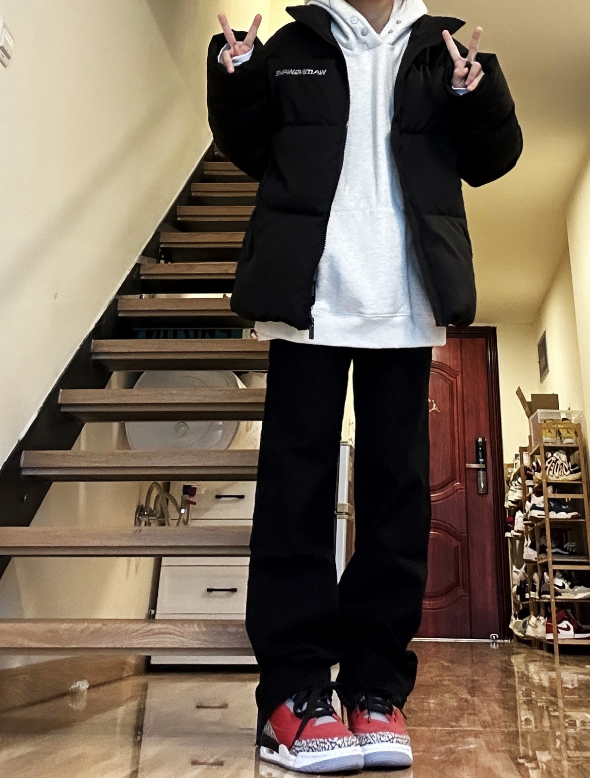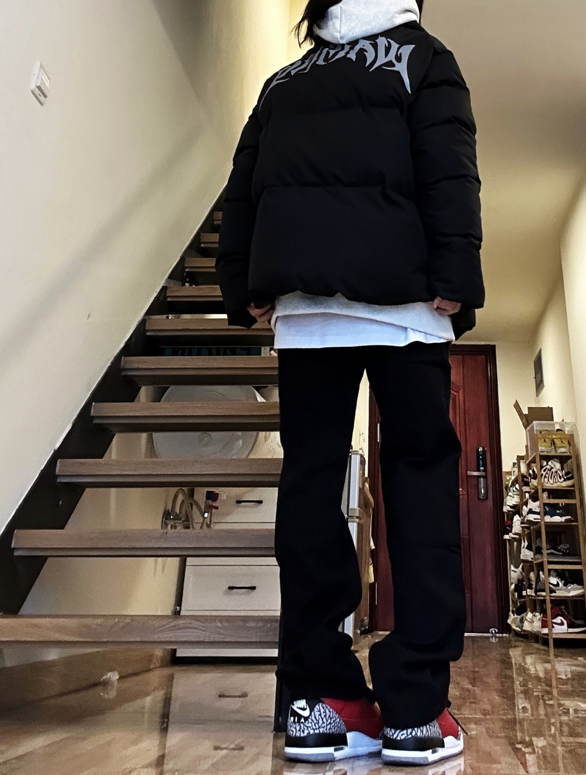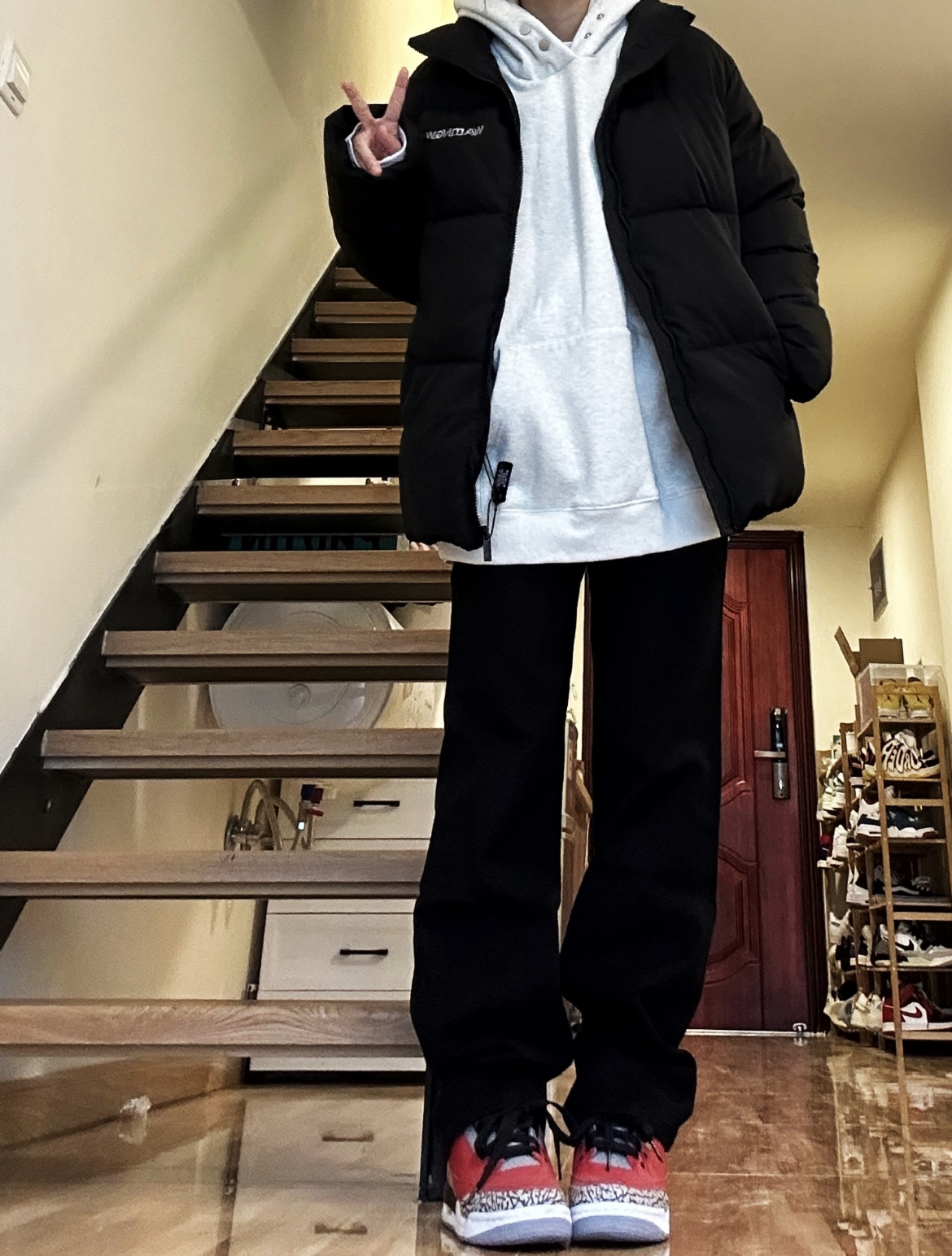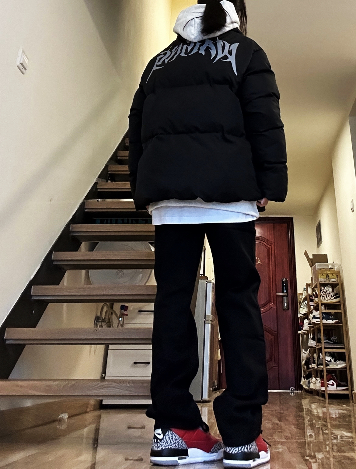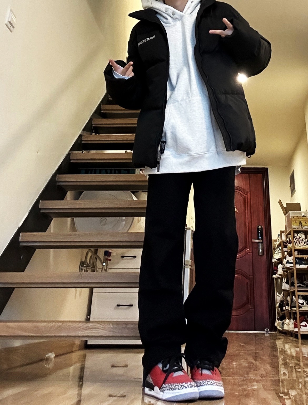 黑色棉服厚实很暖和搭配黑色直筒牛仔裤显瘦又保暖,裤子十分百搭,男女都可以穿