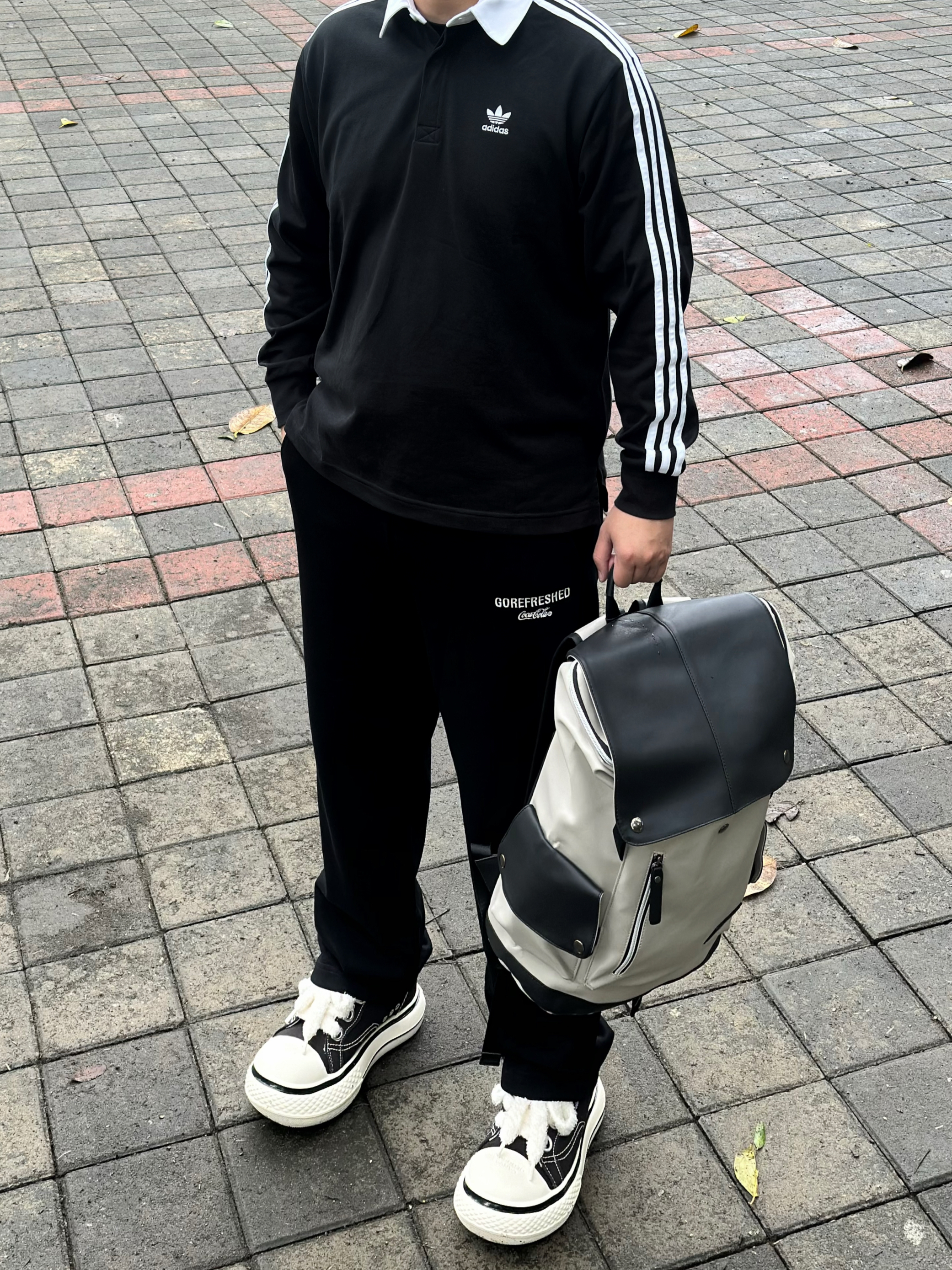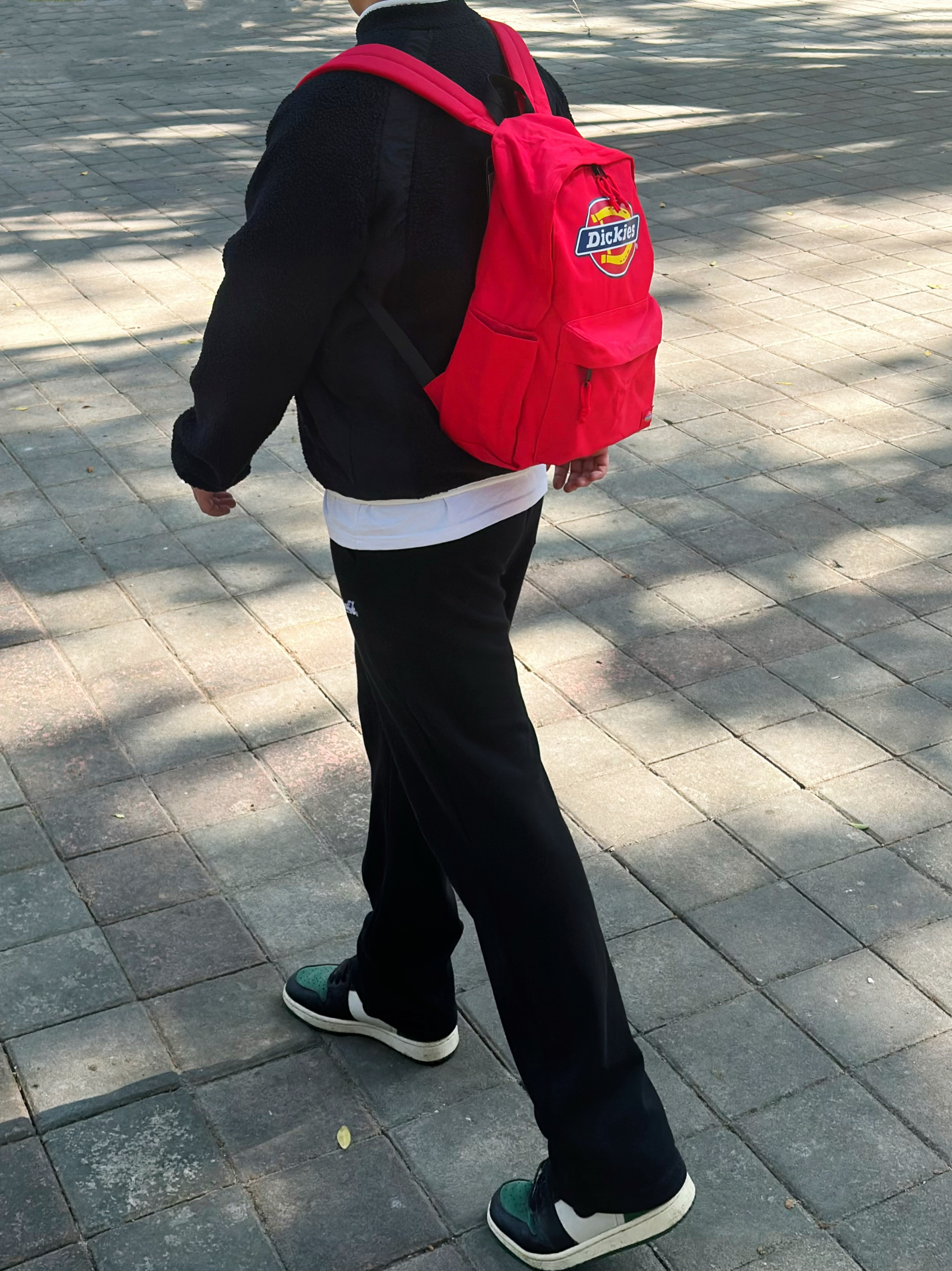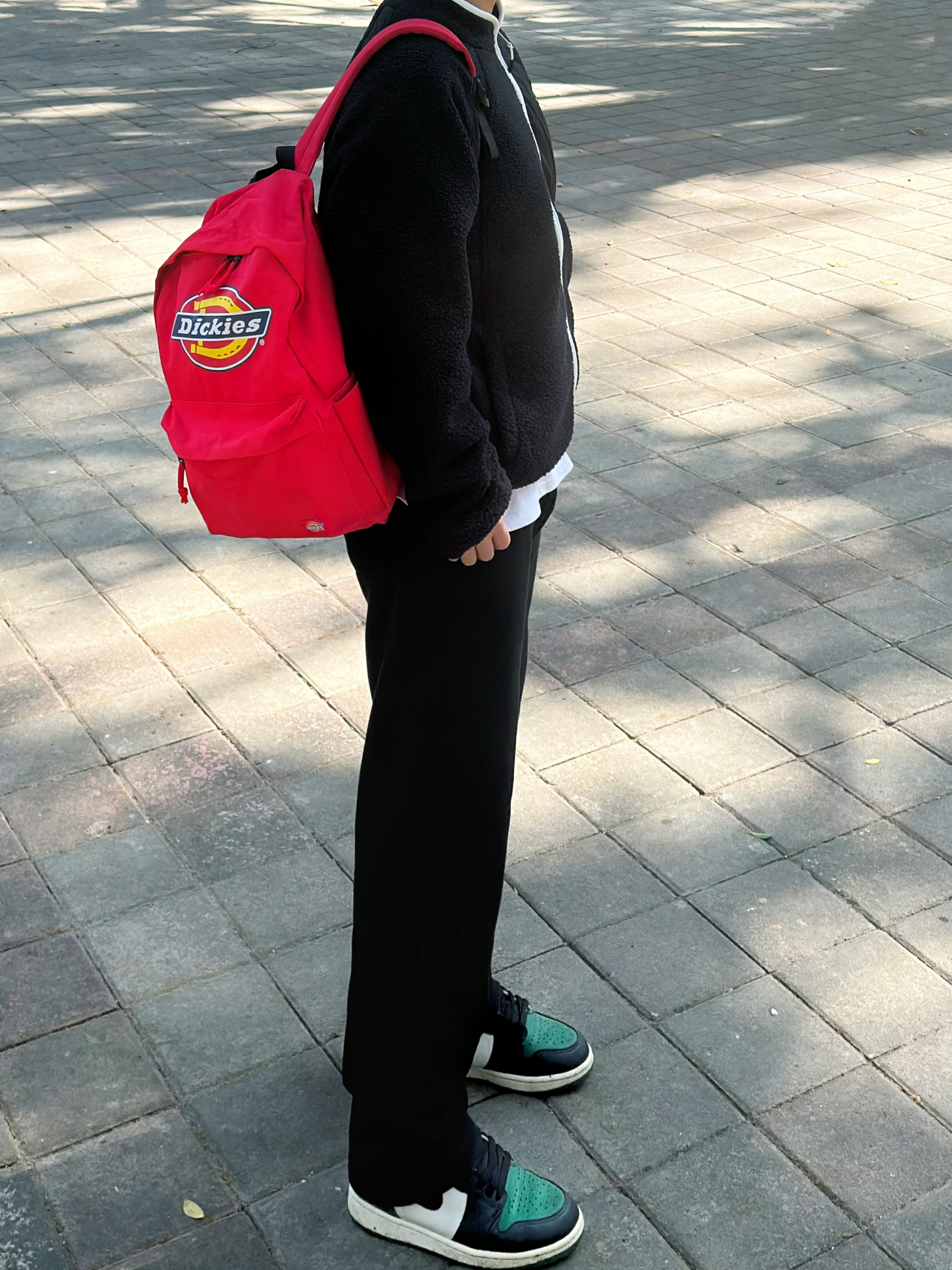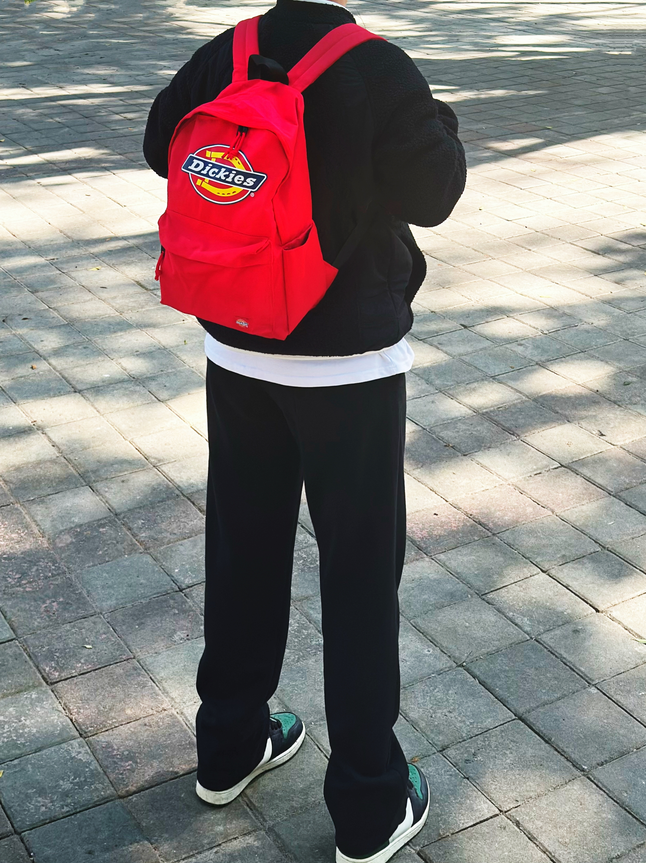 今日份元气满满的少年感穿搭over! 黑色羊羔绒夹克搭配黑色直筒休闲裤 包包是Dickies家的红色大logo双肩包🎒 颜值高 宽肩带不勒肩膀 背上身很舒适 容量很大 口袋也多 完全满足日常出行需求