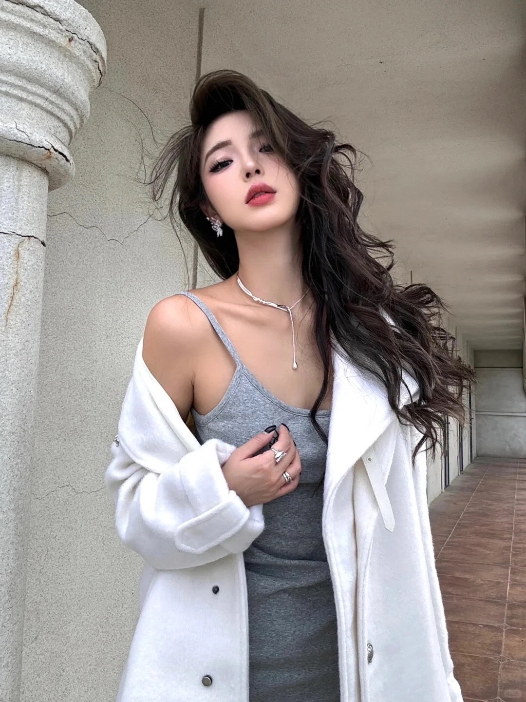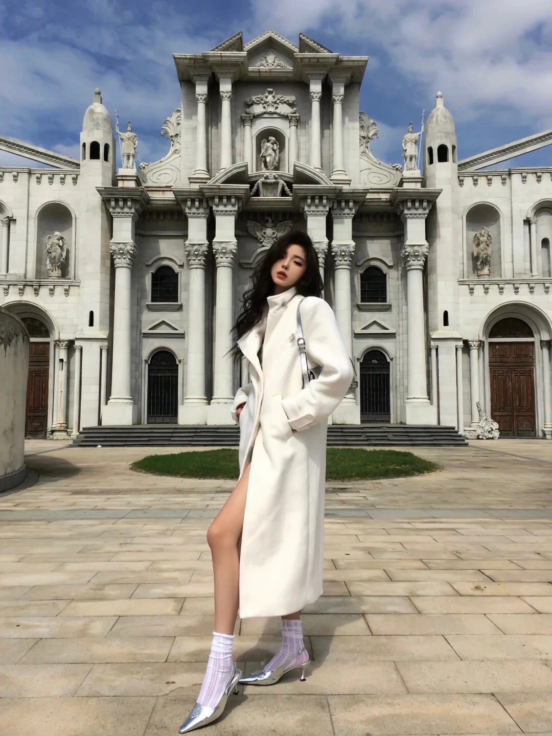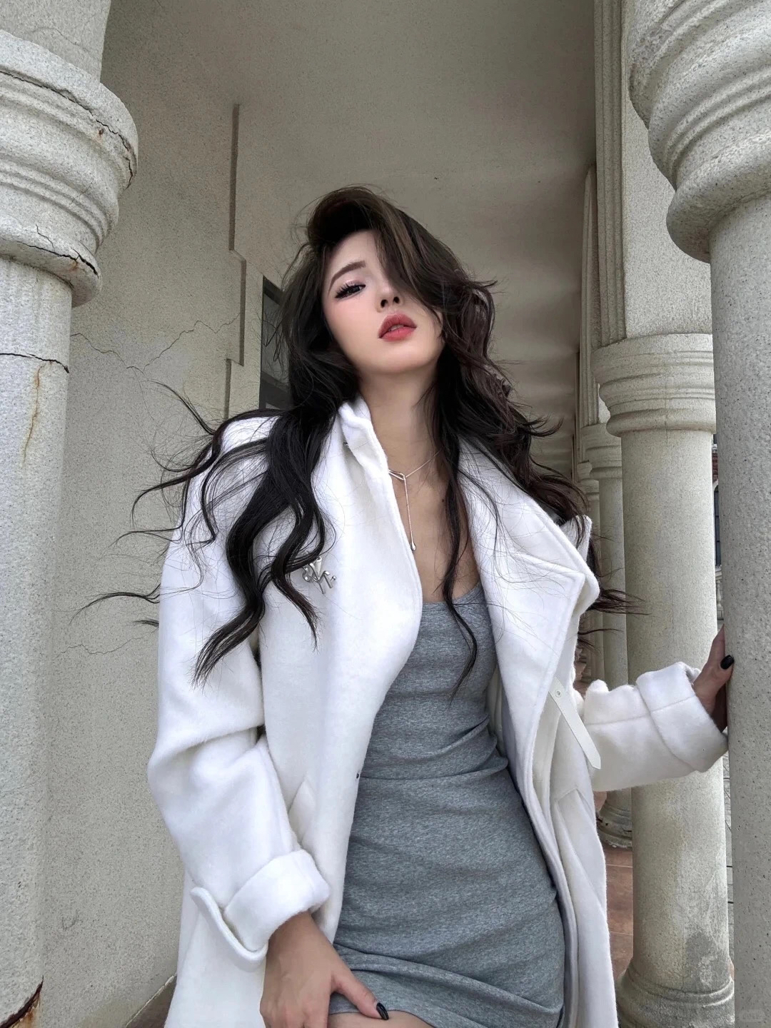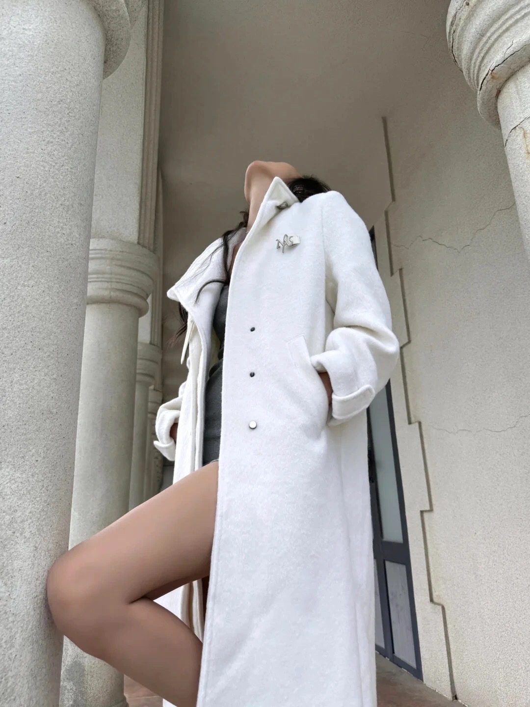 穿搭是拍出大长腿的关键。选择一件灰色紧身连衣裙,既能勾勒出你的身材曲线,又能拉长腿部线条。再搭配一条白色的长外套,既保暖又时尚,还能让你的整体造型更加有层次感。白色高跟鞋则是点睛之笔,不仅能增加身高,还能让你的腿部线条更加修长。记得,外套的长度最好到膝盖上方,这样能更好地展现出你的腿部优势哦!