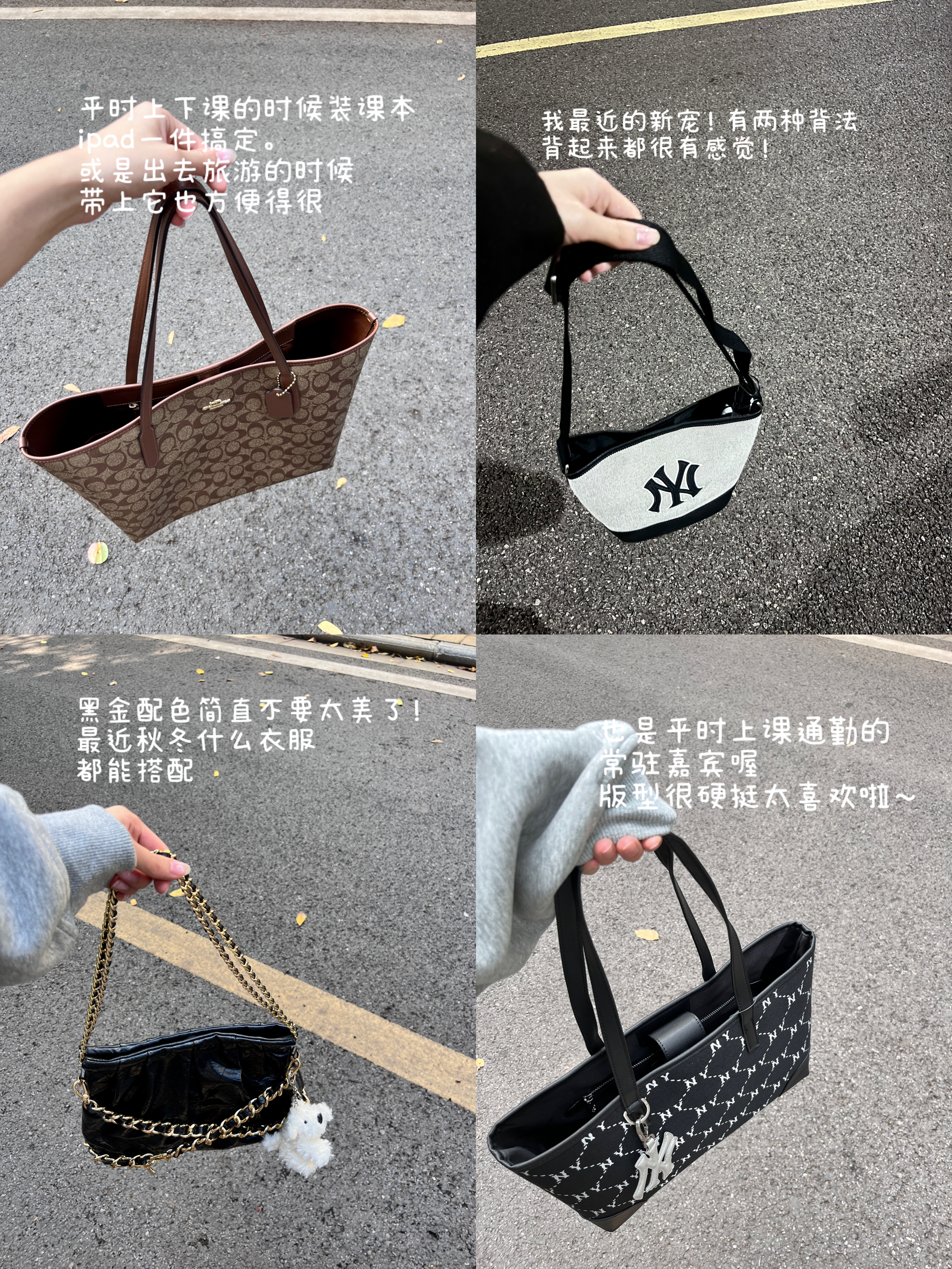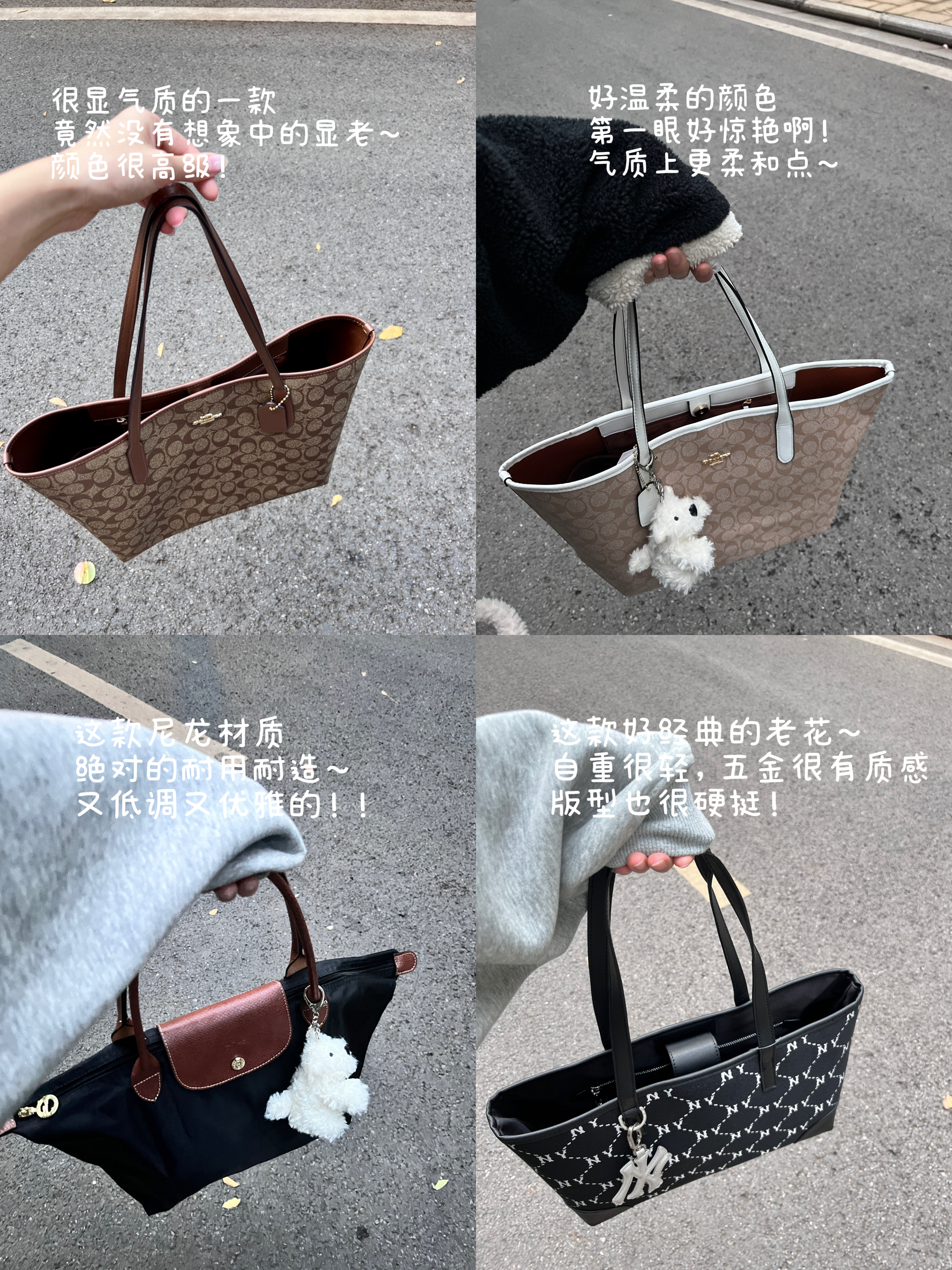 1.coach cally17包包硬挺,包包容量在这几款之中还是比较优秀哒!当时第一眼就把我迷住了!方方正正的包型,大小对于我开始正合适! 2. coach south17非常百搭可爱!放手机化妆品基本ok!看得像个小托特手提,斜挎起来也很方便! 3.rowan18背起来很成熟大气,我觉得是万年不过时的版型,包包的容量算大,连五折的雨伞都可以放进去~ 4.茉莉22在颜色之间纠结了很久,最后选择这个...