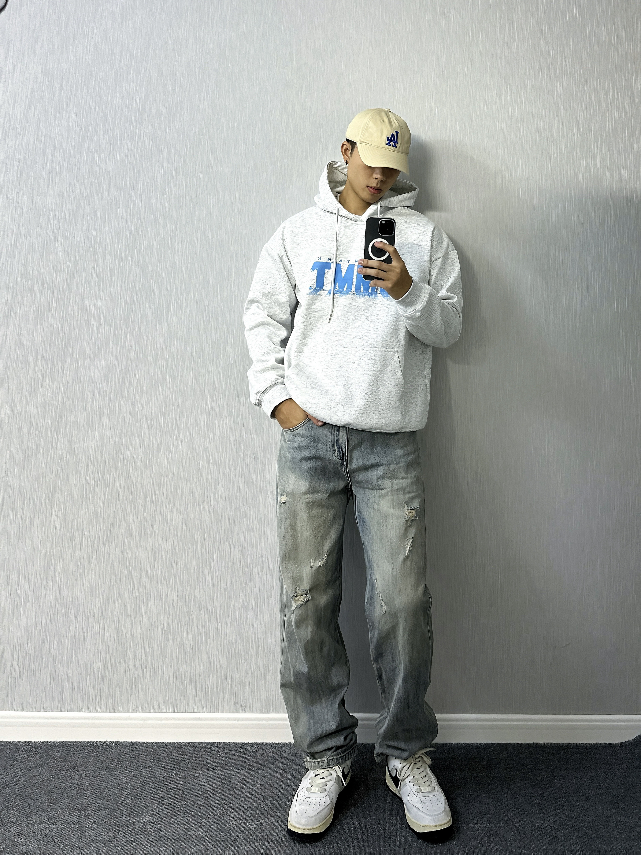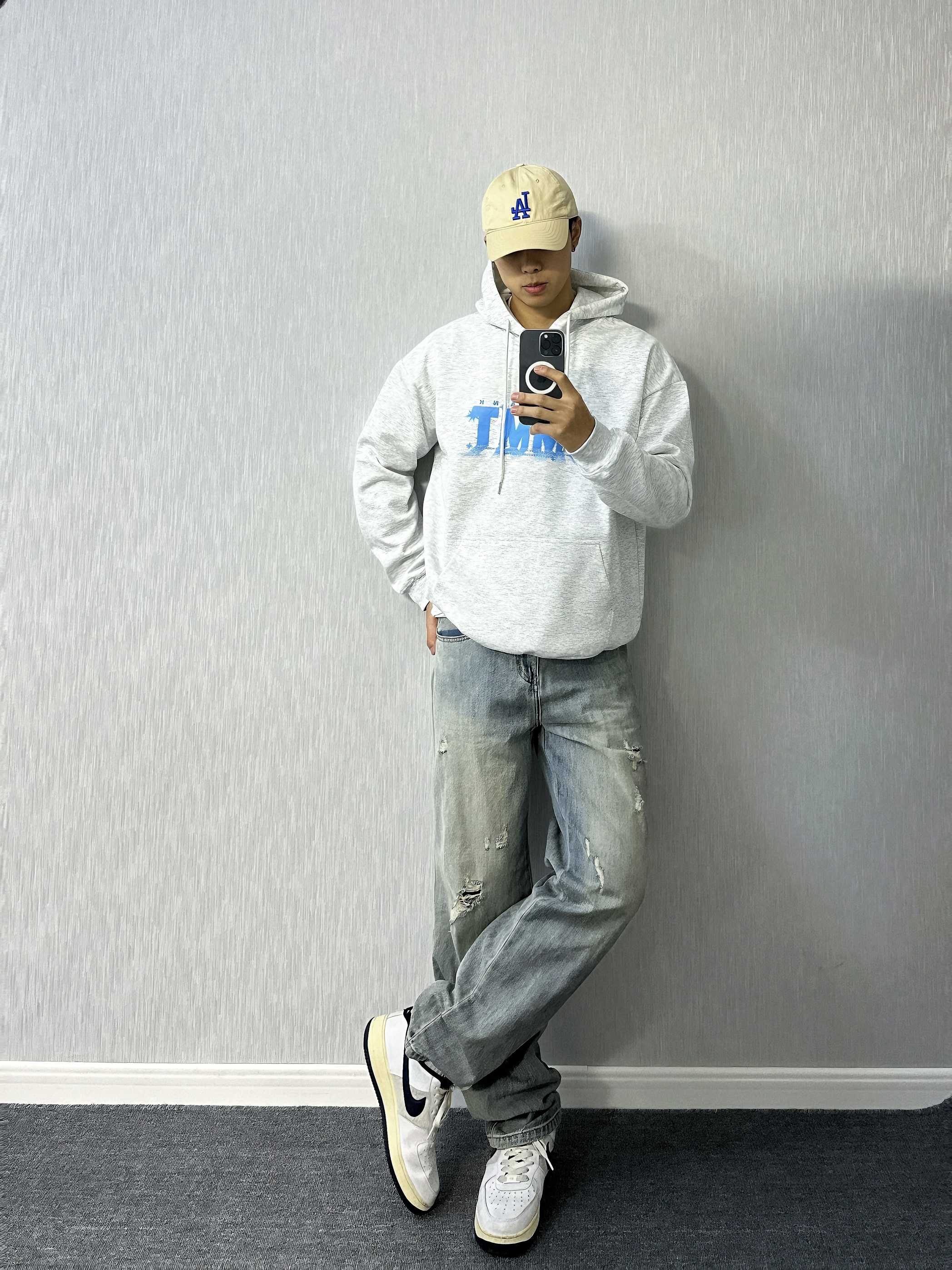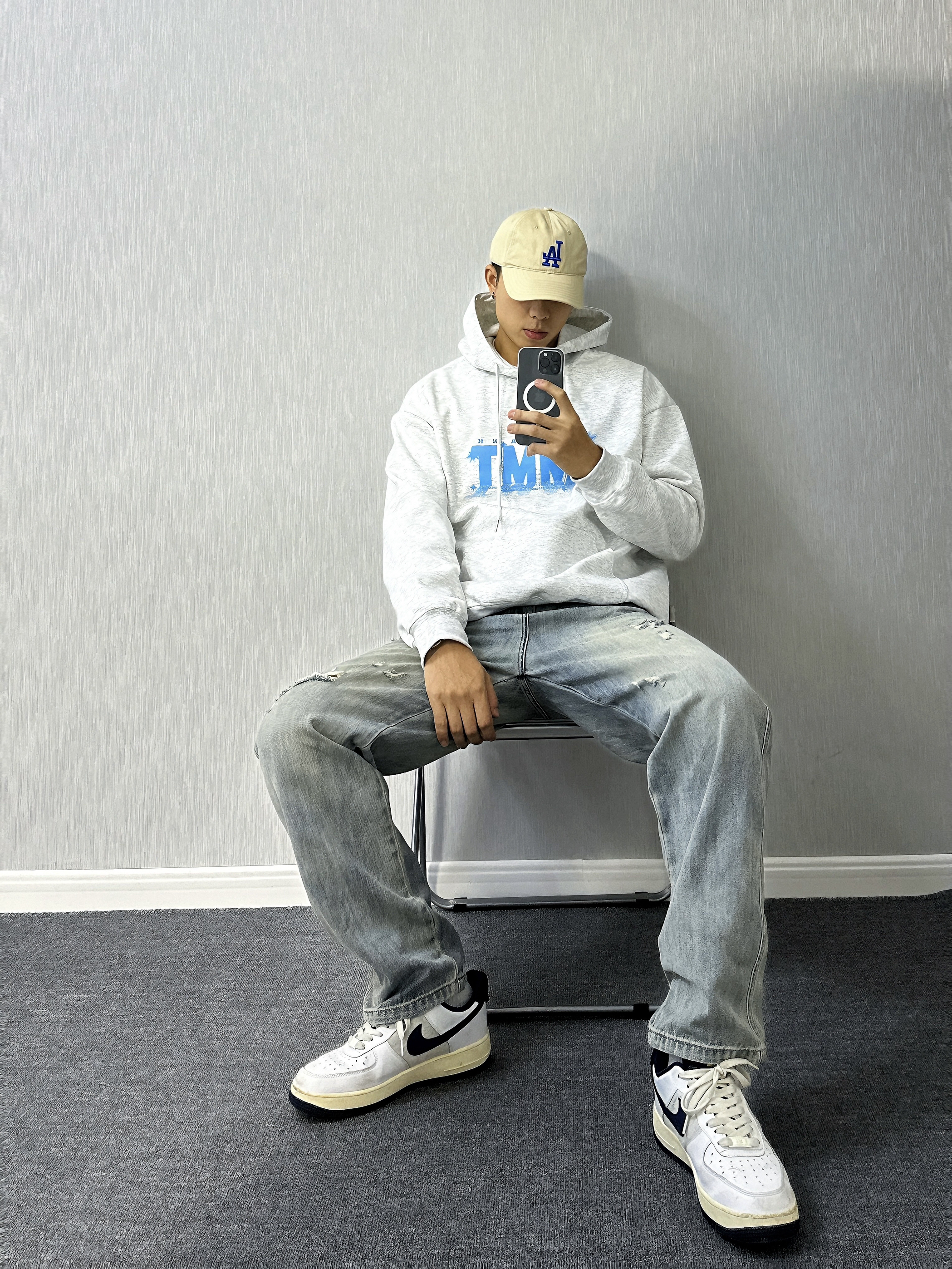🧍♂️ :嗨喽∽ 小羊的秋冬穿搭分享来咯⬇️ 🧢:logo印花杏色鸭舌帽✅ 👔:字母logo印花浅灰色连帽卫衣✅ 👖:做旧直筒牛仔裤✅ 👟:蓝黄色空军一号✅