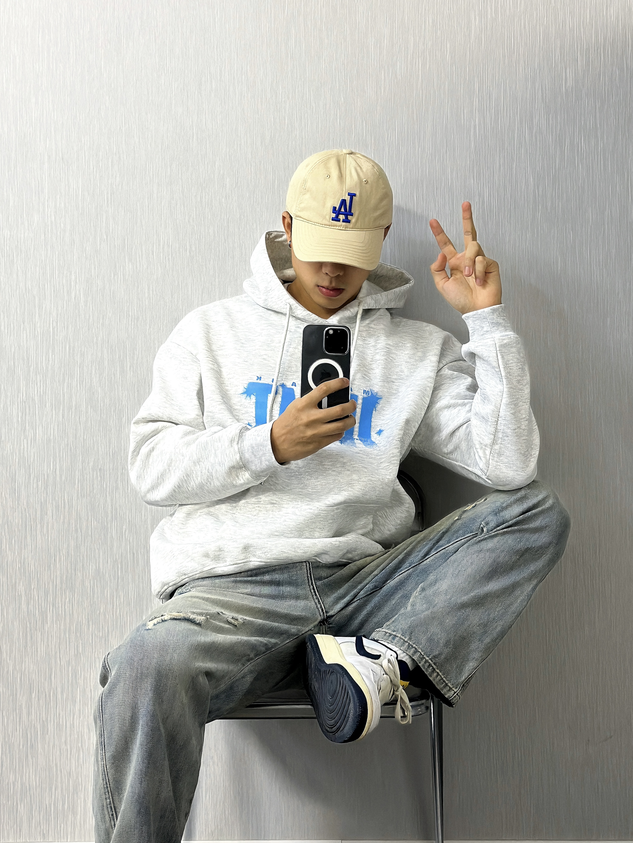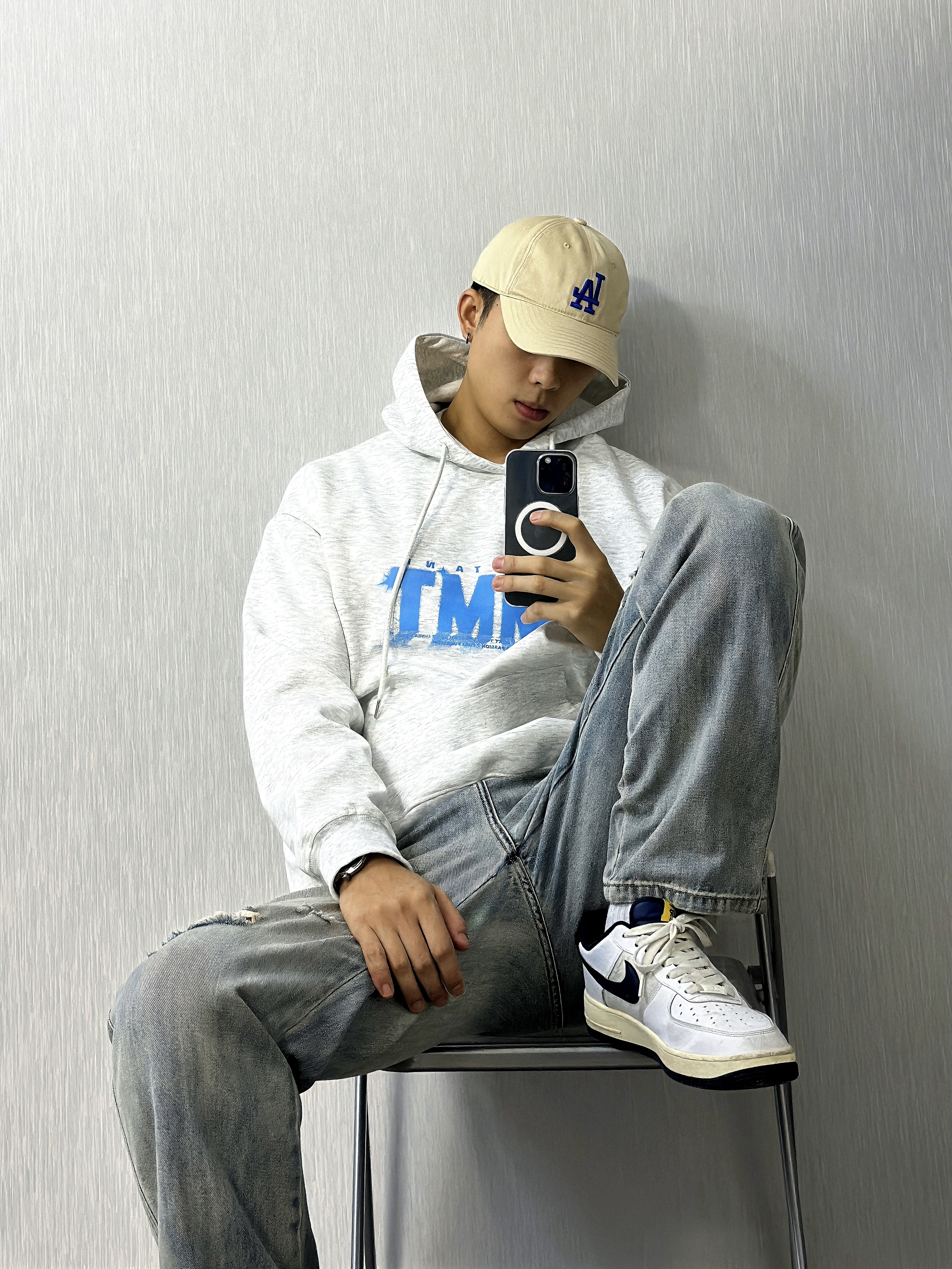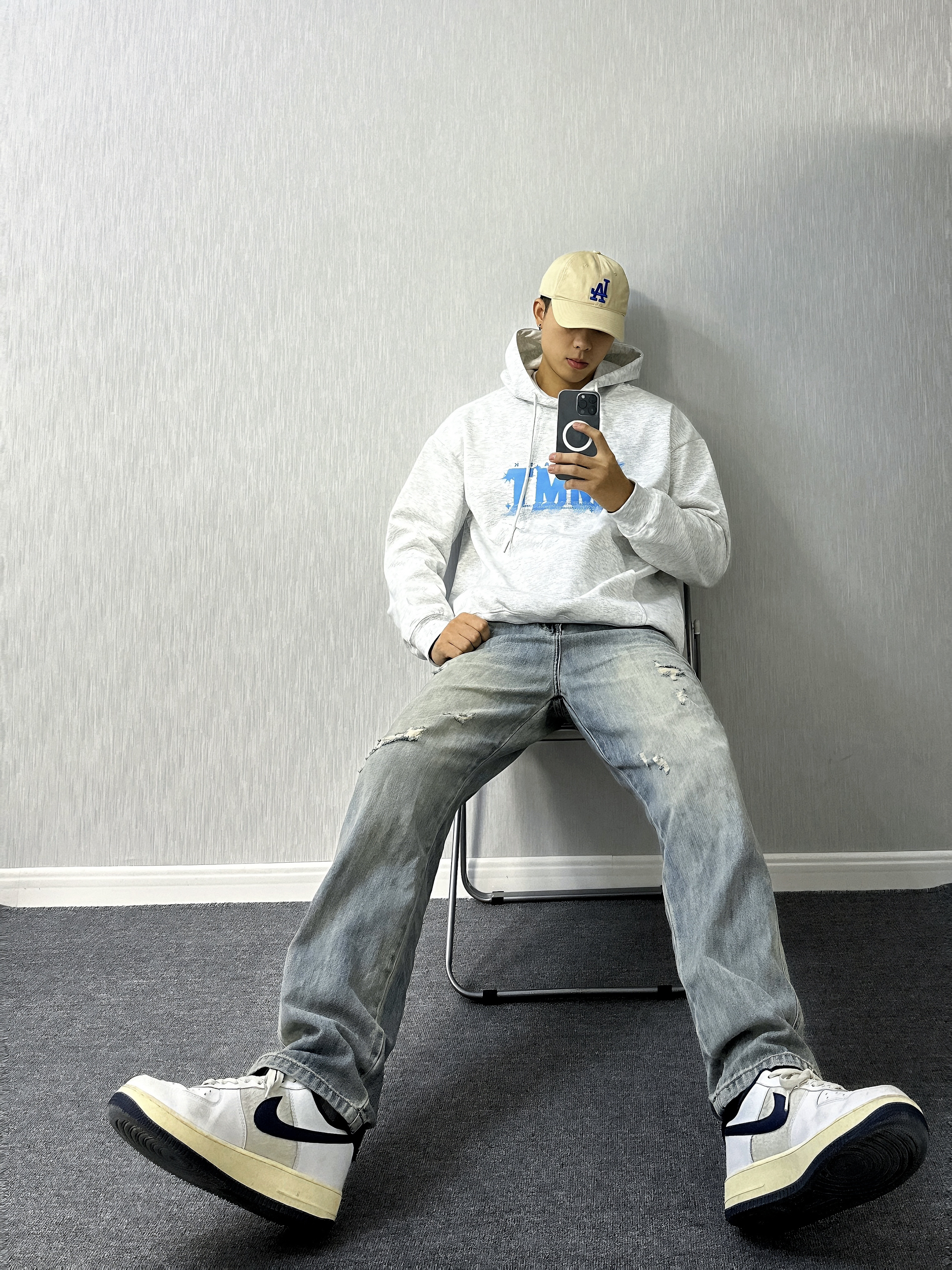 🧍♂️ :嗨喽∽ 小羊的秋冬穿搭分享来咯⬇️ 🧢:logo印花杏色鸭舌帽✅ 👔:字母logo印花浅灰色连帽卫衣✅ 👖:做旧直筒牛仔裤✅ 👟:蓝黄色空军一号✅