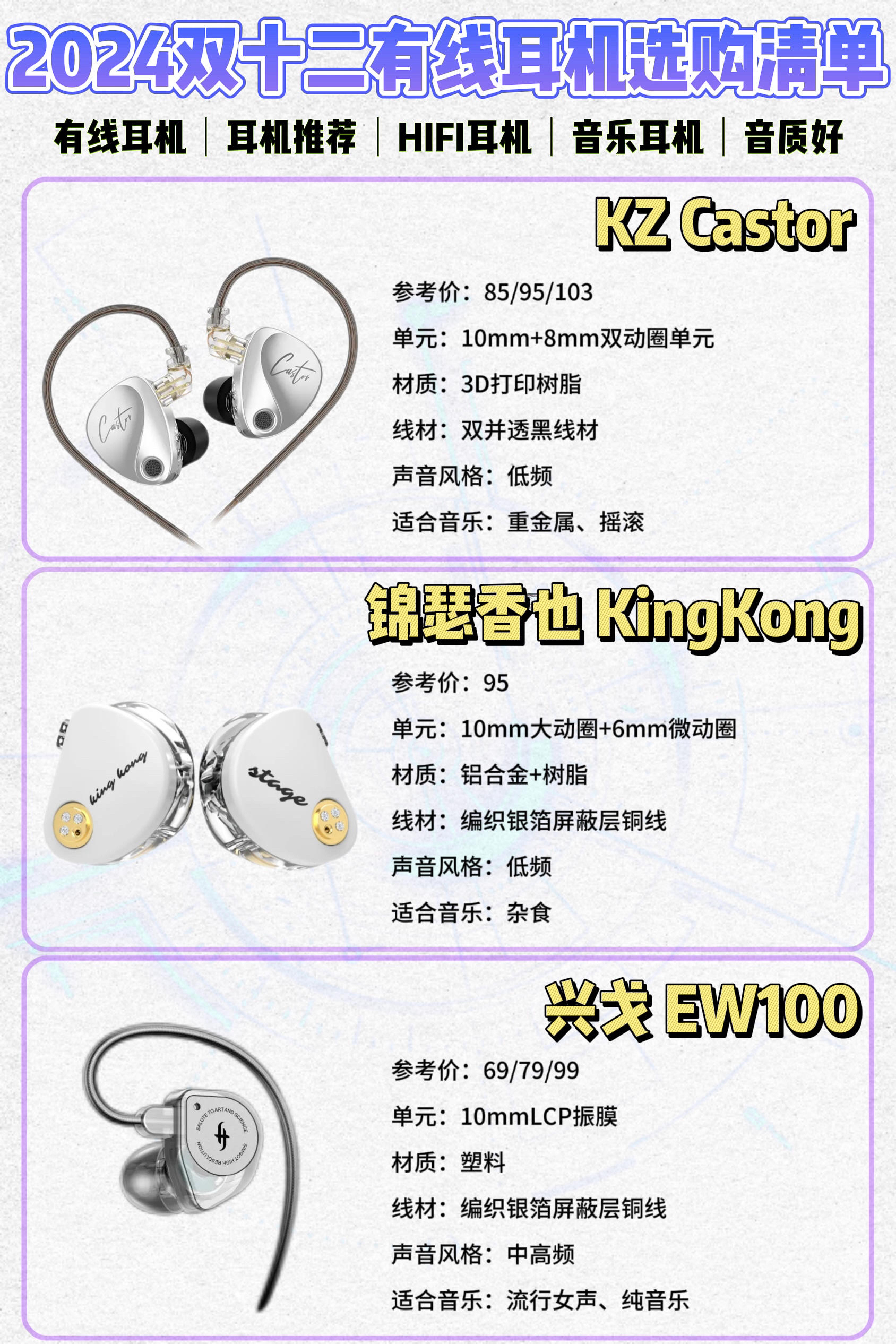 本篇笔记关联了SIMGOT/兴戈 珍泷 EW200 入耳式 有线耳机 双腔体动圈 绕耳式佩戴 无氧铜镀银线 音乐可换线 HiFi 无麦 镜面银、Feaulle/绯乐 涟LIAN 入耳式 有线耳机 HIFI音质 高保真 电竞游戏 黑色、EPZ Q1PRO 入耳式有线耳机 电竞 HIFI 动圈 高保真 无损音质 蓝色等商品,为用户提供真实的使用体验和购买参考。