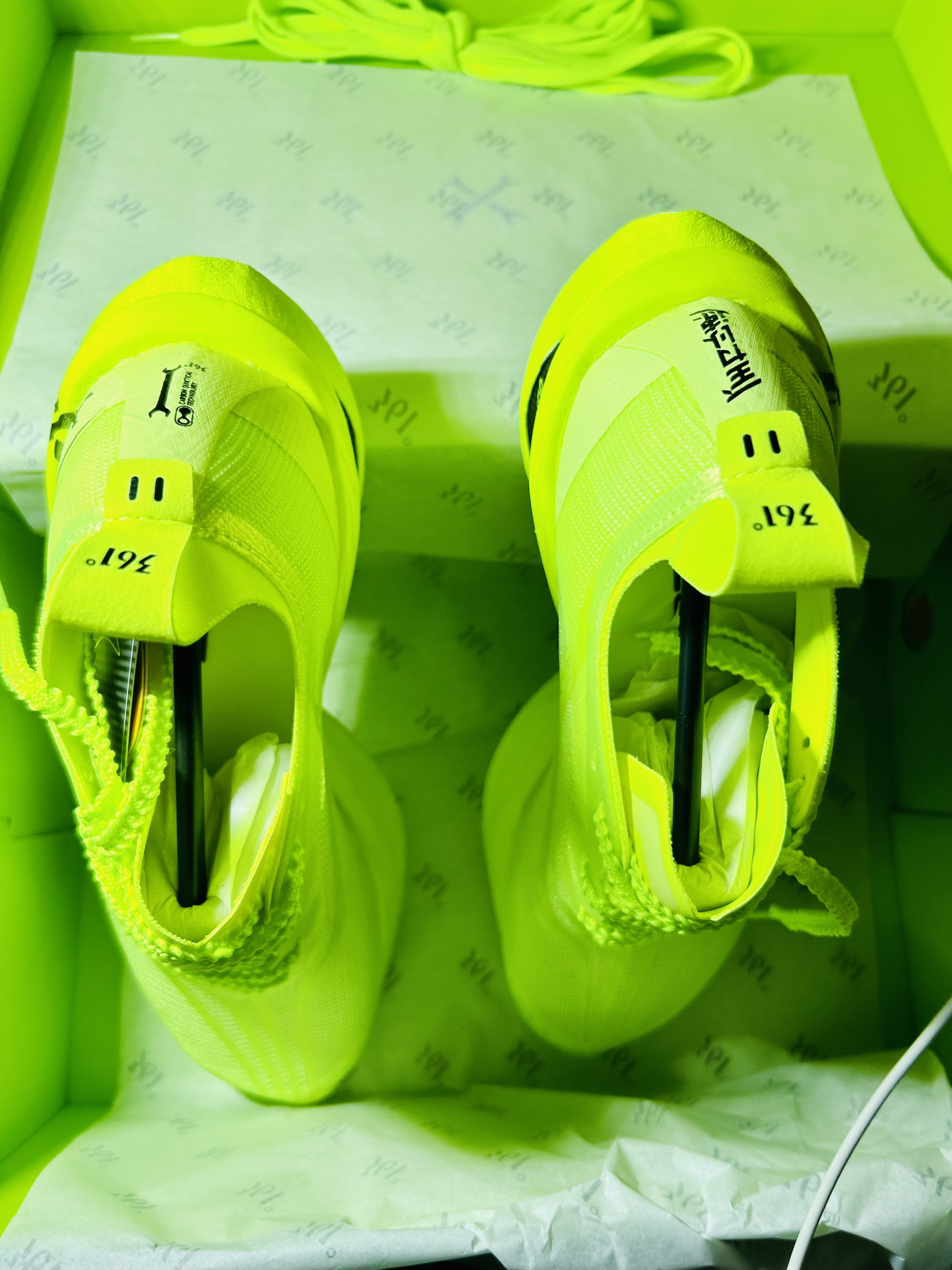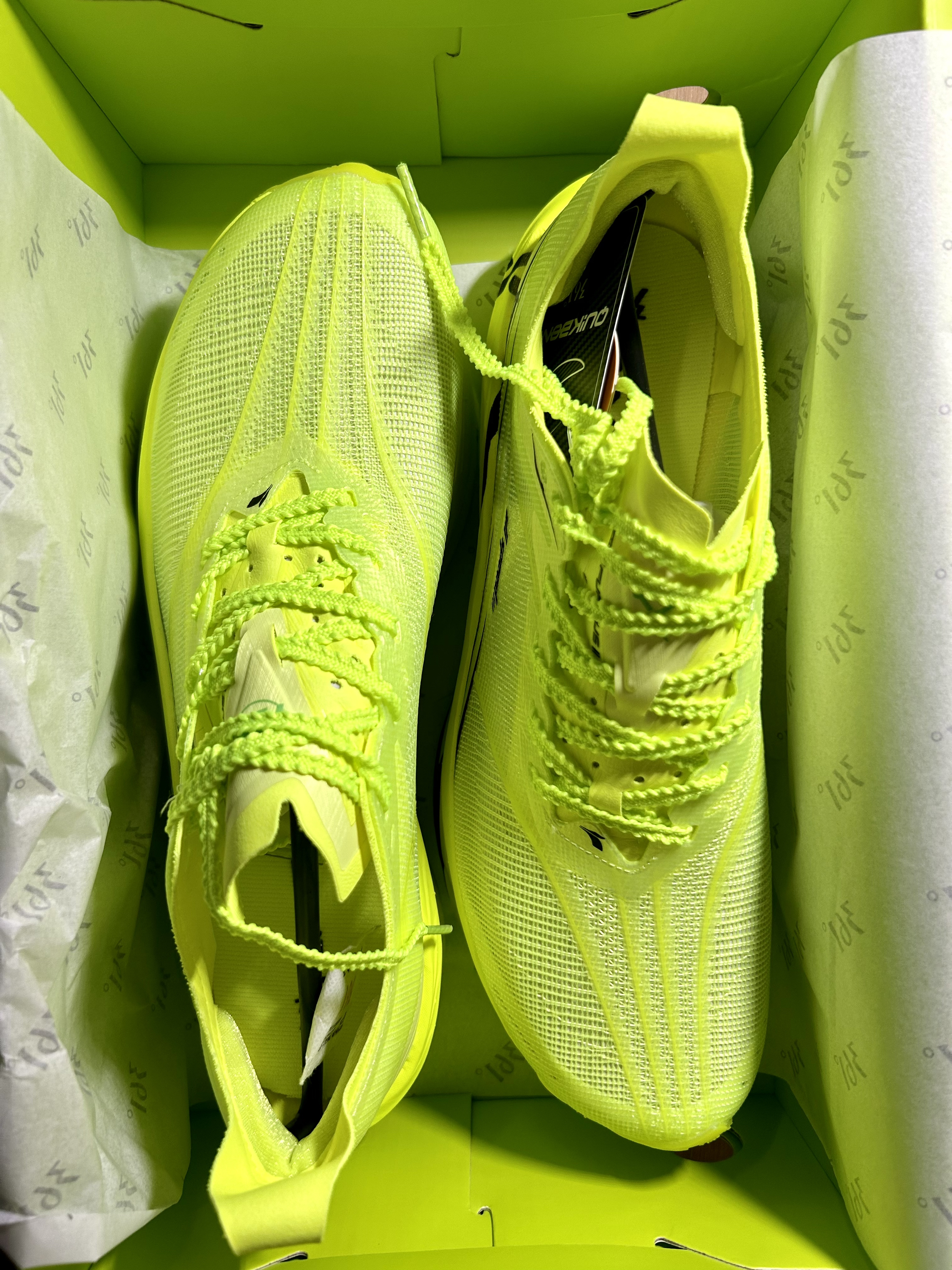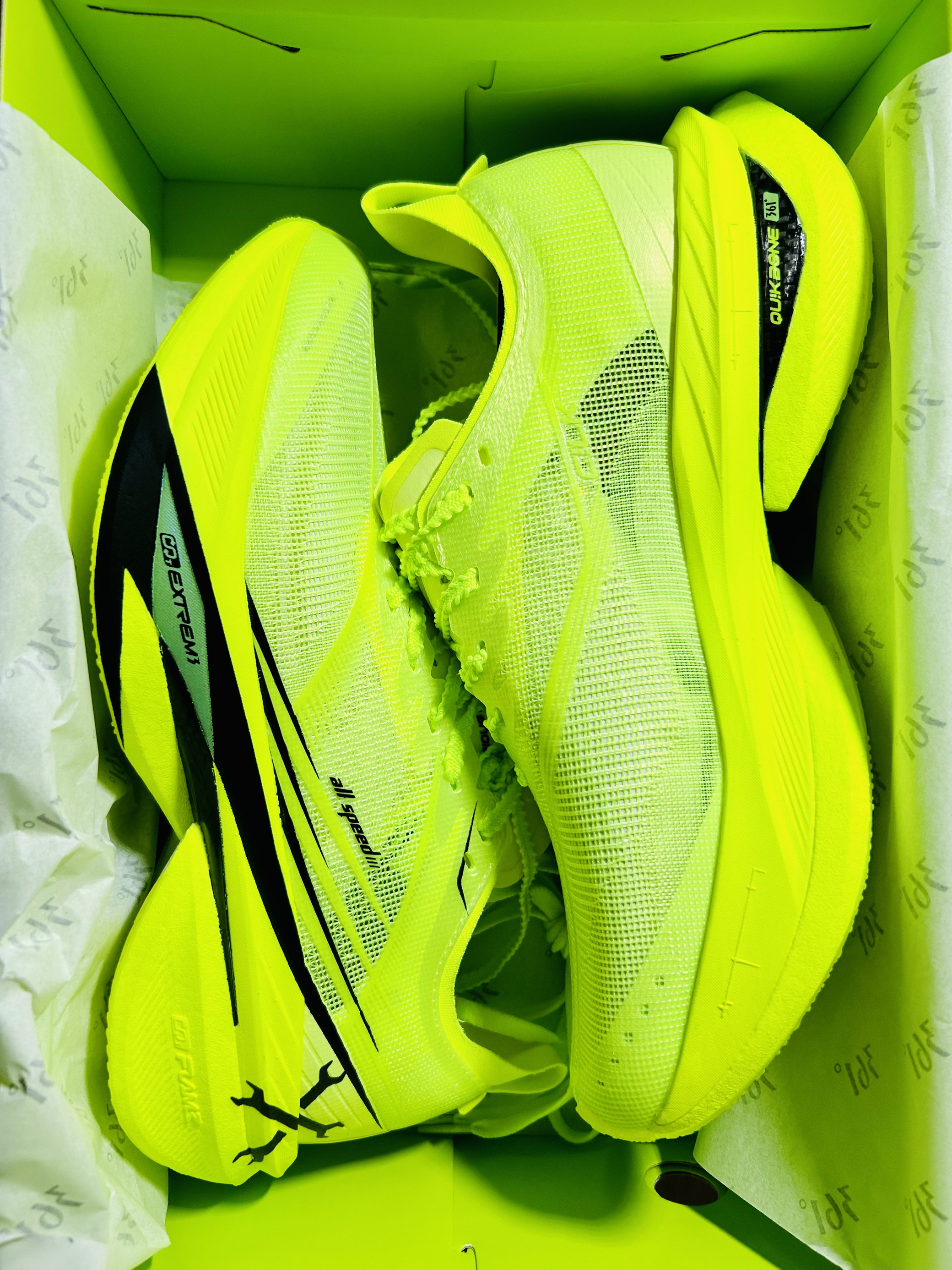 朋友们朋友们,今天分享的这款宝藏球鞋真的是继飞燃3之后的又一双非常不错的跑鞋、整体设计风格全部都是绿色的元素,真的是给人一种清新又温暖的气息。 打开鞋盒首先映入眼帘的是一个全绿色的鞋盒,上面显现了一个“碳”字,真的特别好看,打开鞋盒,一对满满绿色元素的鞋子呈现在眼前,以及非常贴心的两对鞋带让你随意切换!这是鞋整体绿色非常吸晴啊,无论是在跑步、出街、日常穿搭都是非常显眼的感觉!这个绿色真的是太有味道...