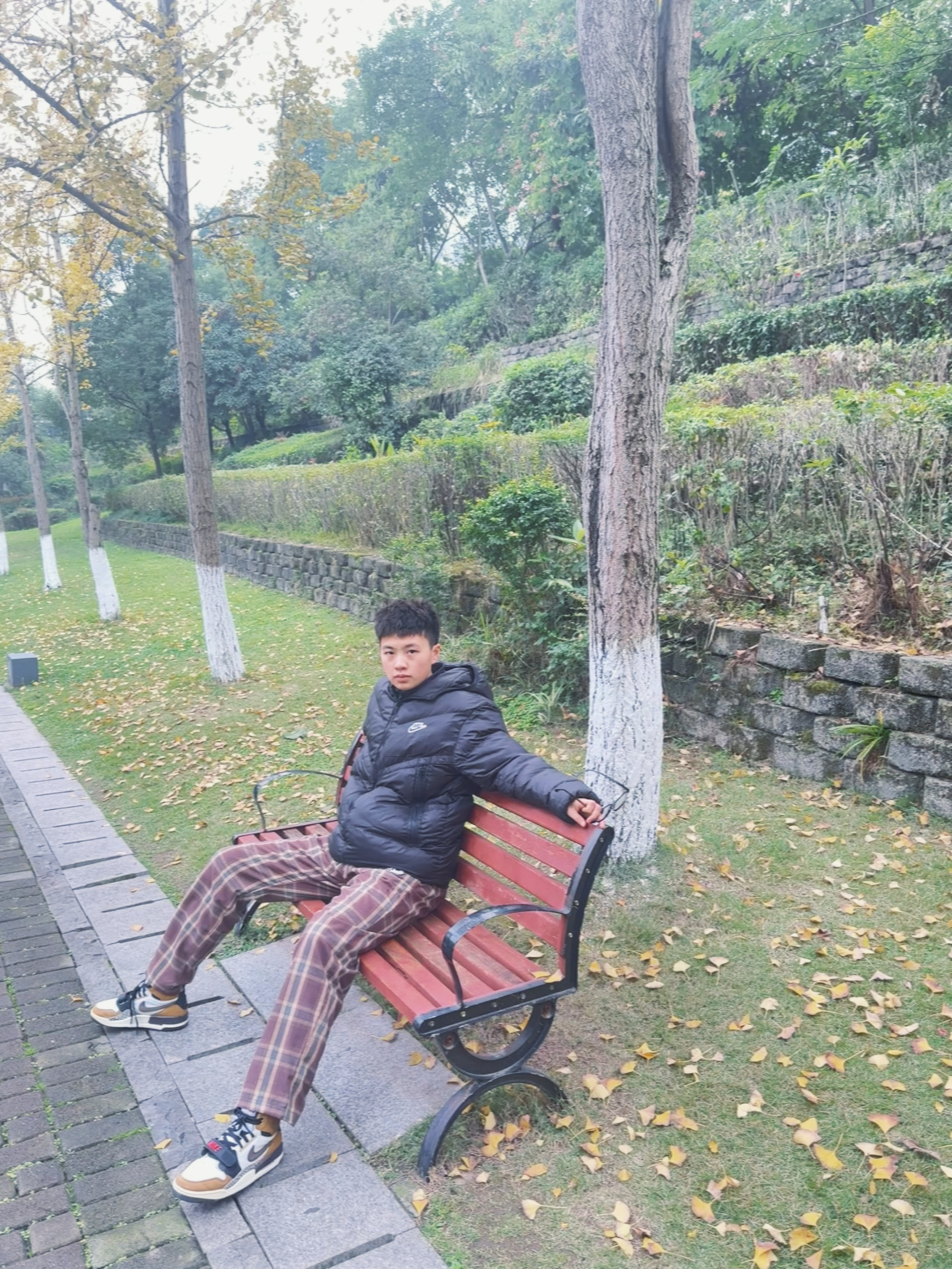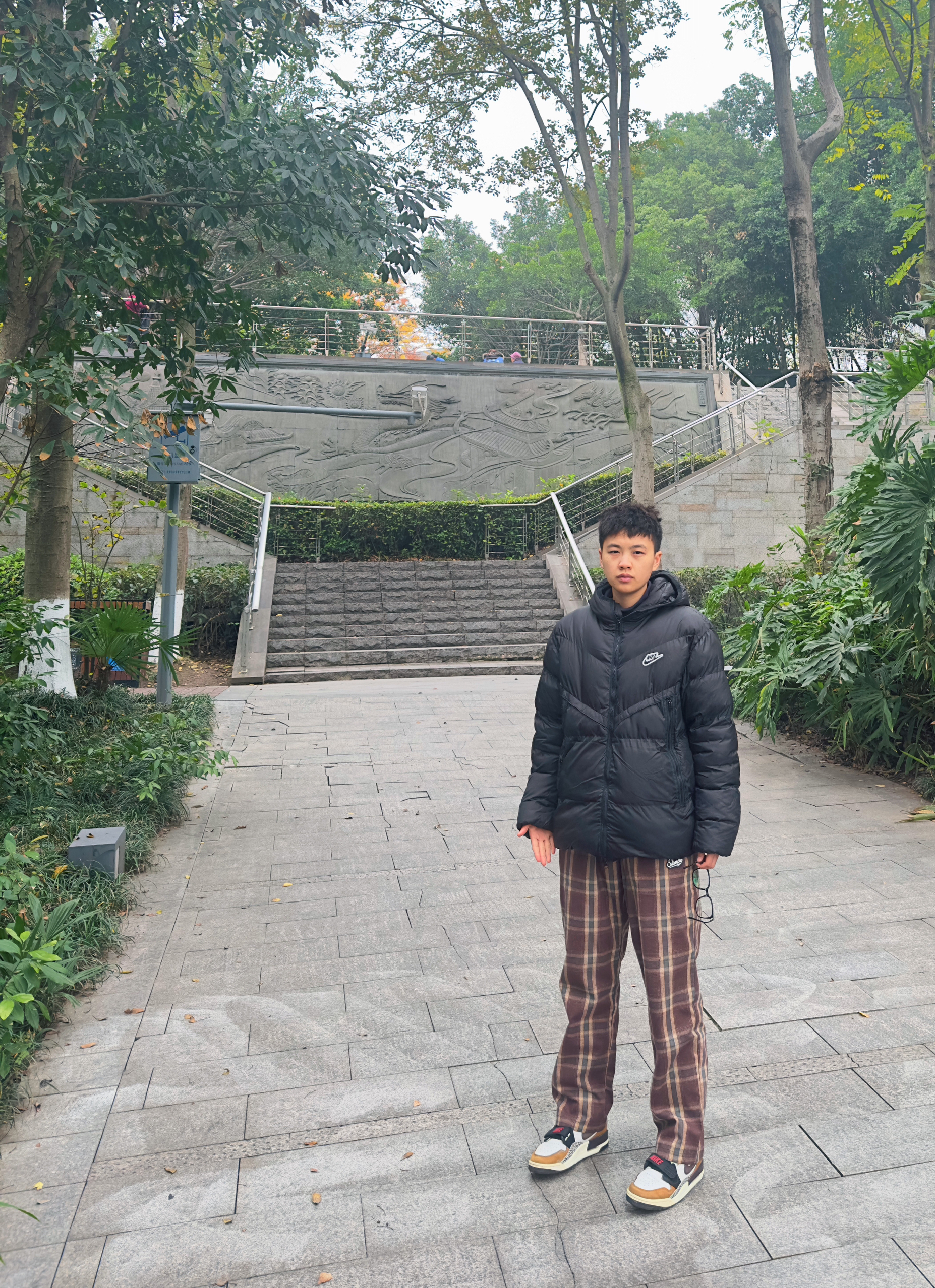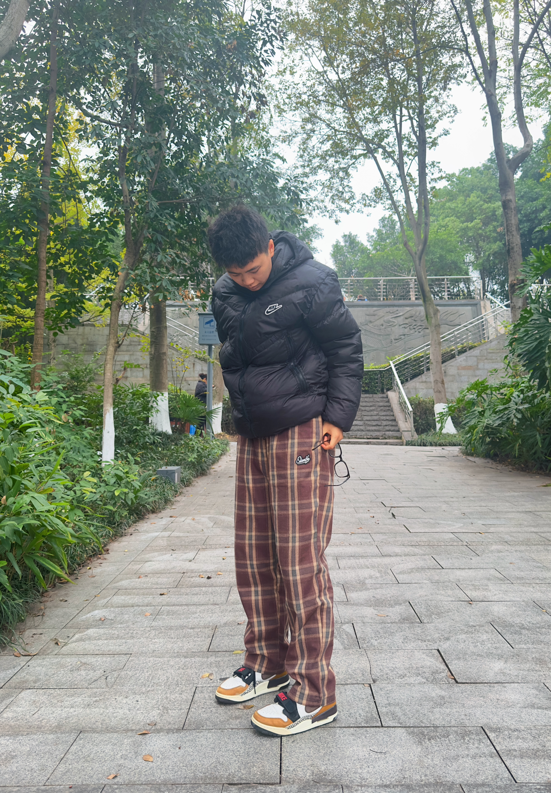 上身耐克Nike家连帽羽绒服,下身超级喜欢的slamble家的格子裤,咖啡色真的很爱,太帅了!裤子比较宽松,推荐尺码宽松,我身高174体重67kg穿的L。打球穿,逛街穿,宅家穿都可以,个人比较喜欢咖啡色!