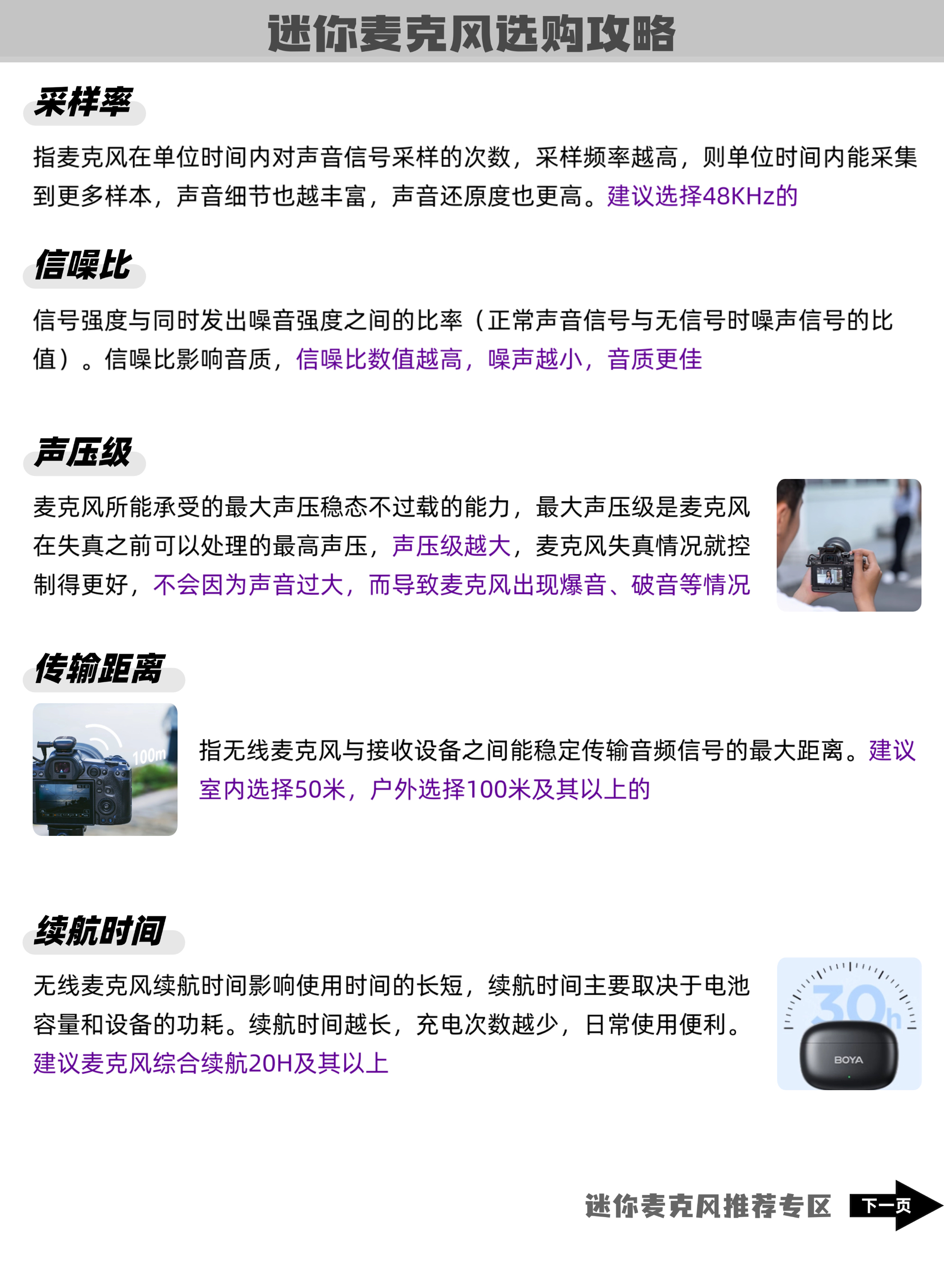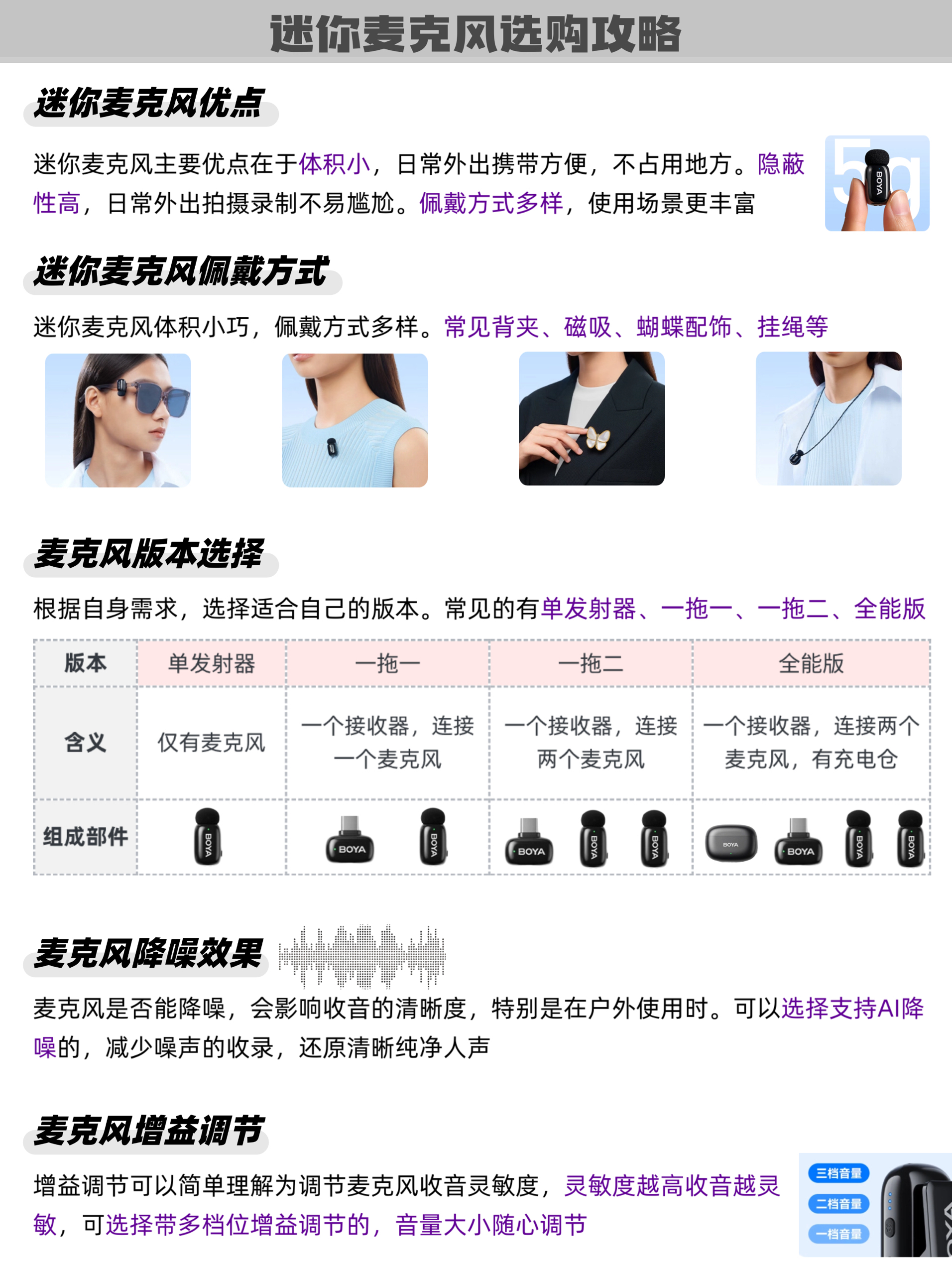 现在自媒体快速兴起,也越来越多人想从事自媒体、记录生活!一个不错的收音麦克风会让视频更加有质感,能很好还原现场人声🎙️ 迷你麦克风体积小,隐蔽性高,收音效果不错,成为很多人的选择!接下来给大家推荐四款不错的迷你麦克风❗️ - 🎙️迷你麦克风推荐: ▫️BOYA mini 性价比超高,百元价位就可体验千元级麦克风效果👍🏻体积小巧,指尖大小,日常佩戴隐蔽,不容易抢镜。三档降噪、3档增益调节都有配置...