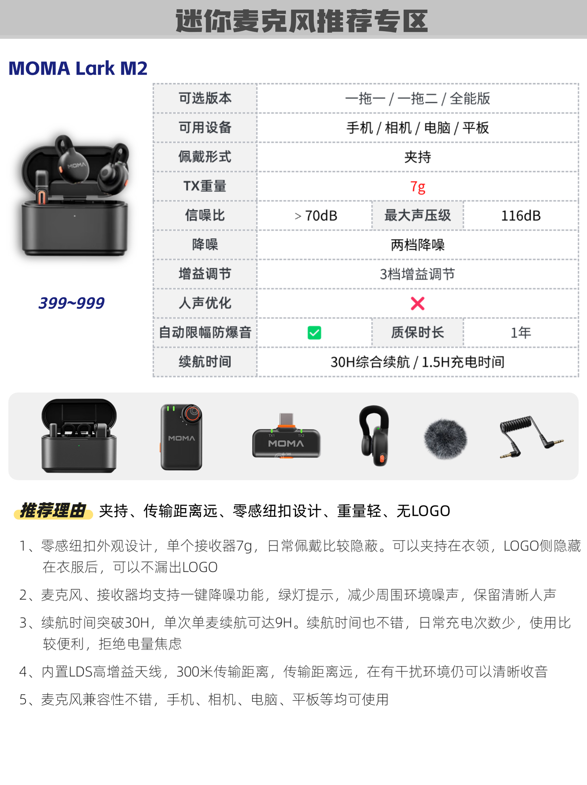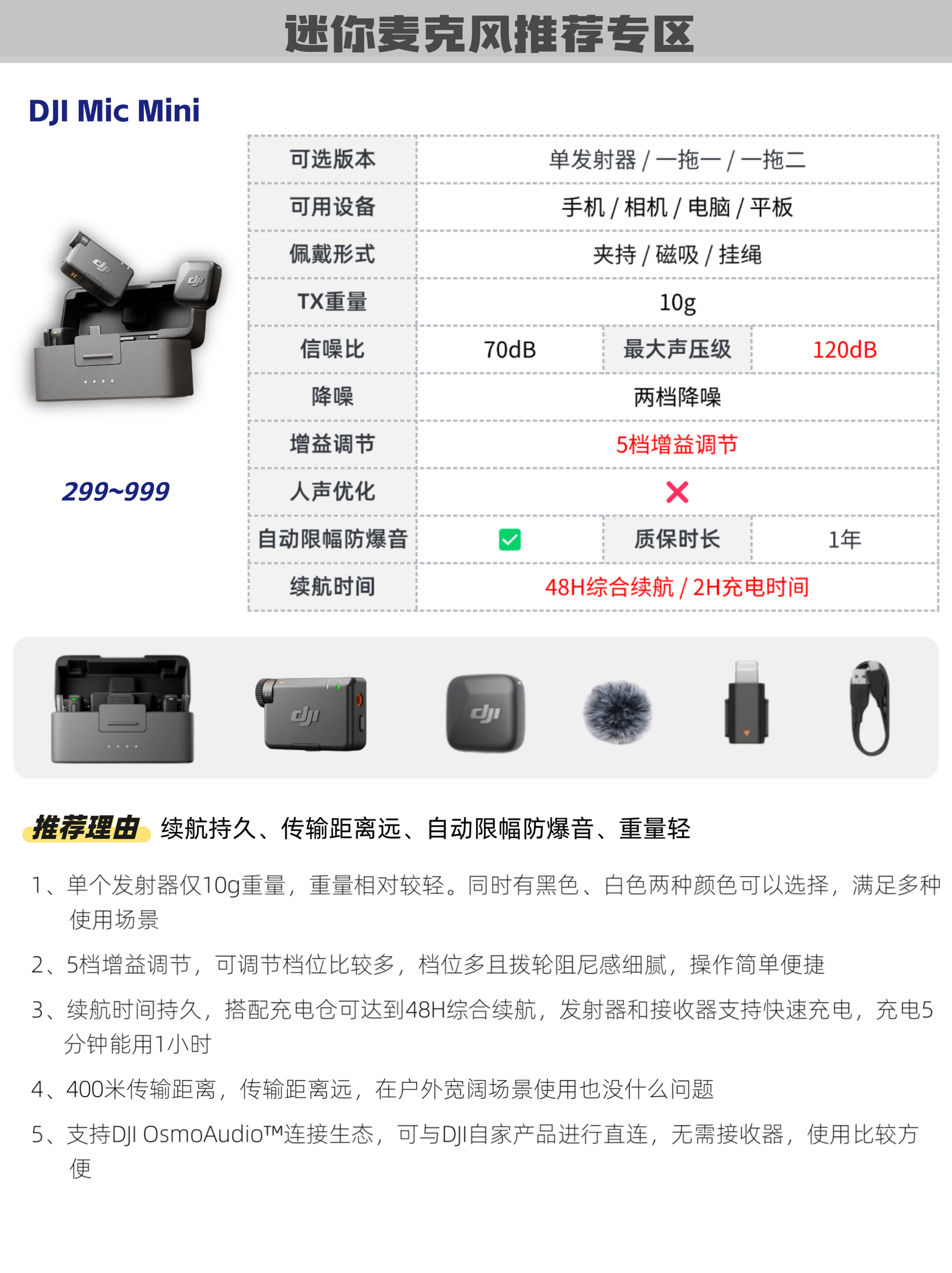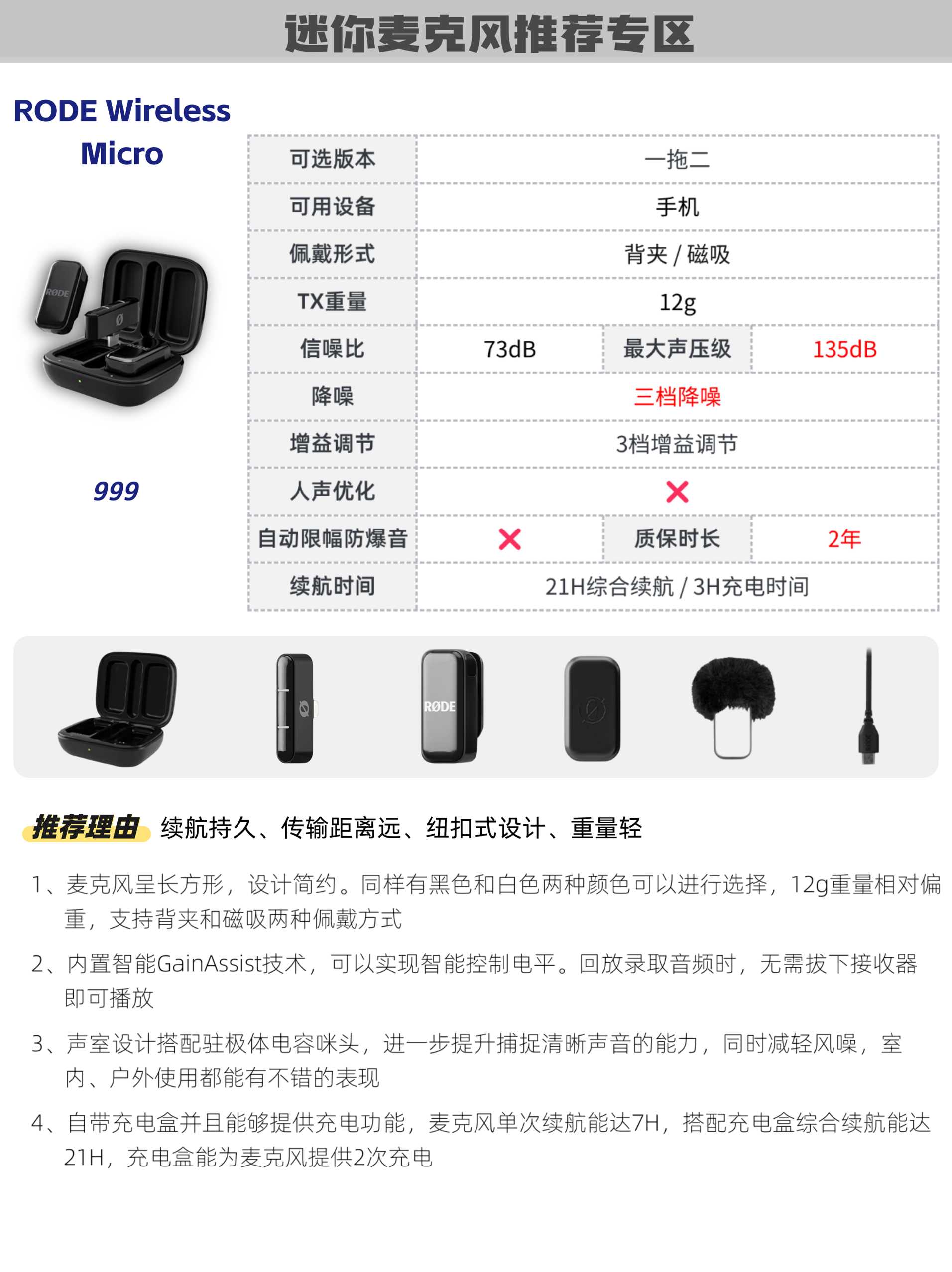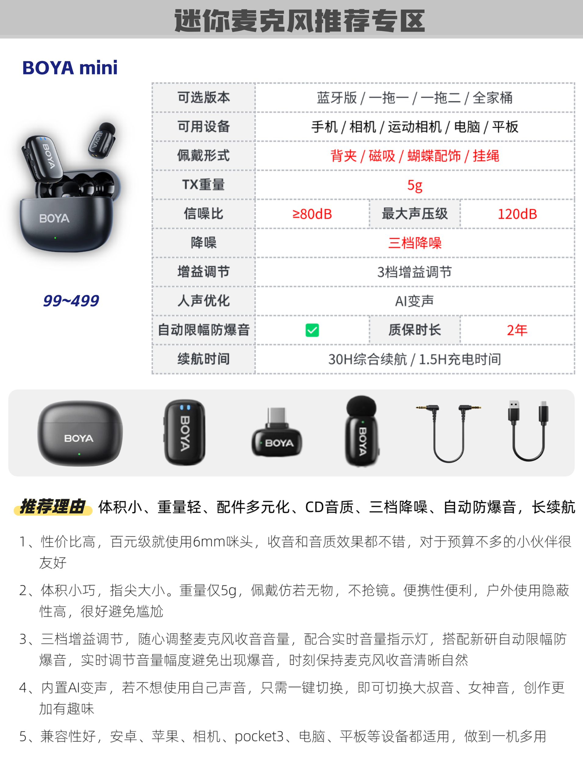 本篇笔记关联了BOYA/博雅 mini 无线领夹式麦克风话筒 录音 直播 带货 黑色、RODE/罗德 Wireless Micro 口袋无线领夹麦克风 内置麦克风 使用简单 黑色、DJI/大疆 Mic Mini 降噪领夹麦克风 无线高品音质 户外采访直播vlog手机相机通用 微小型原声级收音 黑色等商品,为用户提供真实的使用体验和购买参考。