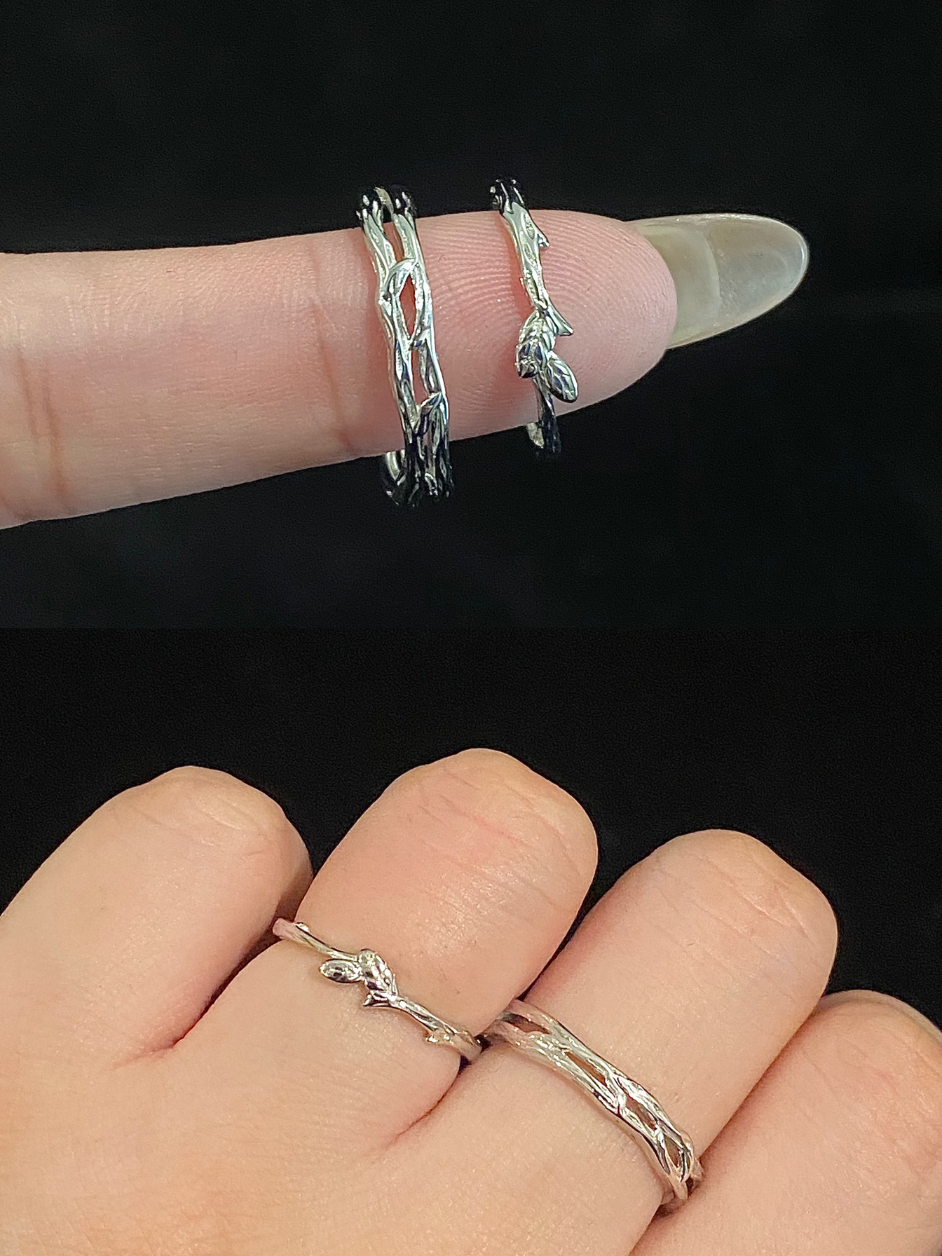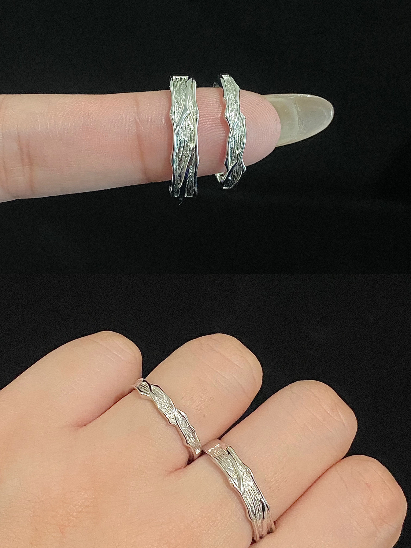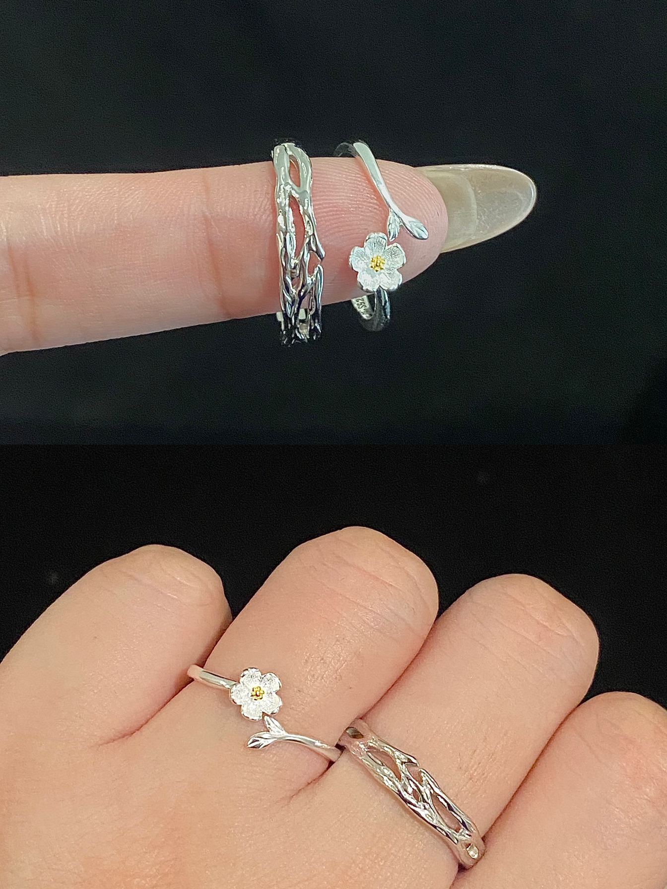 嘿嘿 自从喜欢戴戒指之后 男朋友跟我的手上每天都不重样 每天都要新衣服配新戒指✌️ 每款都吼吼看 全是纯银的 也不用担心掉色过敏 嘻嘻 这下首饰盒不闲置了