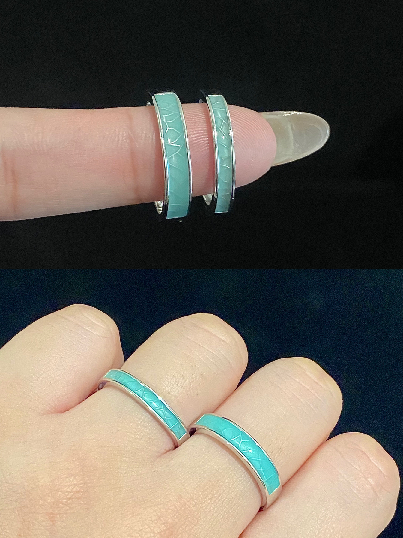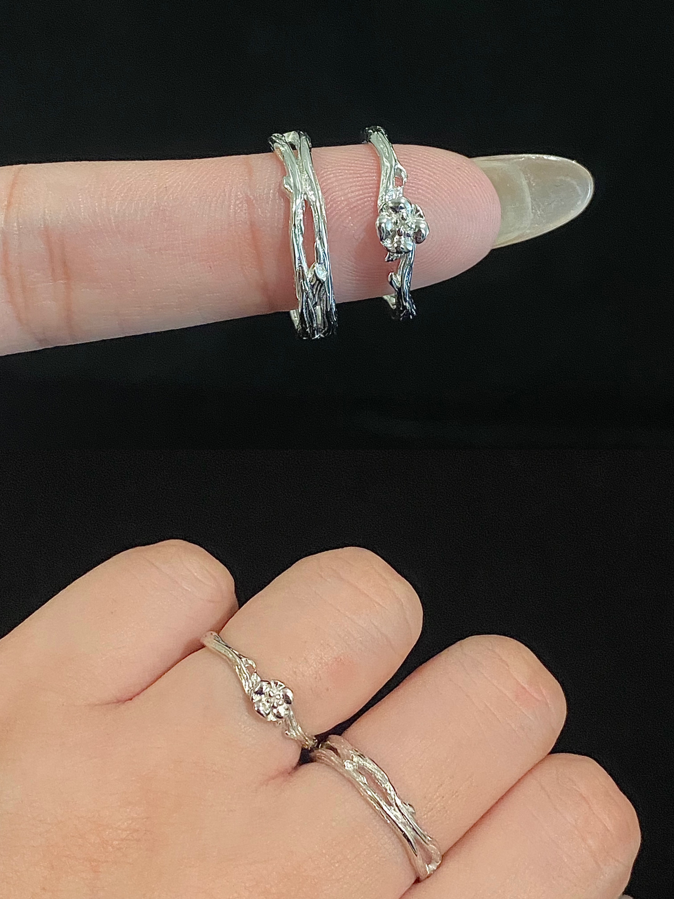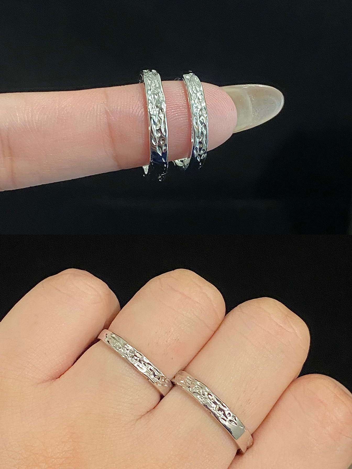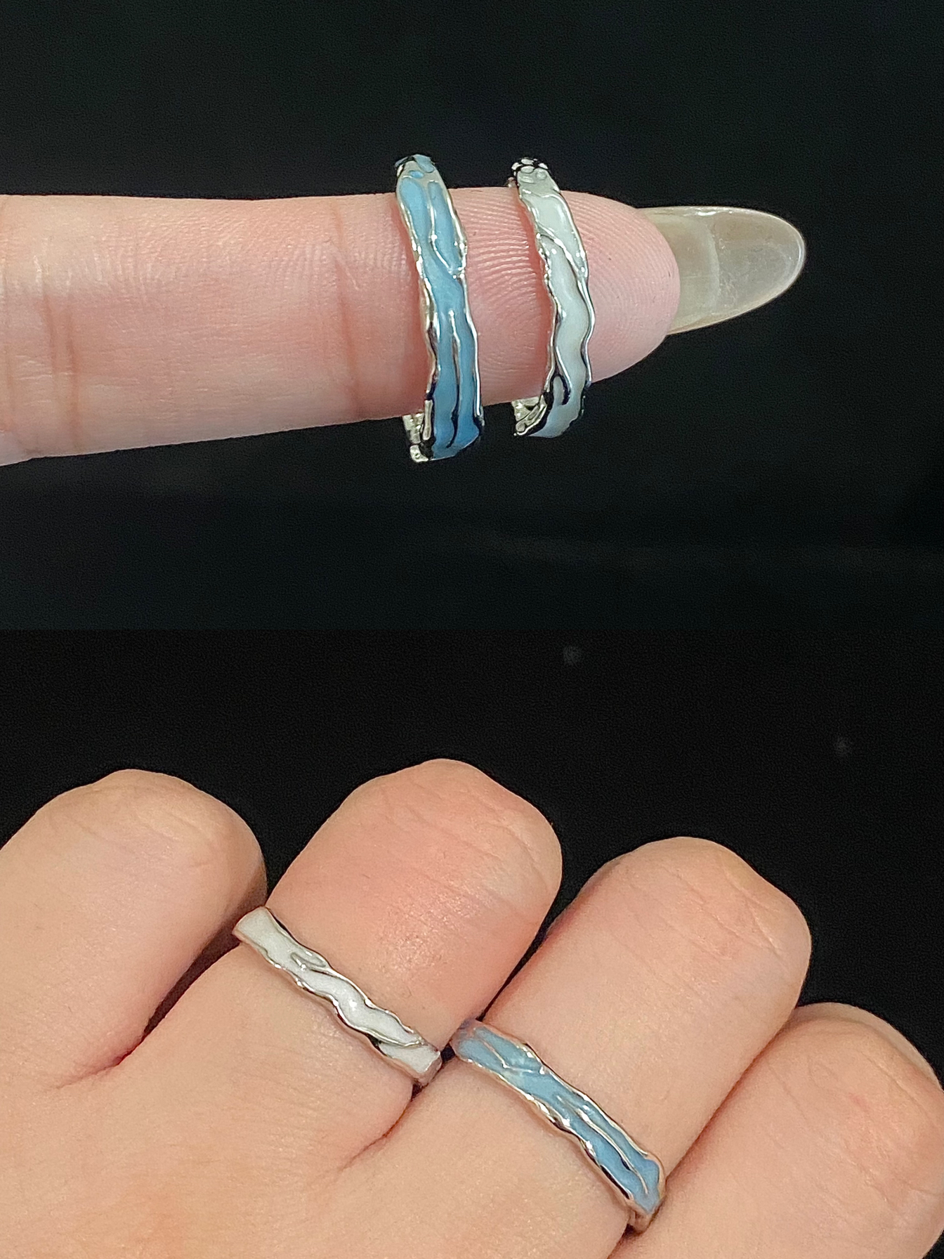 嘿嘿 自从喜欢戴戒指之后 男朋友跟我的手上每天都不重样 每天都要新衣服配新戒指✌️ 每款都吼吼看 全是纯银的 也不用担心掉色过敏 嘻嘻 这下首饰盒不闲置了