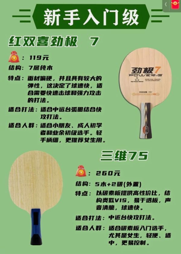 这款是多层合板工艺制造,可以说兼具了击球的力度与控制,配合高弹海绵,特别适合用于弧圈快攻打法。整体结构还注重了打击能力,非常适合进行拉球和扣杀等多种技术。👍👍👍图源网络,侵删