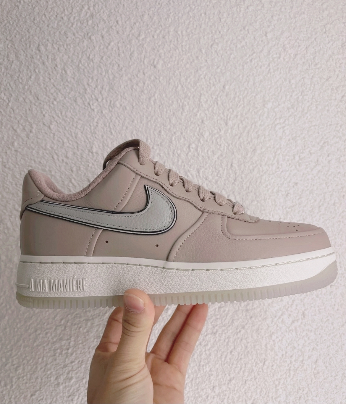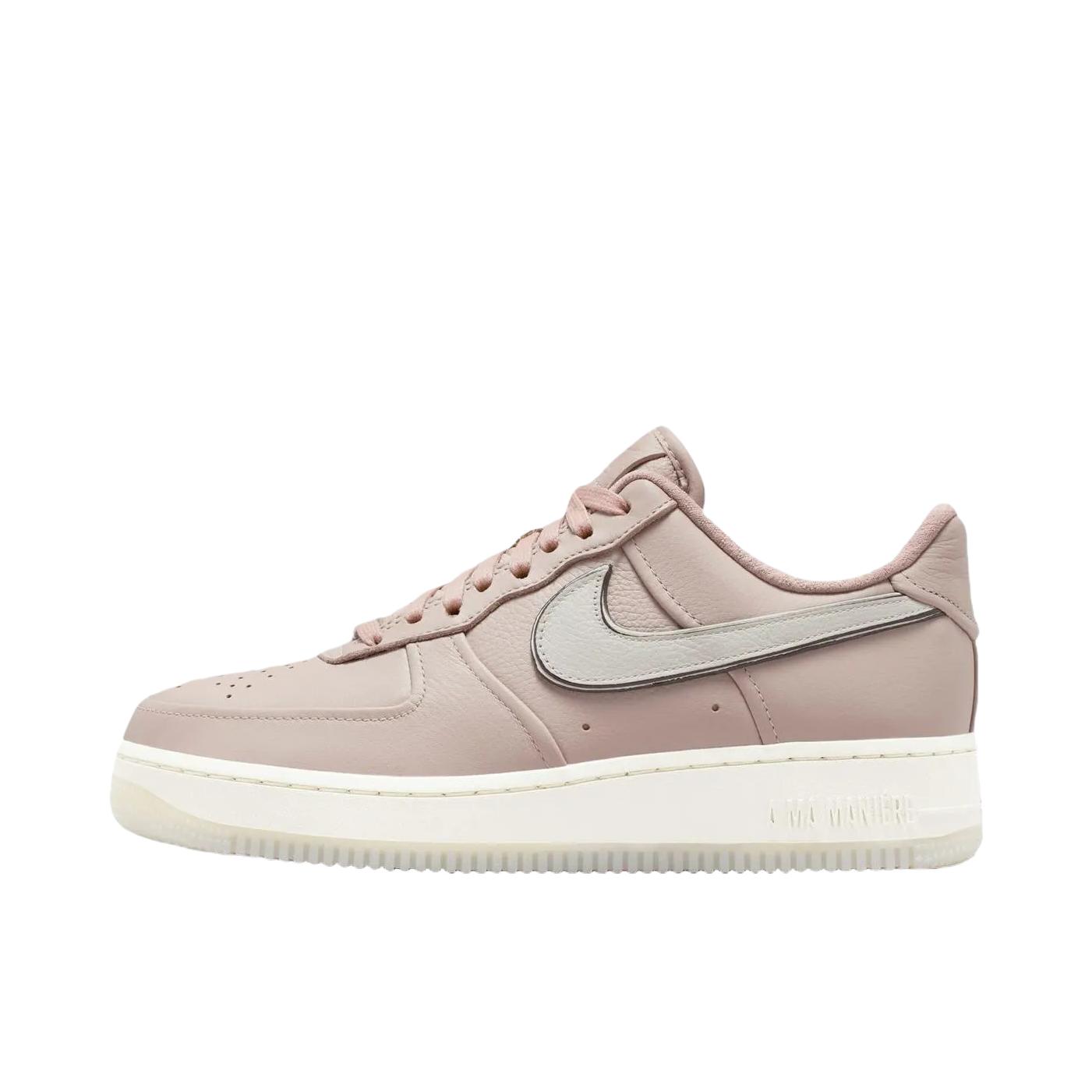 A Ma Maniere x Nike Air Force 1 "While You Were Sleeping" 外观设计 • 这款鞋以粉棕色为主色调,浅粉色皮革鞋面搭配灰色Swoosh,形成鲜明对比,视觉效果出色,且粉色调营造出浪漫甜美的氛围,适合搭配多种风格服饰. • 鞋型为低帮板鞋,经典简约,内收包边、鞋舌和后跟压印Logo以及特殊的AMM Logo纹理内衬等细节,提升了整体的精致感...