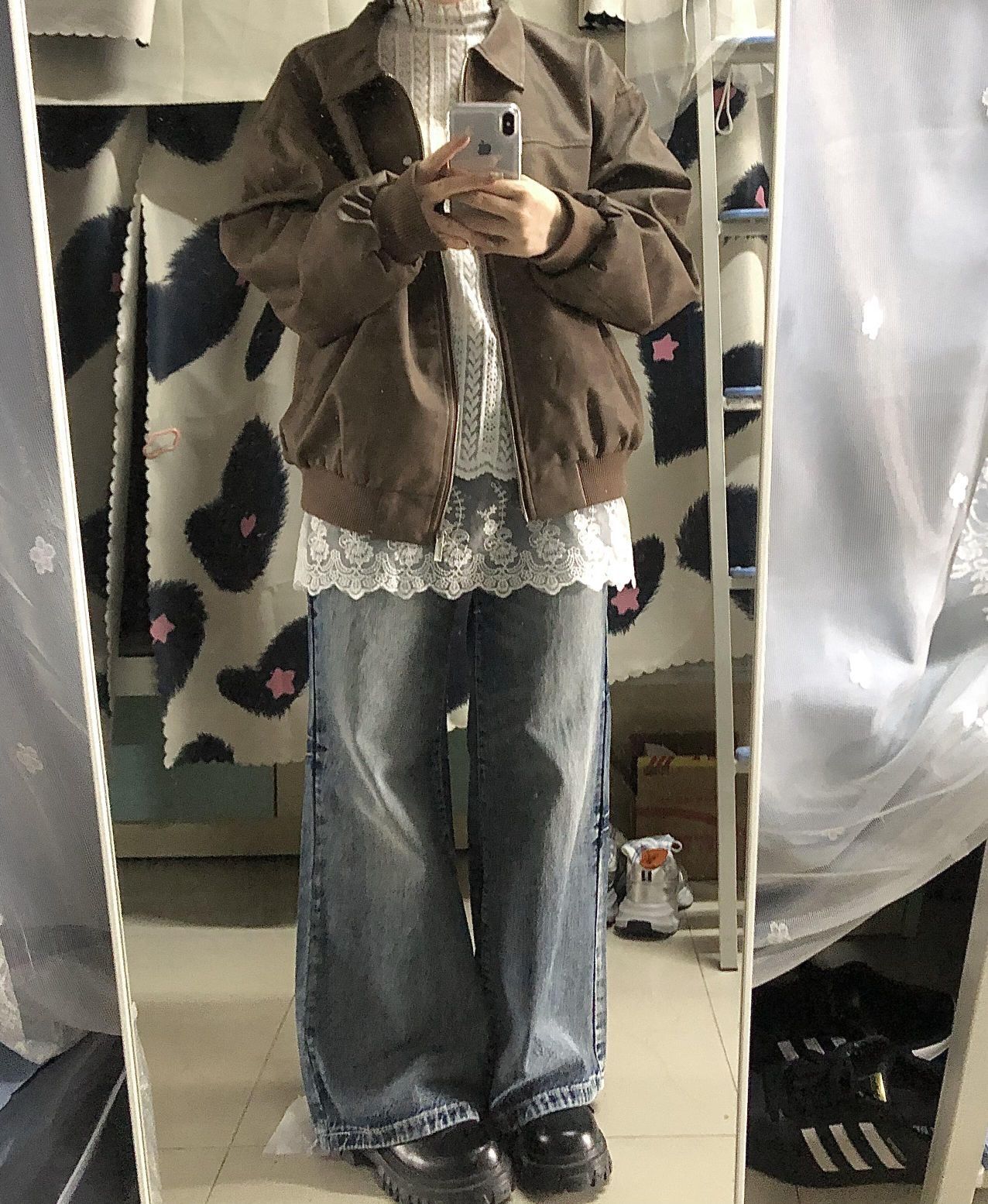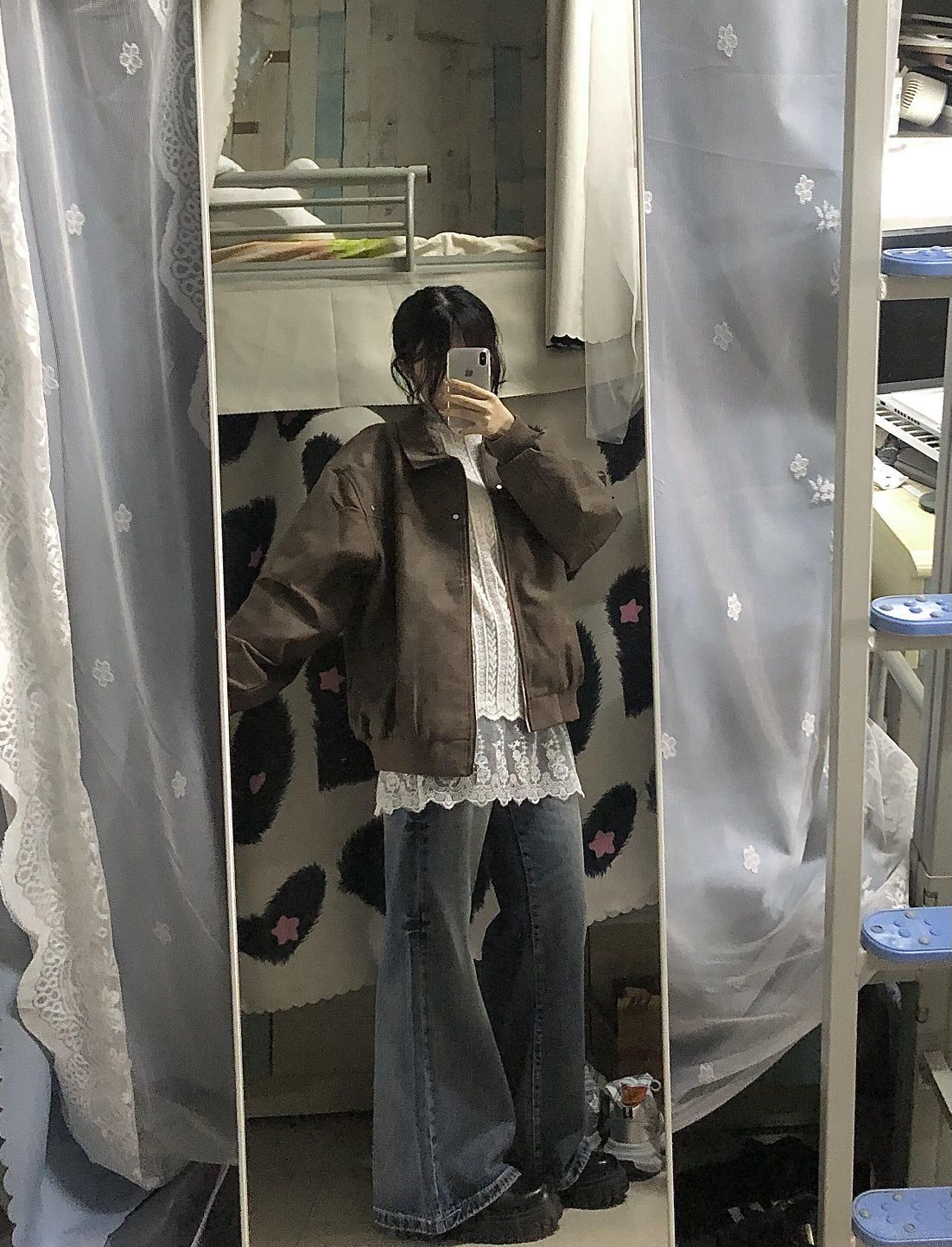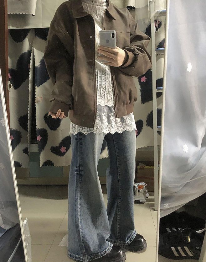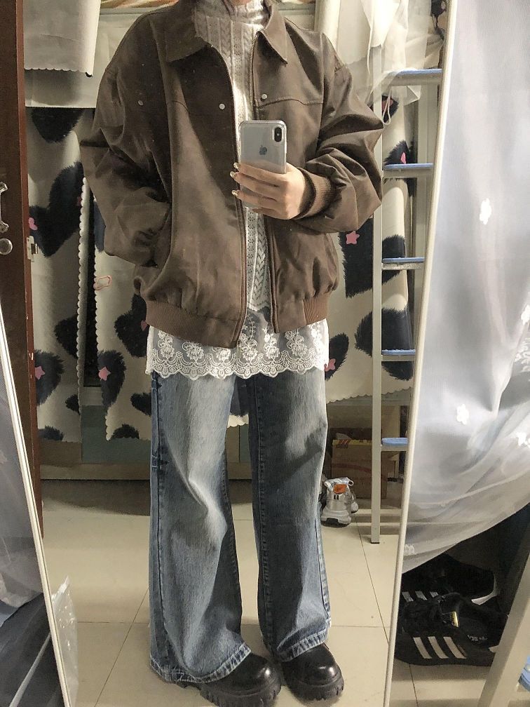 这套我好爱!美式咖啡☕️ 棕色皮衣外套叠穿蕾丝内搭秒变韩女了! 简简单单的叠穿层次感~🤍 氛围感一下子就有了! 炒鸡适合在校女大🫶