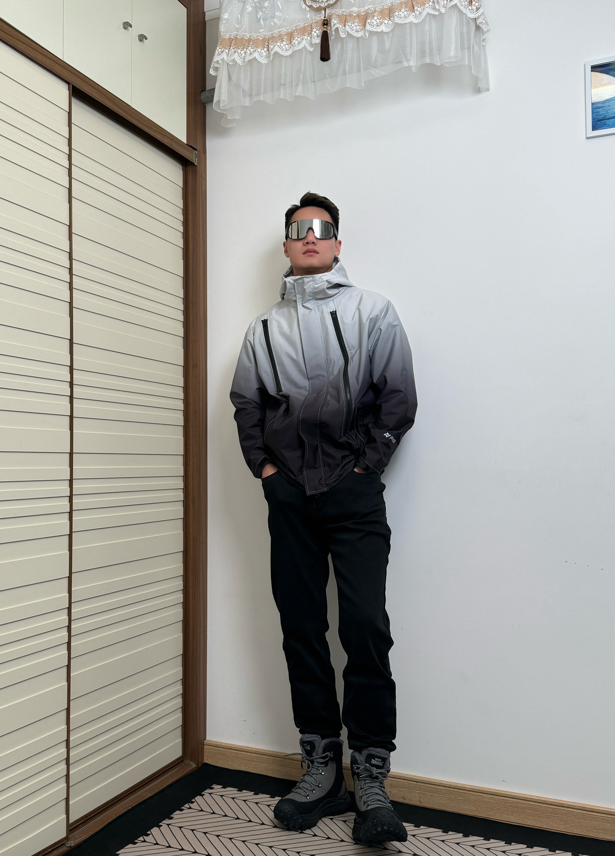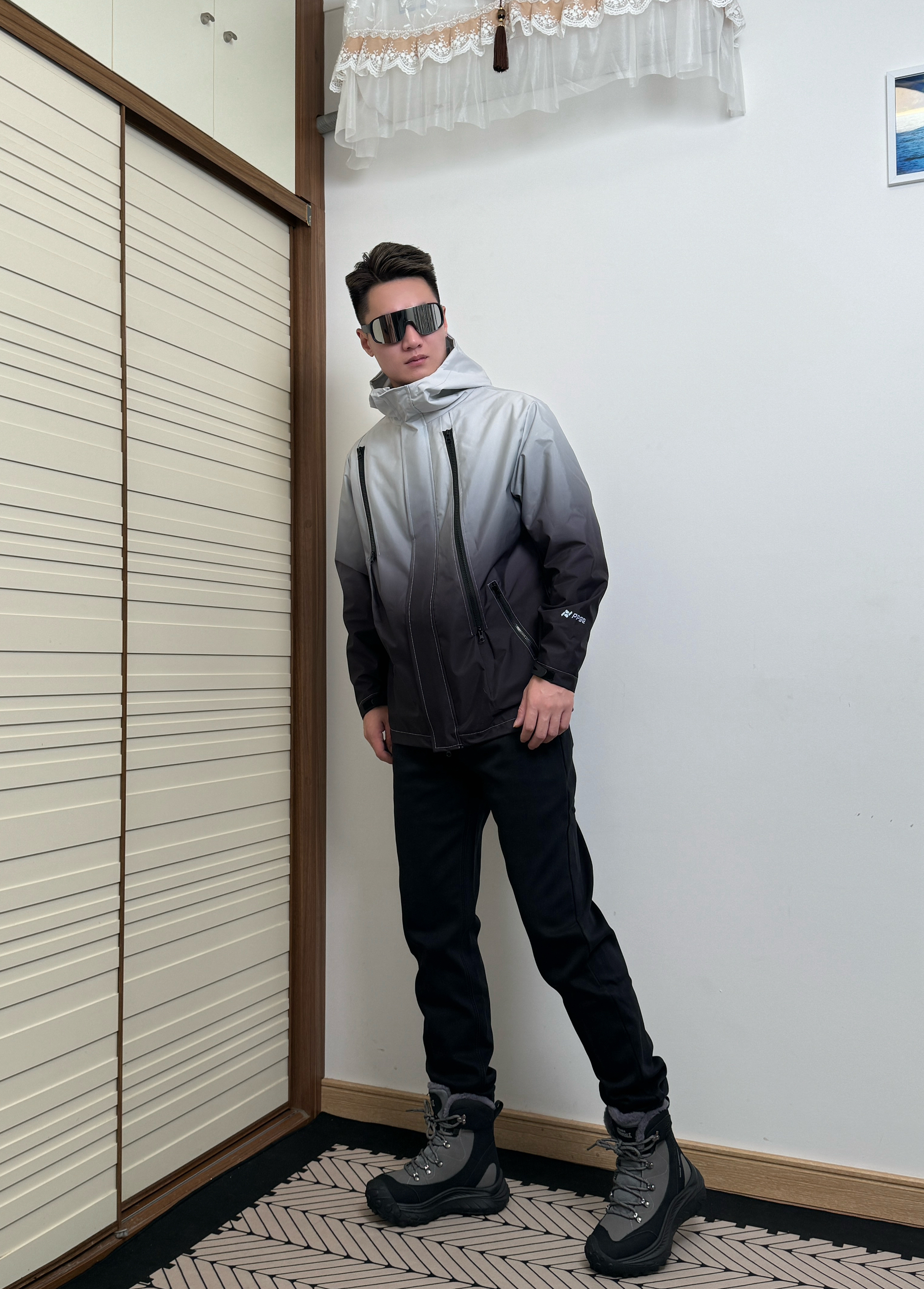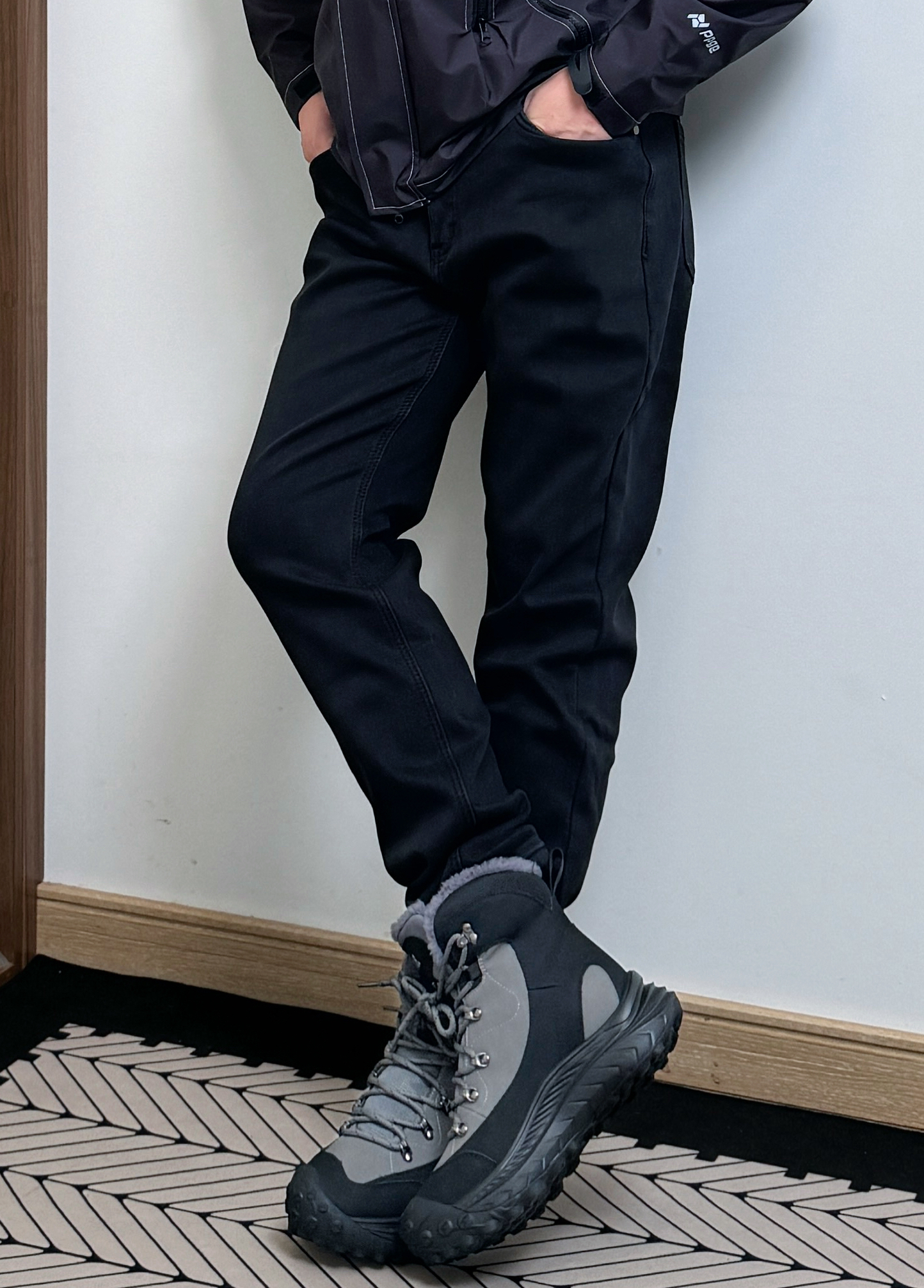 身高180,体重75!冬日这样搭配! 上身来件冲锋衣,黑白渐变色,时尚别致! 下身来条黑色直筒裤,休闲舒适! 鞋子是白马克华菲/FAIRWHALE 家的一款雪地靴,这简直是户外神器,颜值超高,黑灰配色设计,高级感满满!加绒加厚的设计,在下雪天也不会冻脚,而且鞋底防滑贼好,上脚脚感很好,不硌脚,还特别百搭,无论是运动裤还是工装裤都很帅! 太适合下雪天穿了!