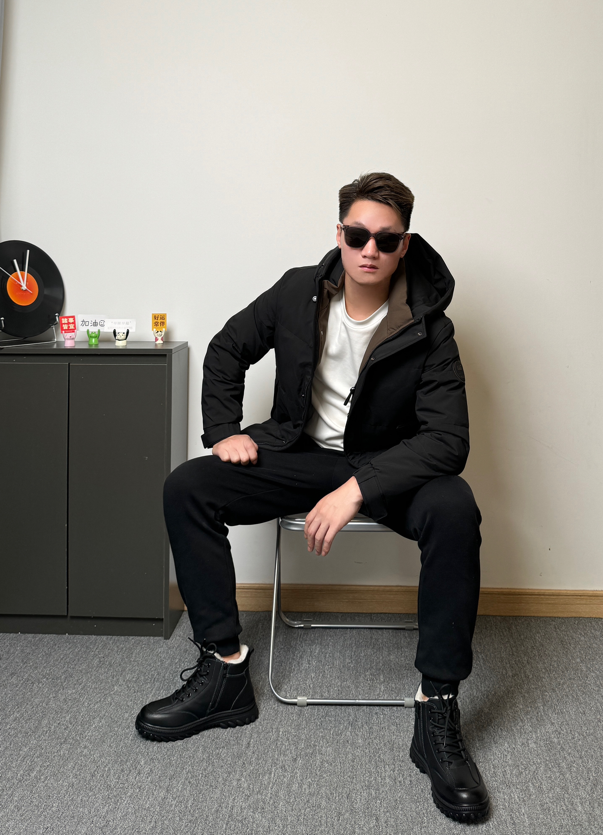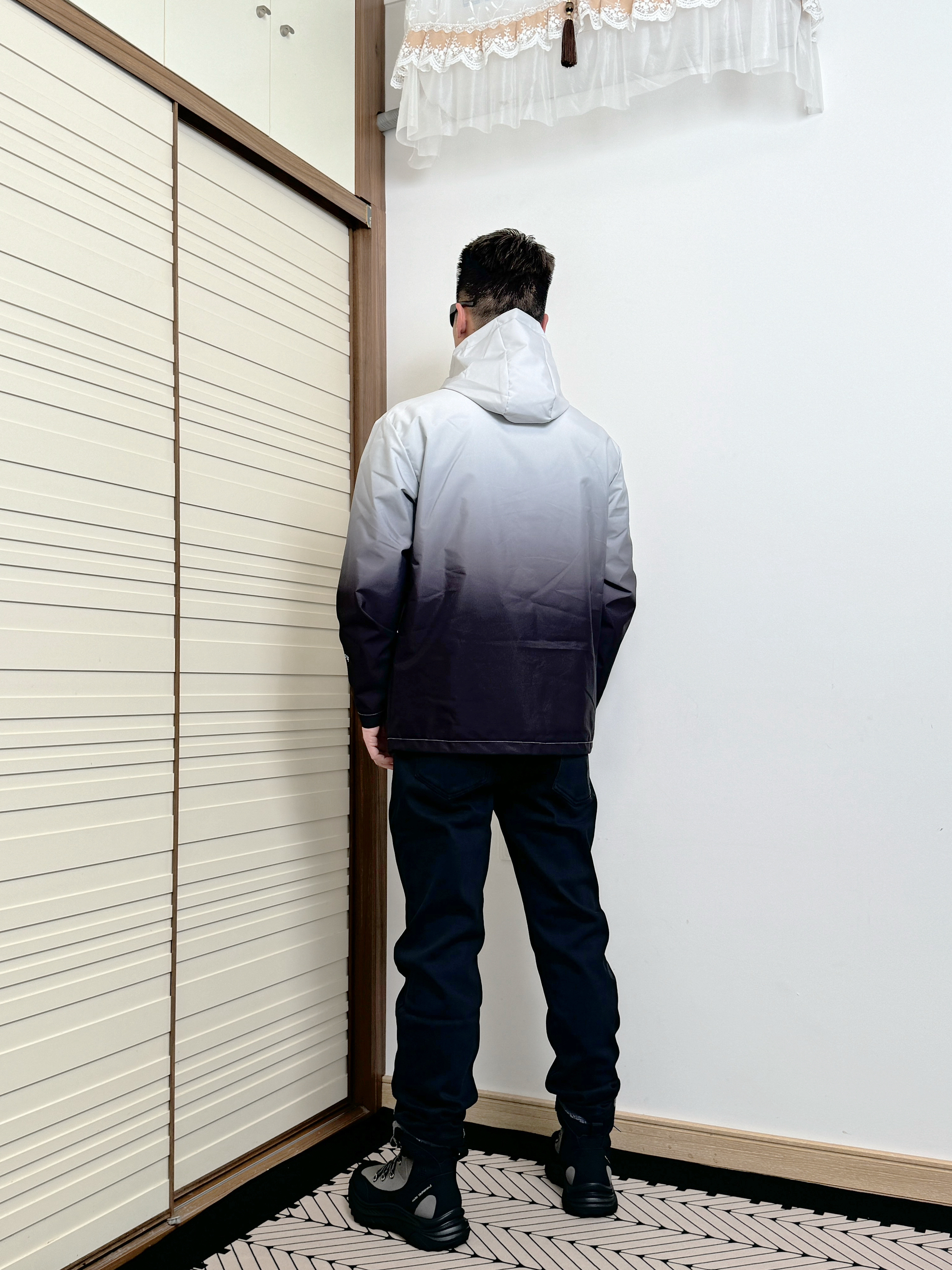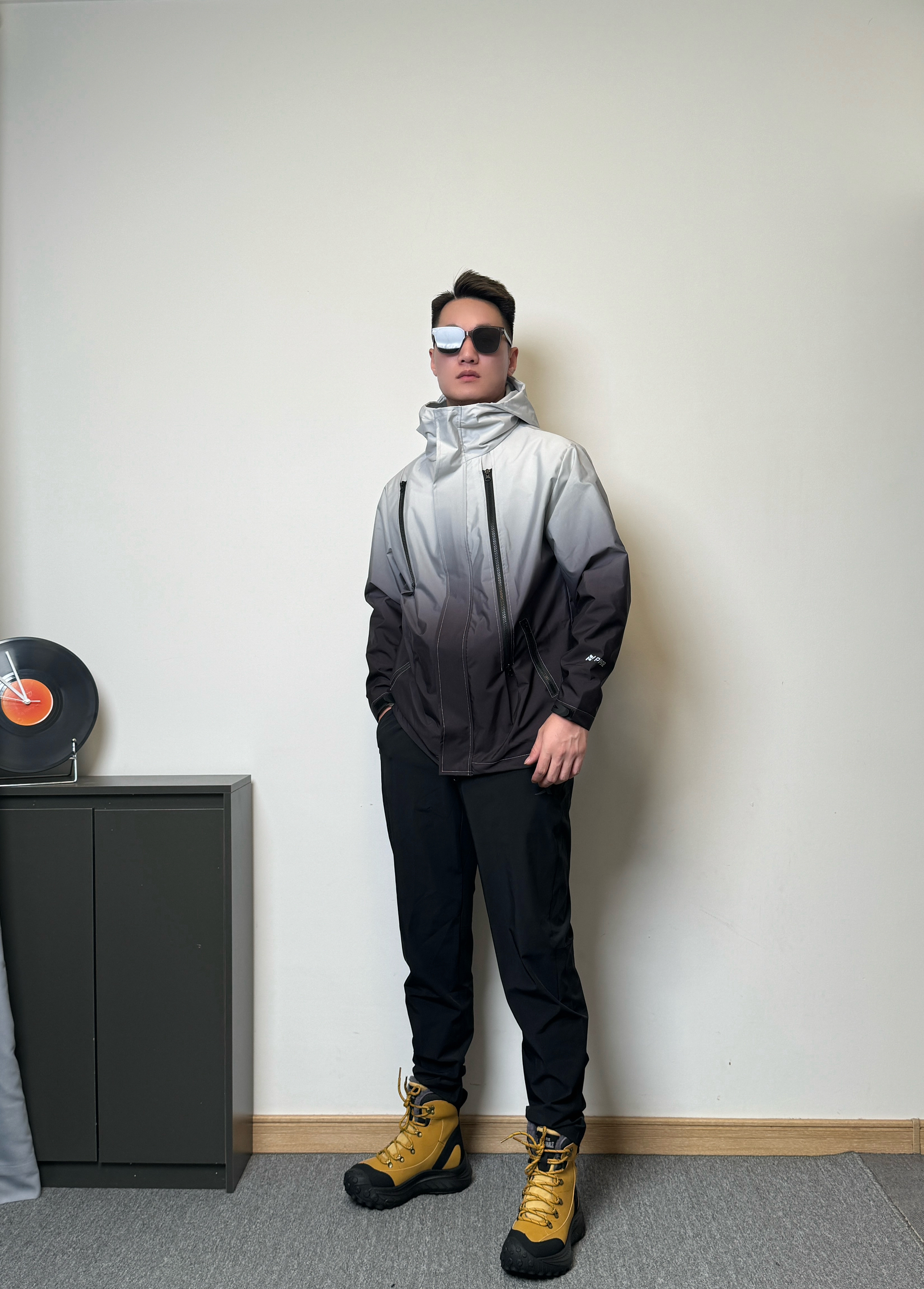 身高180,体重75!冬日这样搭配! 上身来件冲锋衣,黑白渐变色,时尚别致! 下身来条黑色直筒裤,休闲舒适! 鞋子是白马克华菲/FAIRWHALE 家的一款雪地靴,这简直是户外神器,颜值超高,黑灰配色设计,高级感满满!加绒加厚的设计,在下雪天也不会冻脚,而且鞋底防滑贼好,上脚脚感很好,不硌脚,还特别百搭,无论是运动裤还是工装裤都很帅! 太适合下雪天穿了!