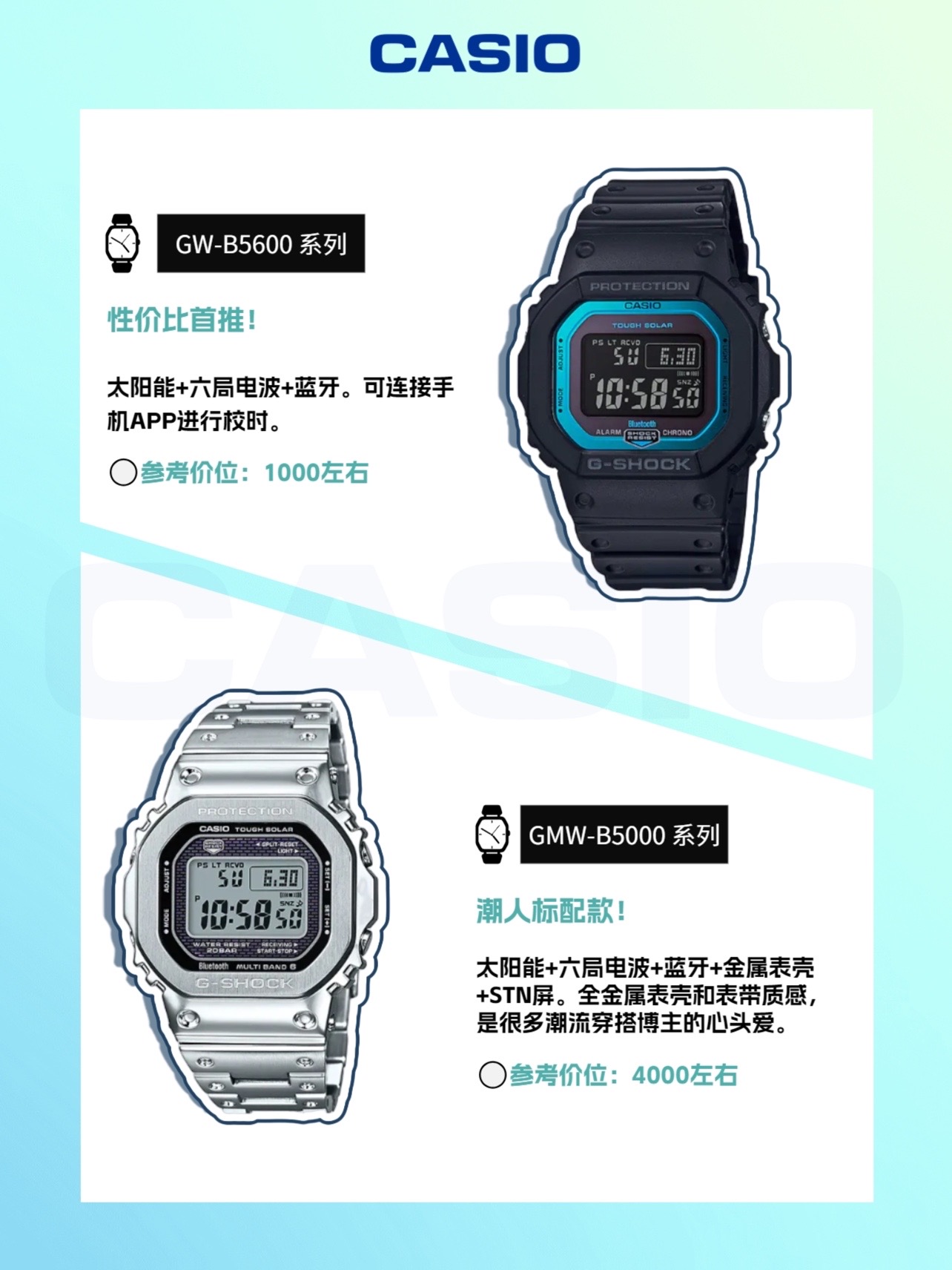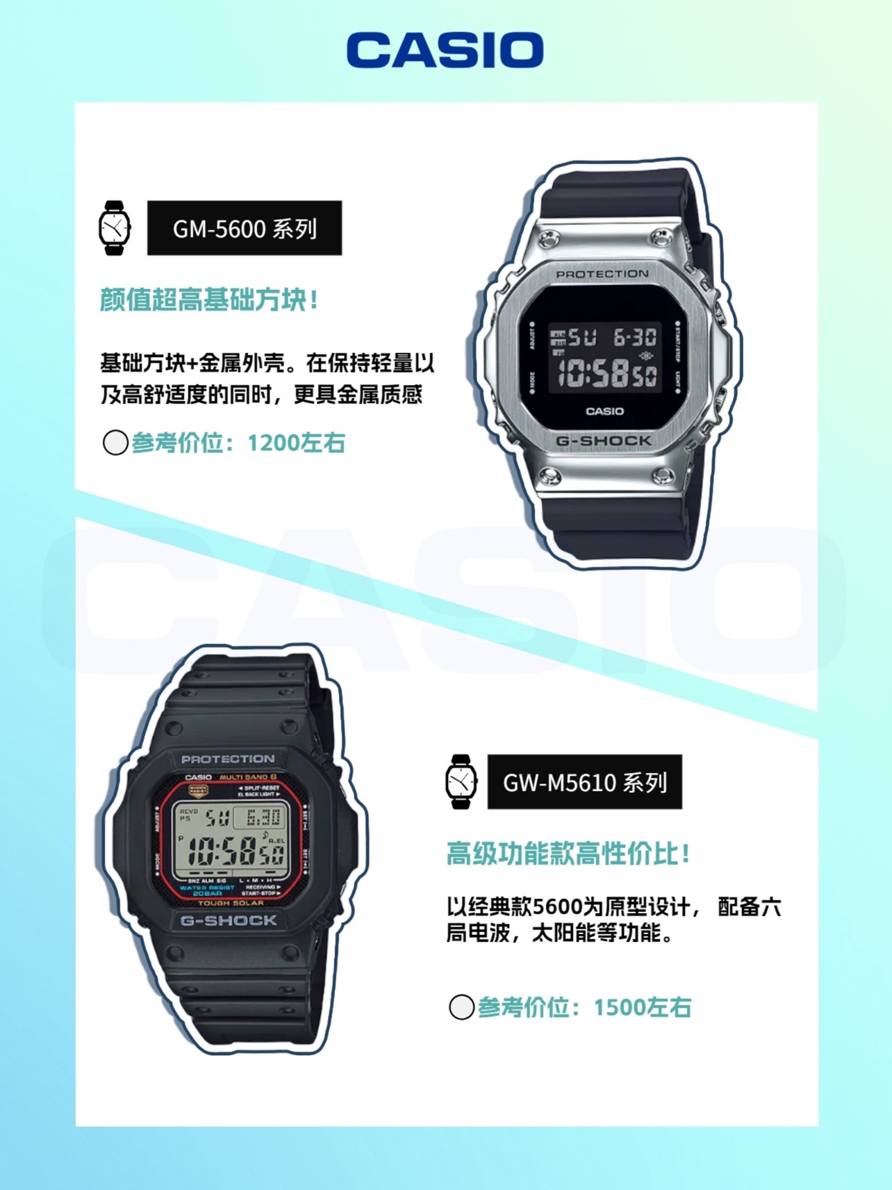 卡西欧小方块不用多说了吧!真的是经典中的经典,也是很多人入坑卡西欧手表的首选,但是系列这么多,到底怎么选?十一整理了超详细的干货,一起来看看吧!👀 DW-5600:最基础的小方块,具备防震、200米防水、倒计时、闹铃、世界时间等基础功能💪 G-5600:在DW-5600基础上进行升级,搭载太阳能动力,加入人造纤维,进行特殊防震处理🌞👊 GM-5600: 颜值超高基础方块! 在保持轻量以及高舒...