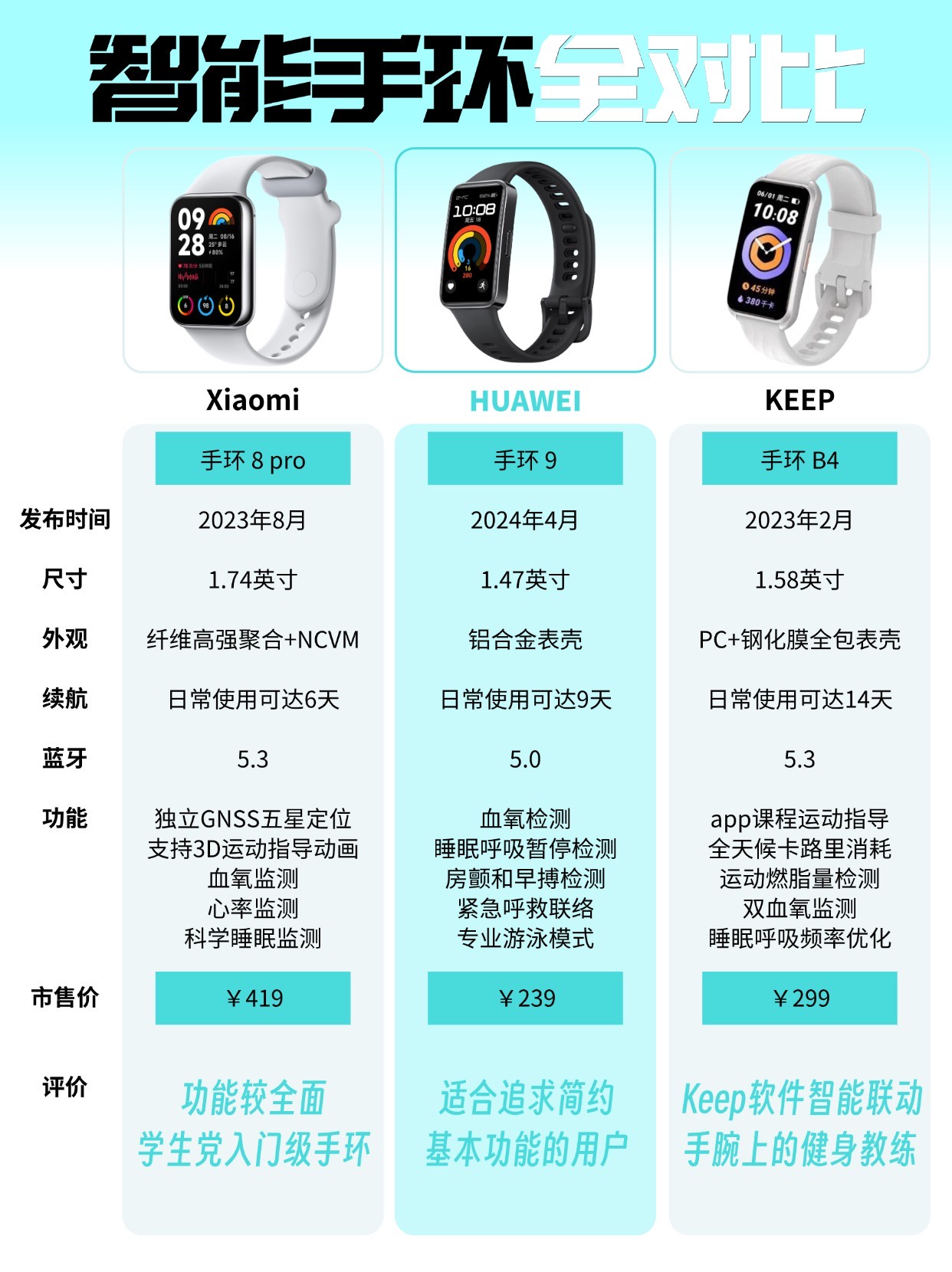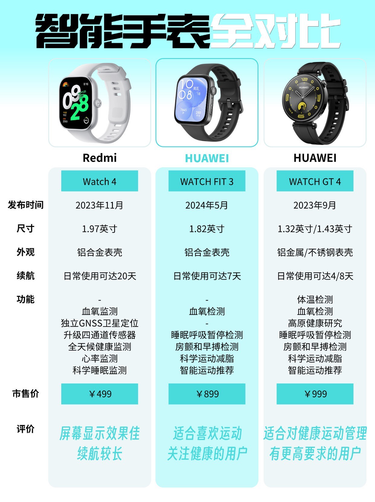 功能齐全的智能手表早就不仅仅是一块手表,在穿搭造型,身体数据监控等方面也发挥着重要作用,如果还不会选购智能手表,那块看下这篇笔记吧! 💁选购建议 目前市面上的手表/手环功能都越来越齐全了,大家可以根据自己需求(健康管理/运动健身/日常使用)来确定对应功能是否满足,此外手表续航、外观尺寸也是需要考虑到的; 1️⃣OPPO Watch 4 Pro:屏幕和续航较好,健康监测功能丰富; 2️⃣APPL...