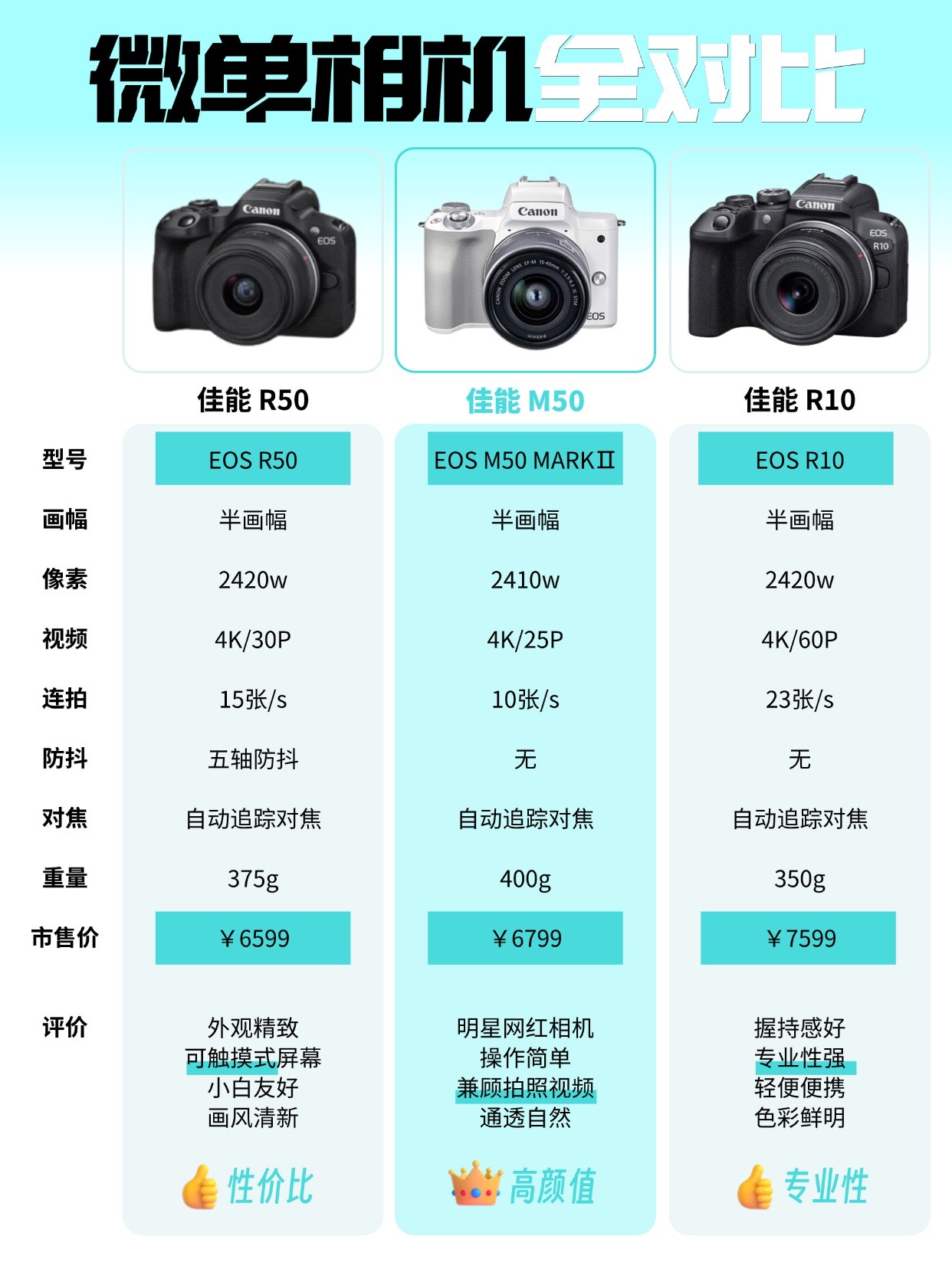 摄影爱好者们是不是在众多微单相机面前挑花了眼?不知道哪一款才最适合自己?市面上相机种类多样,性能复杂,让不少人在选入门微单相机时感到头大😵。别担心!今天给大家详细对比几款热门的微单相机🎥,帮助你做出明智的选择! 佳能 R50📷外观精致,可触摸式屏幕,小白友好,拍摄画风清新。 佳能 M50📷明星网红相机,操作简单,兼顾拍照视频,通透自然 佳能 R10📷握持感好,专业性强,轻便便携,色彩鲜明. 尼康...