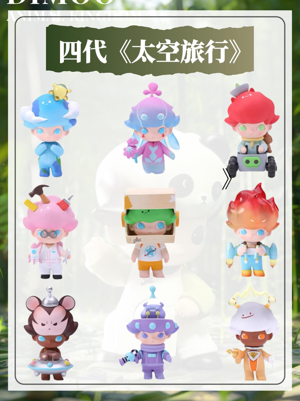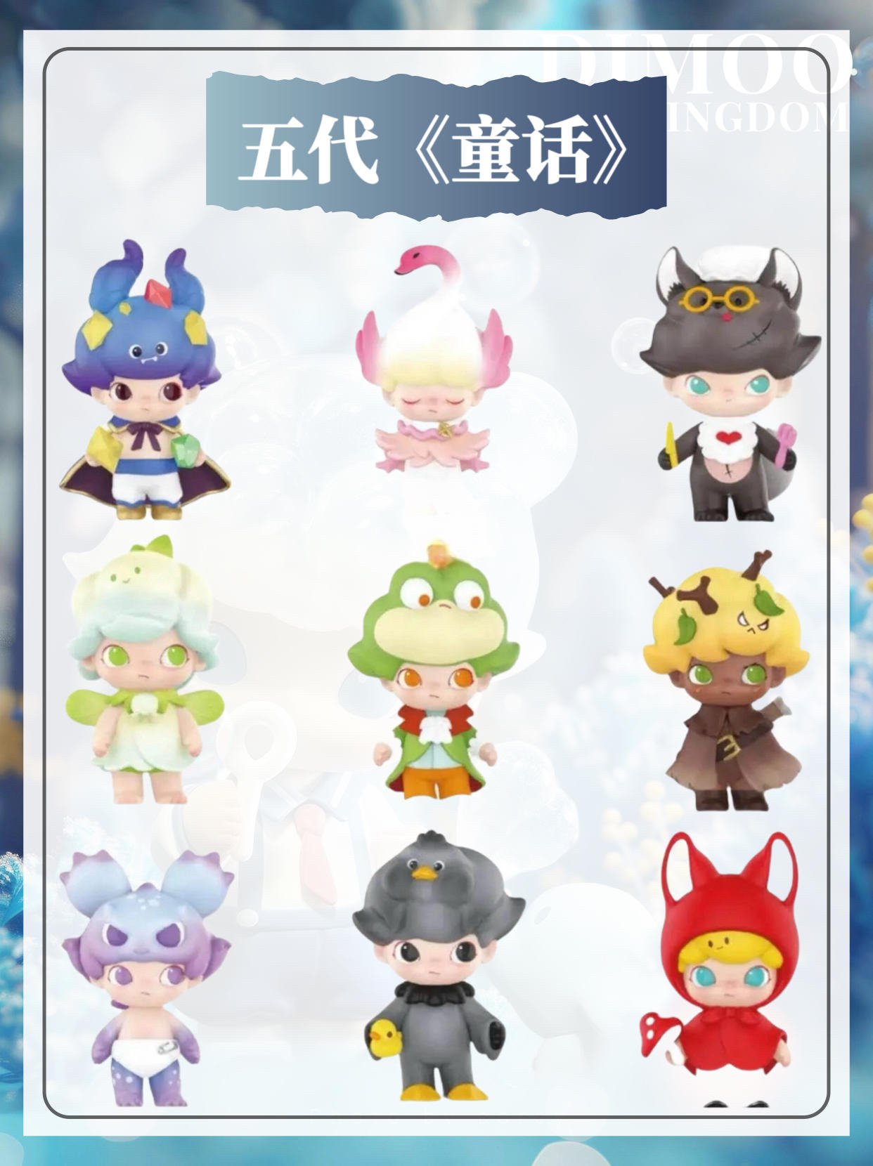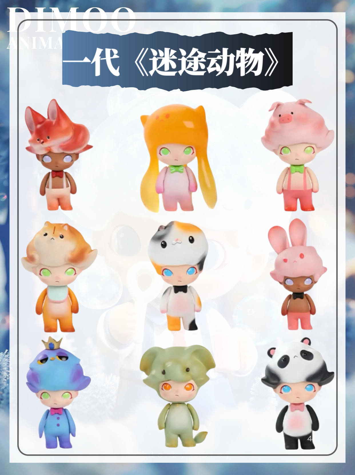 温馨提示:Dimoo系列共25代,本篇展示(1-8代) 一代《迷途动物》2019年8月10日 二代《午夜马戏团》2019年10月18日 三代《圣诞2019》2019年12月2日 四代《太空旅行》2020年3月7日 五代《童话》2020年5月15日 六代《社会大学》2020年9月16日 七代《圣诞2020》2020年10月21日 八代《星座》2021年2月12日