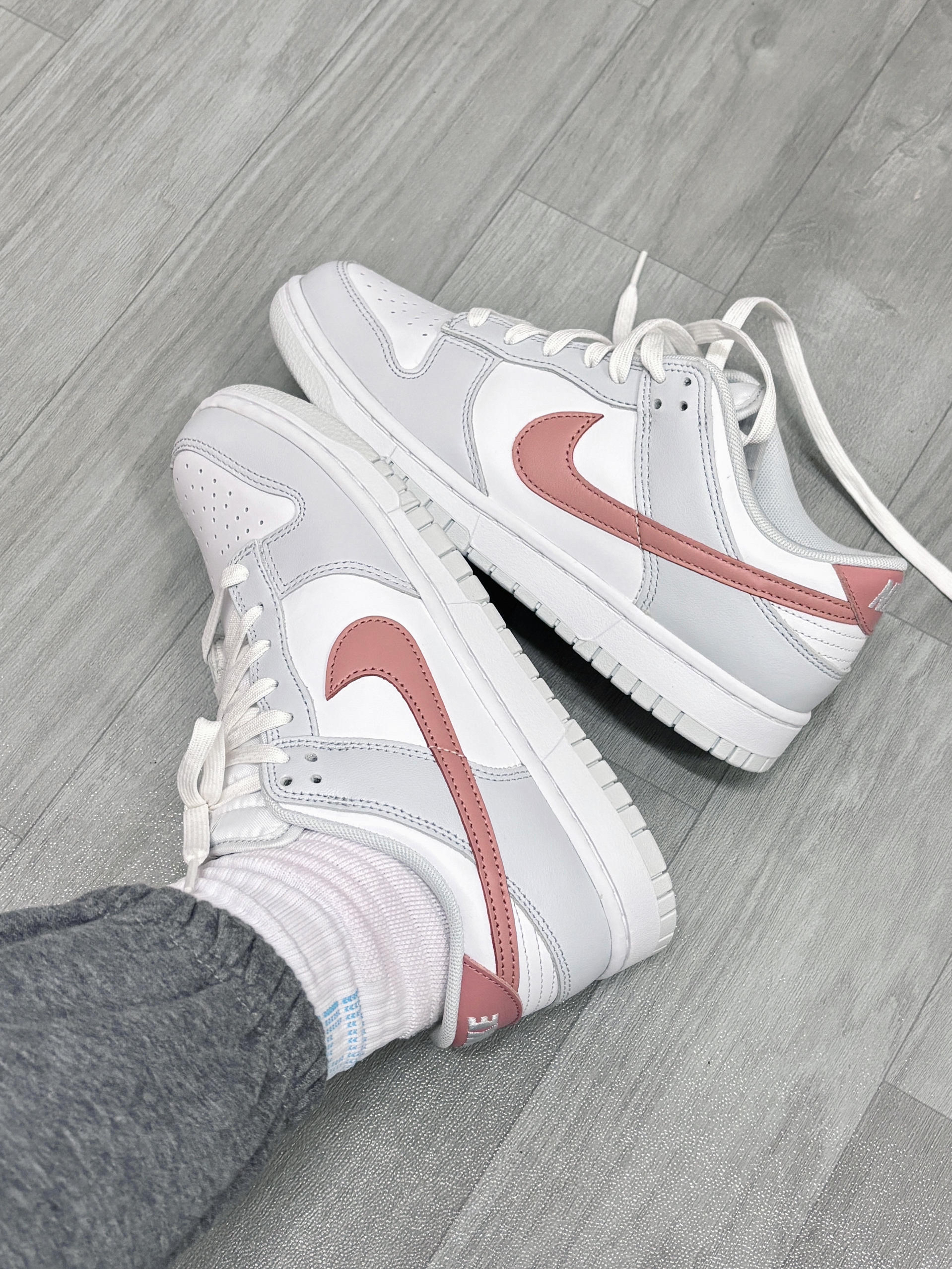 💁♂️:Hi~ 这里是大大纳mi~ 👟: Nike Dunk Low Retro低帮板鞋 我心中的满分dunk板鞋出现了🫰 白灰+浅红💗配色,高级又不会单调 男女都能穿,自带松弛感的鞋子 简单搭休闲裤牛仔裤👖就很耐看! 皮革鞋面不怕脏,清理起来容易 尺码方面建议大0.5码穿起来更舒服✅