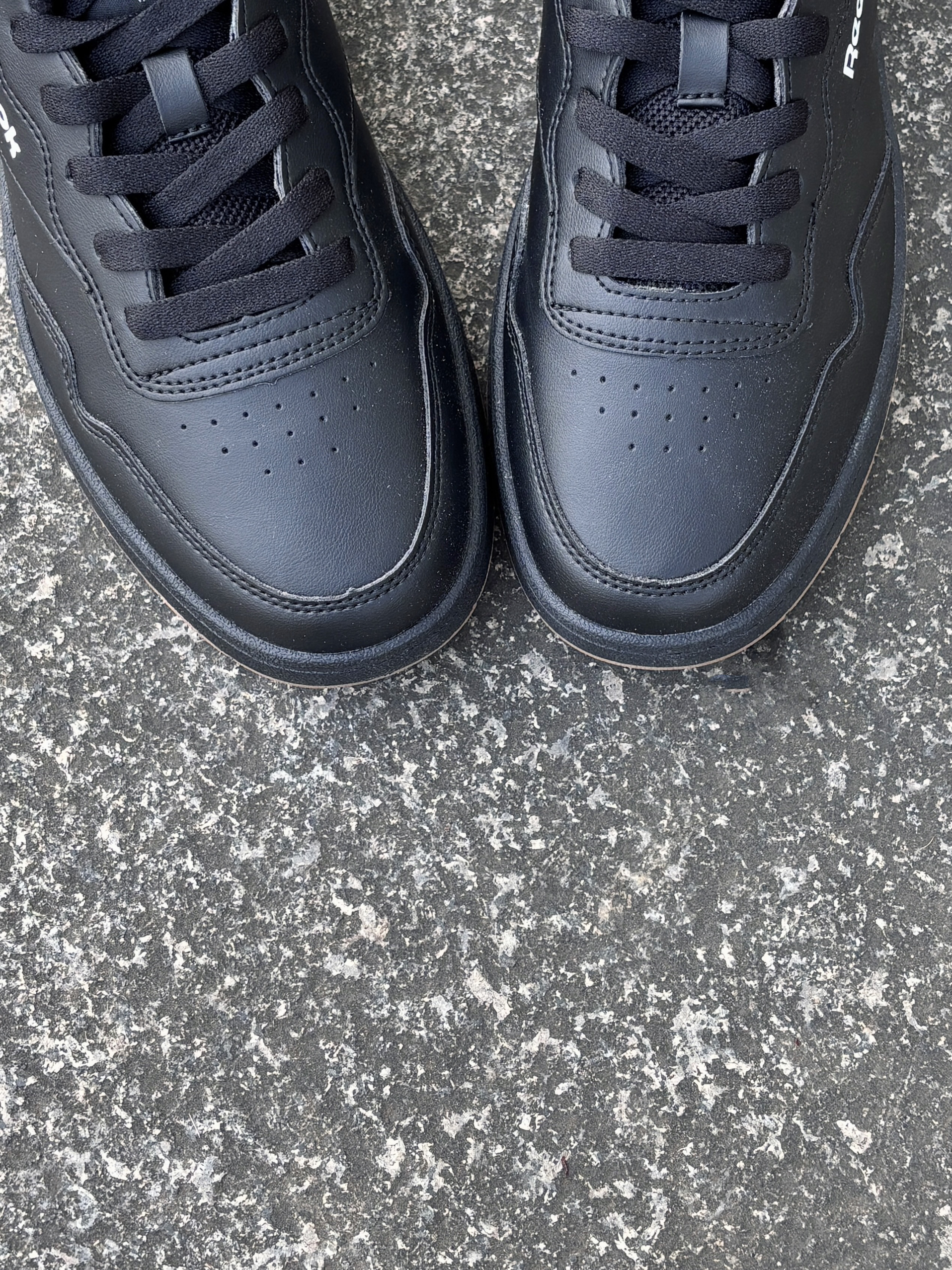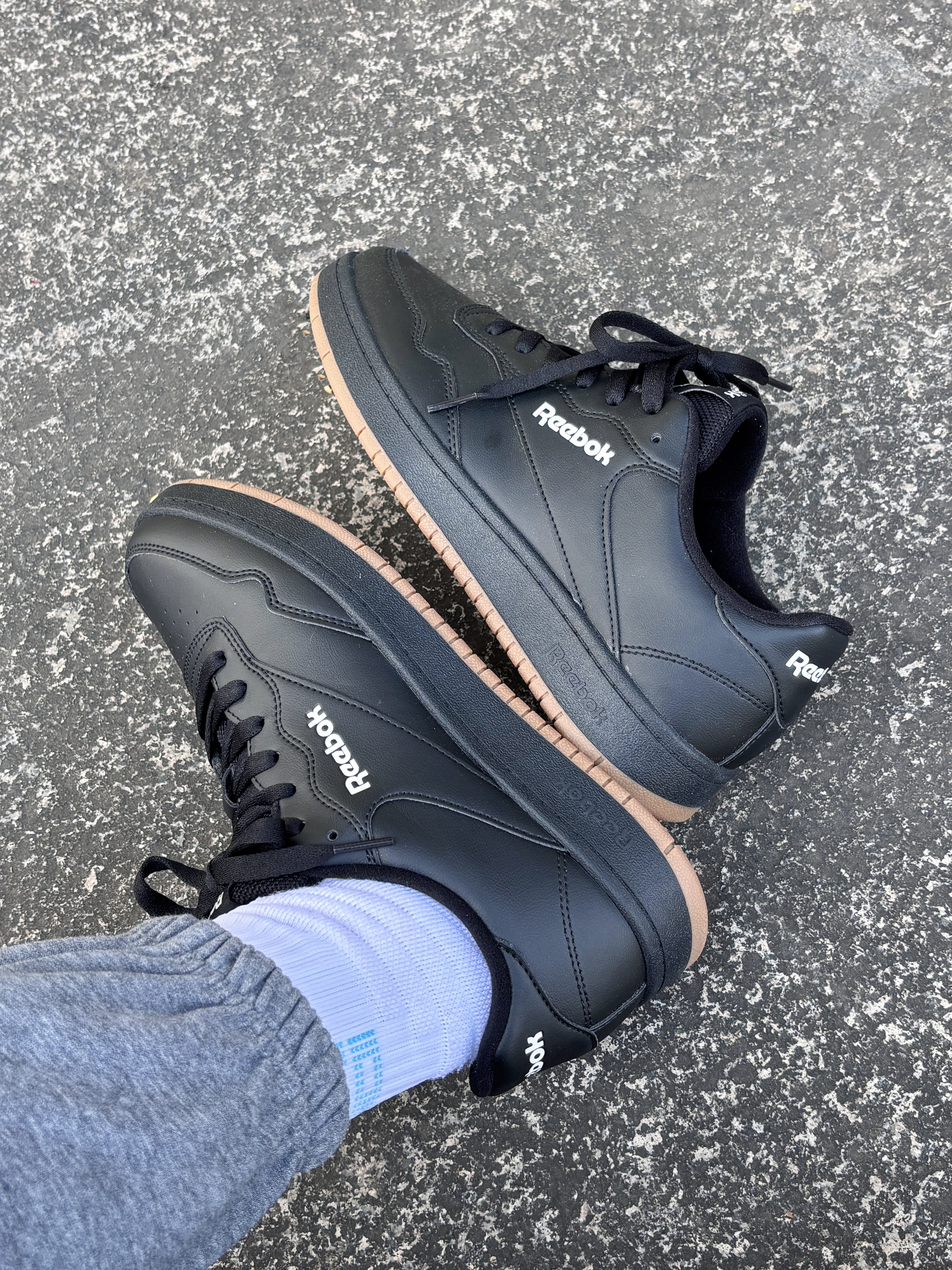 💁♂️:Hi~ 这里是大大纳mi~ 👟: Reebok COURT1000休闲板鞋 纯黑皮革鞋面➕生胶底的组合✔️ 除了复古氛围到位,质感颜值也在线 休闲裤牛仔裤或者小裙子👗都能搭 上班和通勤穿起来Jio感蛮软乎 另外就是方便打理,脏了湿纸巾能搞定! 尺码不偏码,正常选择就可以✅
