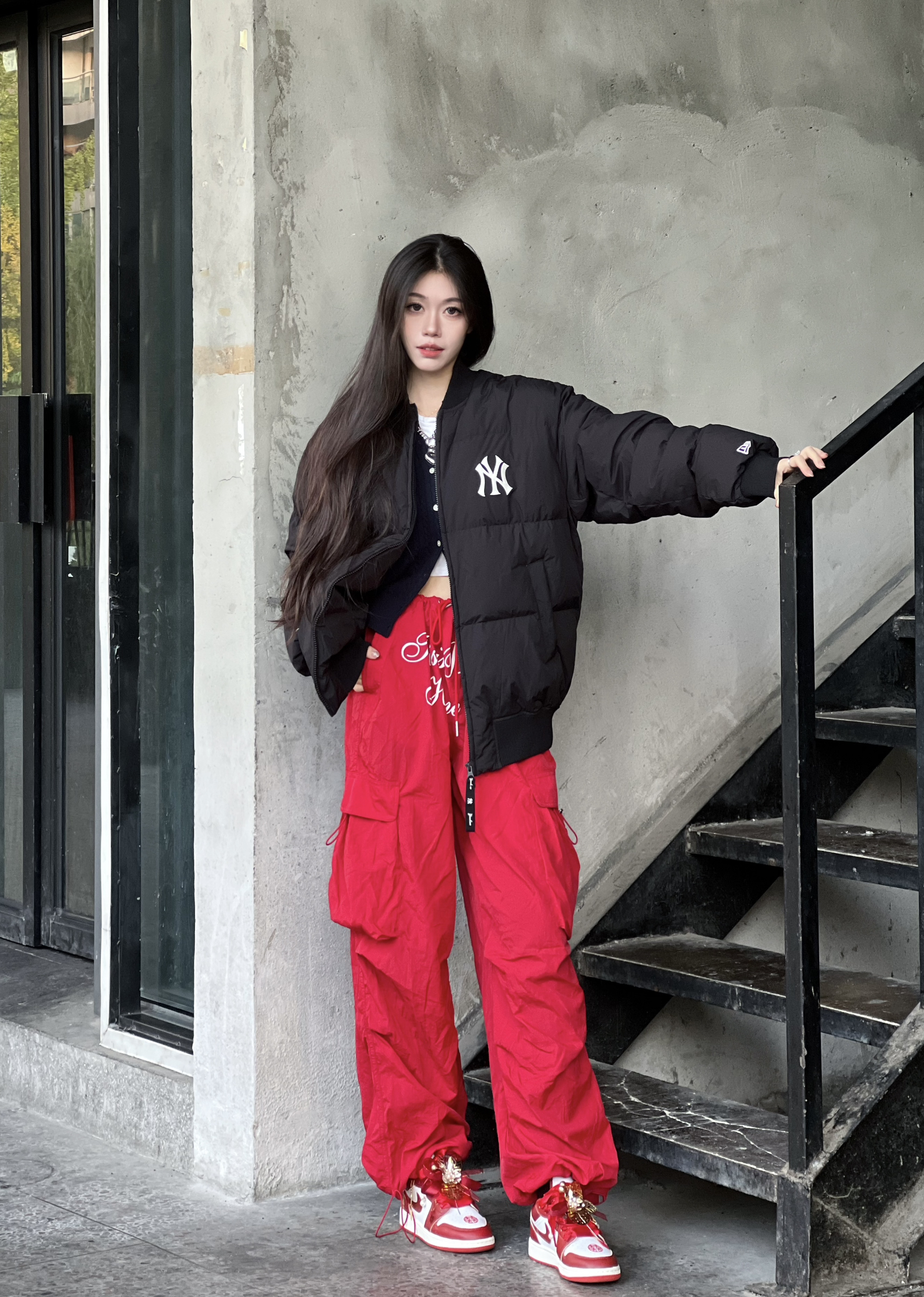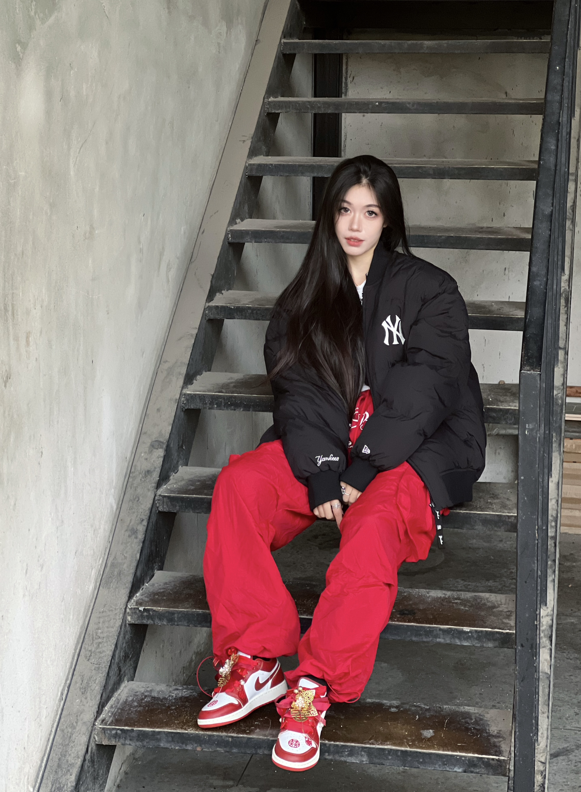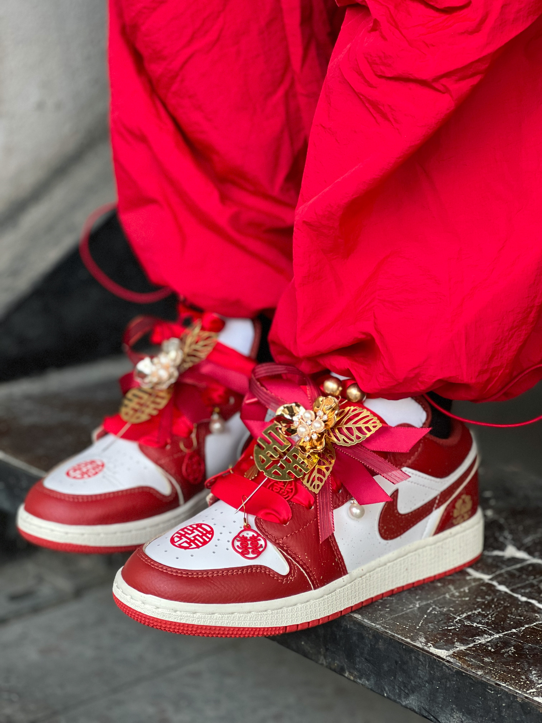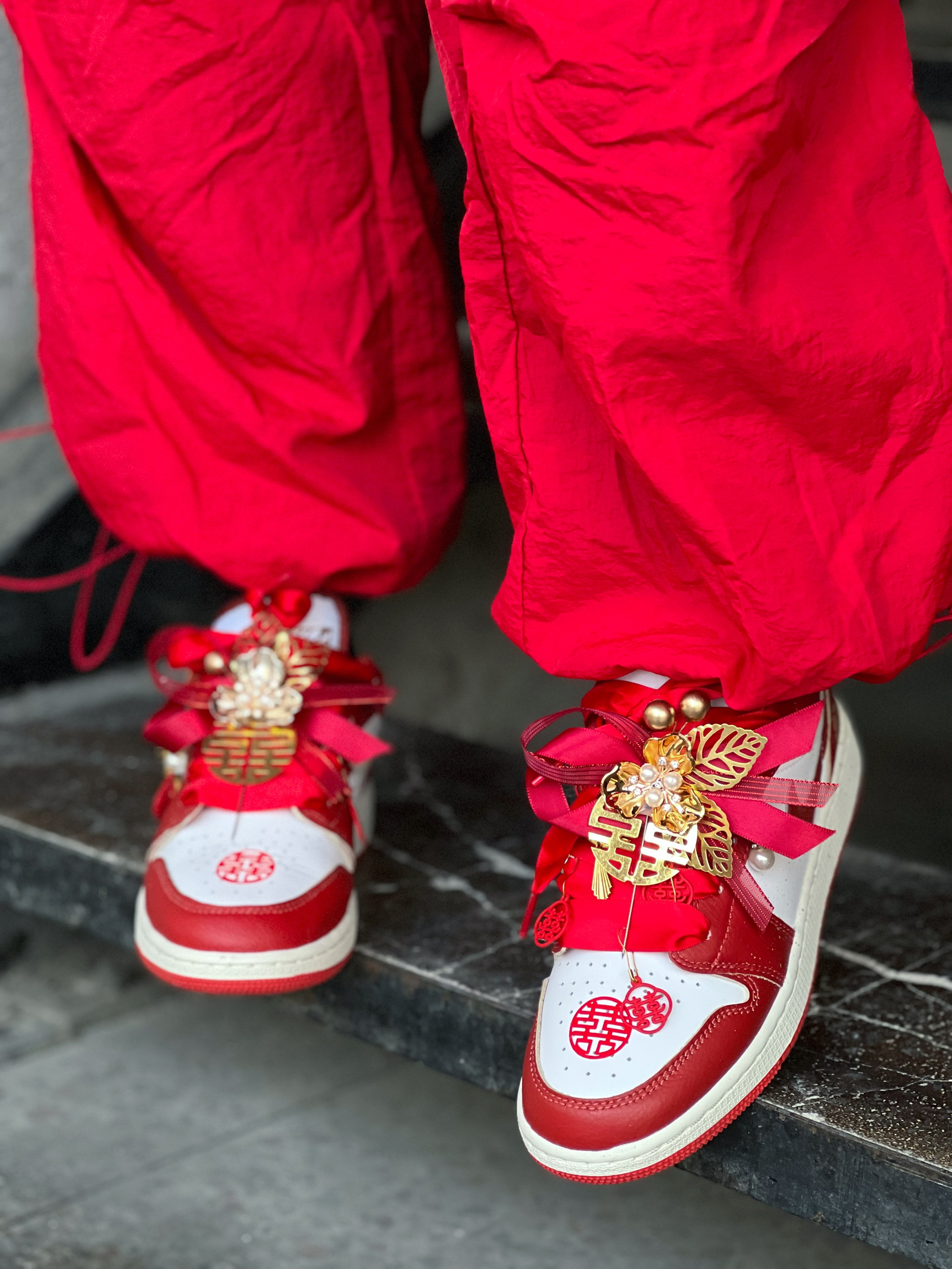 一降温就想穿的鲜艳一点 今天的穿搭是👉 黑色羽绒棒球服➕红色工装裤 搭配了一双DIY的AJ1 有很多精致的中国风挂件 🌺 红白色的搭配日常穿也hin好看 结婚的话还可以拿来当婚鞋也非常的合适的哦 🎎