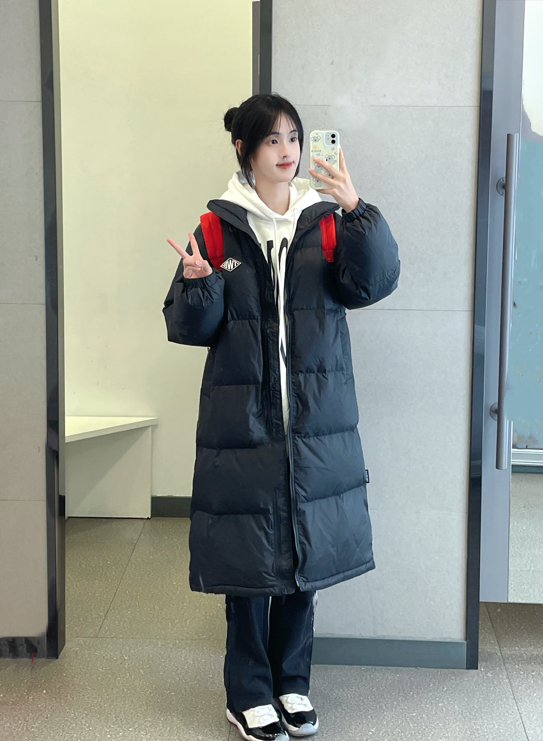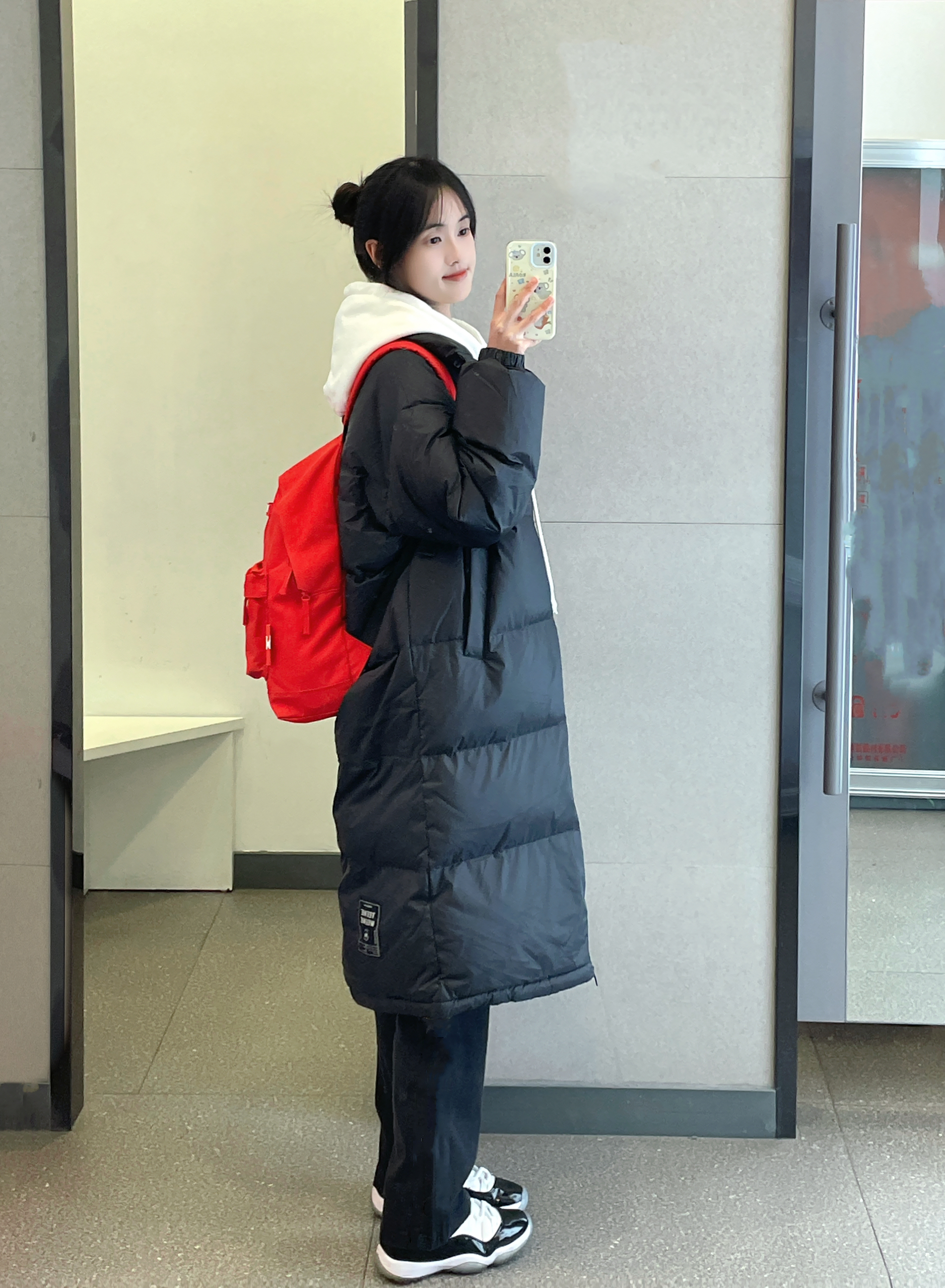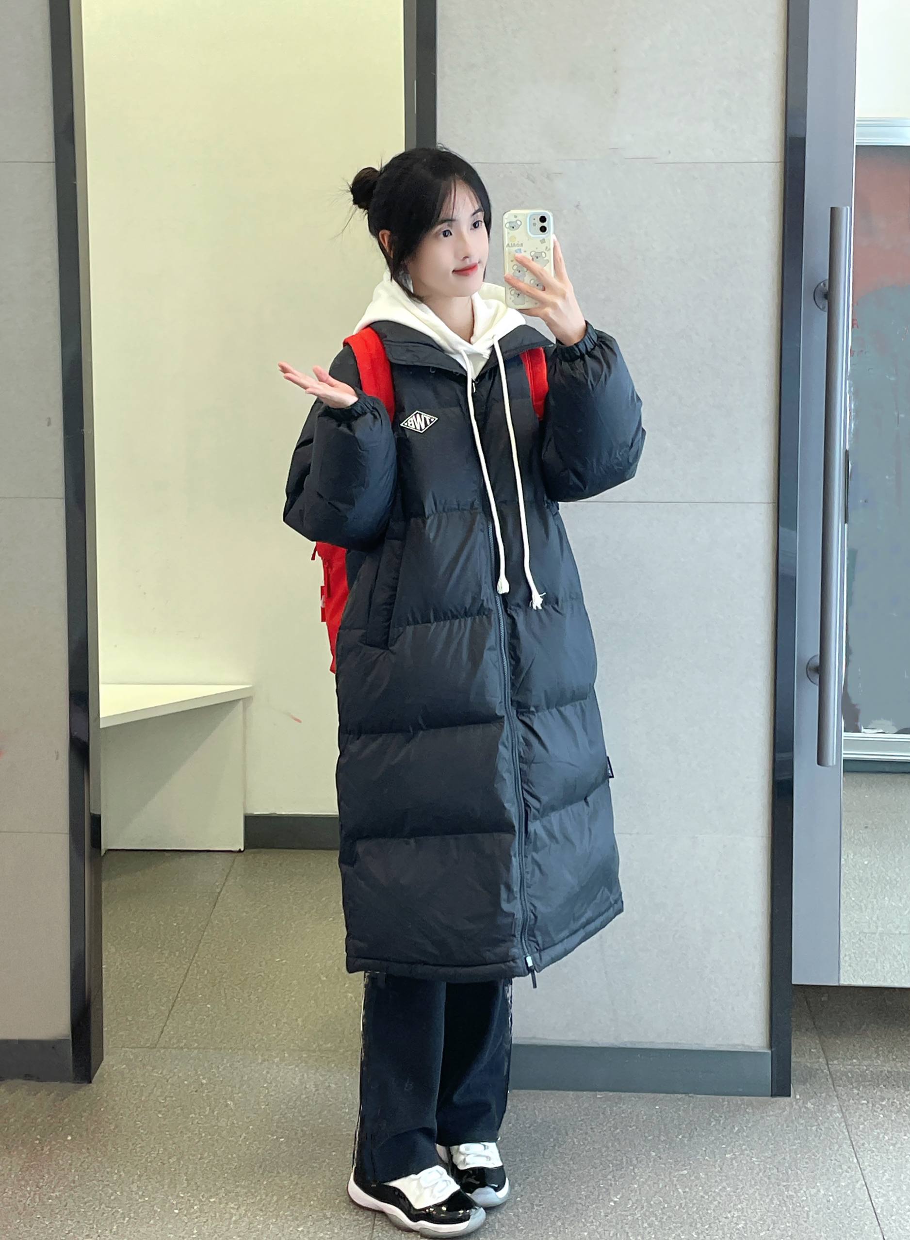 👔 :teenie weenie黑色长款羽绒服 🎒 :Kappa红色书包 👟 :aj11康扣