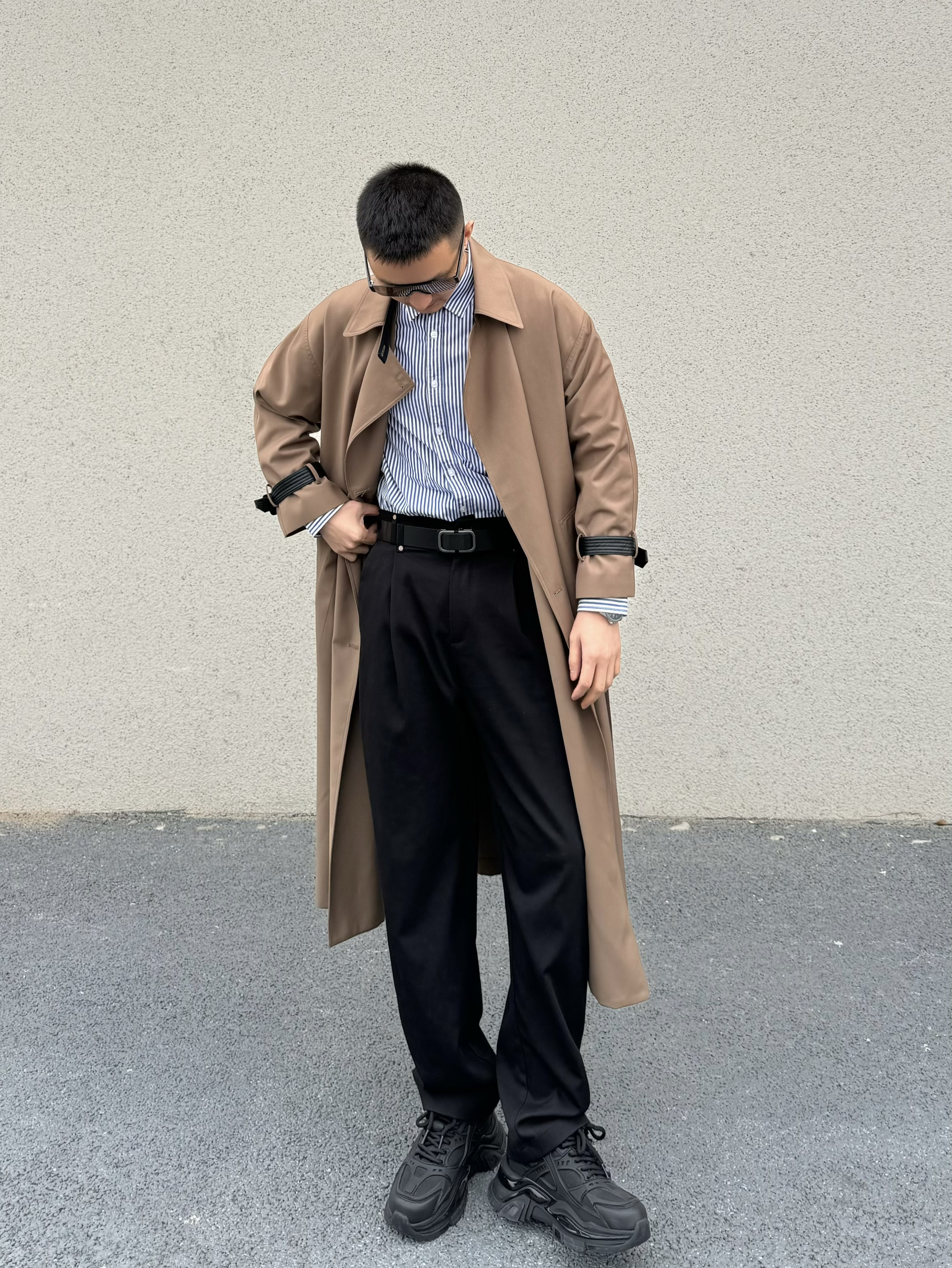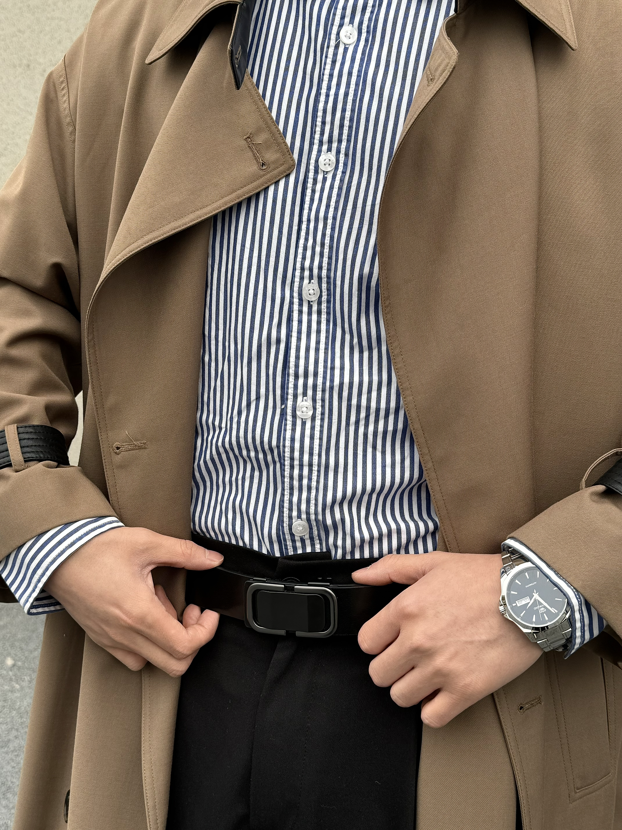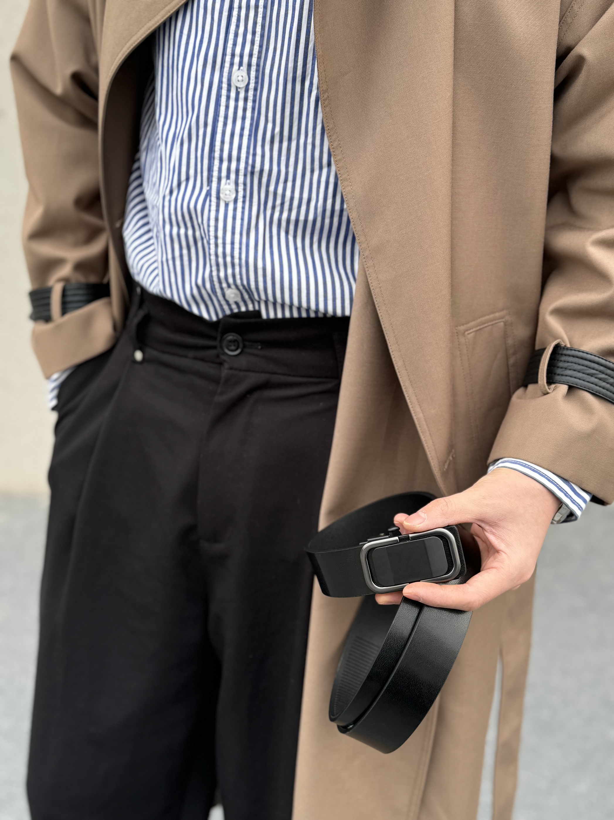 上身长款大风衣 垂感不易起皱 质感细腻 宽松的版型 松弛感一下子就上来啦 内搭一件条纹衬衫 气质感拉满 下身搭配一条直筒休闲裤 垂感面料 显高显瘦 今天的搭子是黑色的小皮带 整体是黑色的比较时尚百搭 无牙的卡扣设计 满满的高级感 通勤休闲商务都很适配哦 再搭配一双休闲鞋 脚感柔软舒适 帅气出门吧!