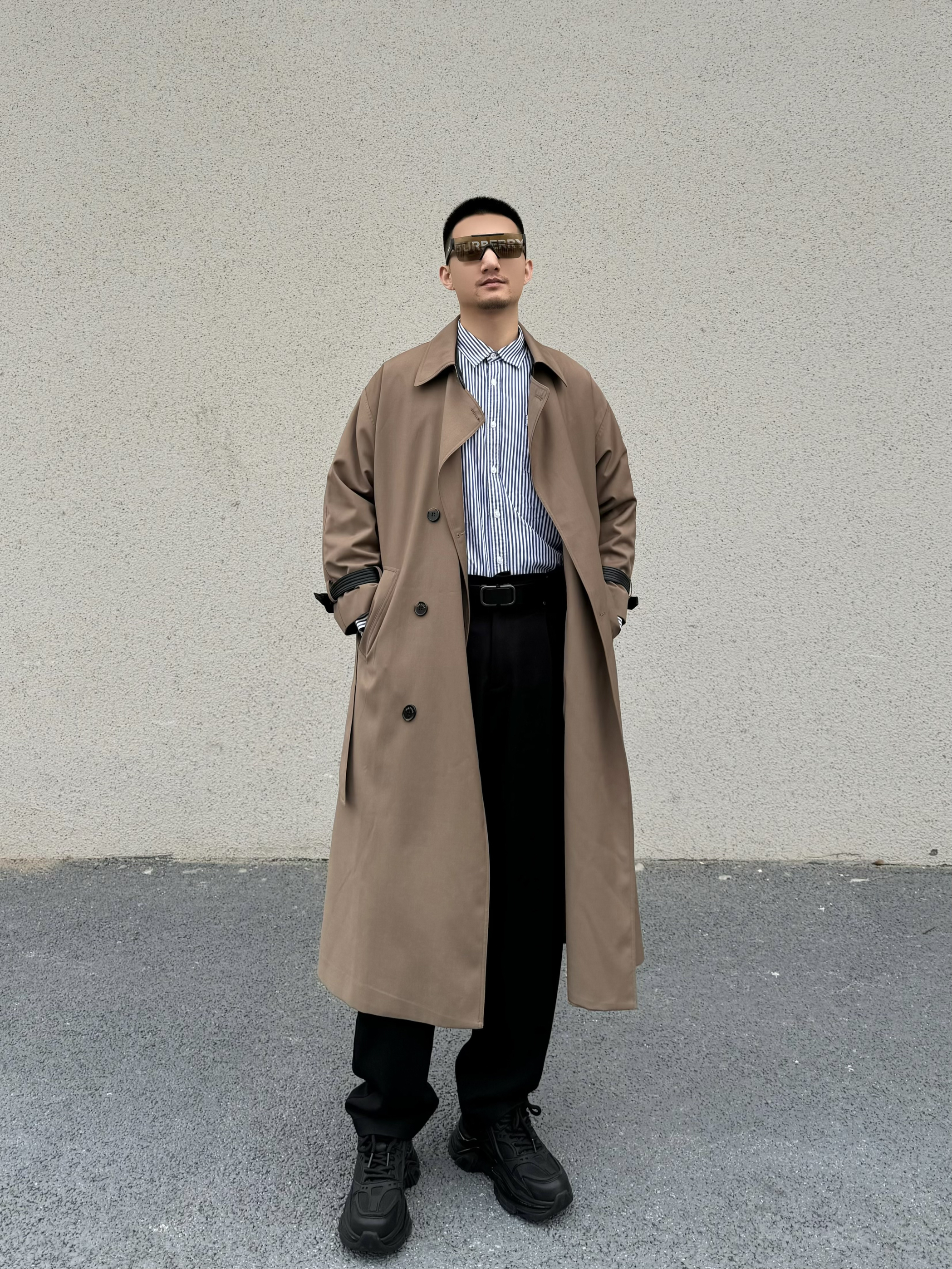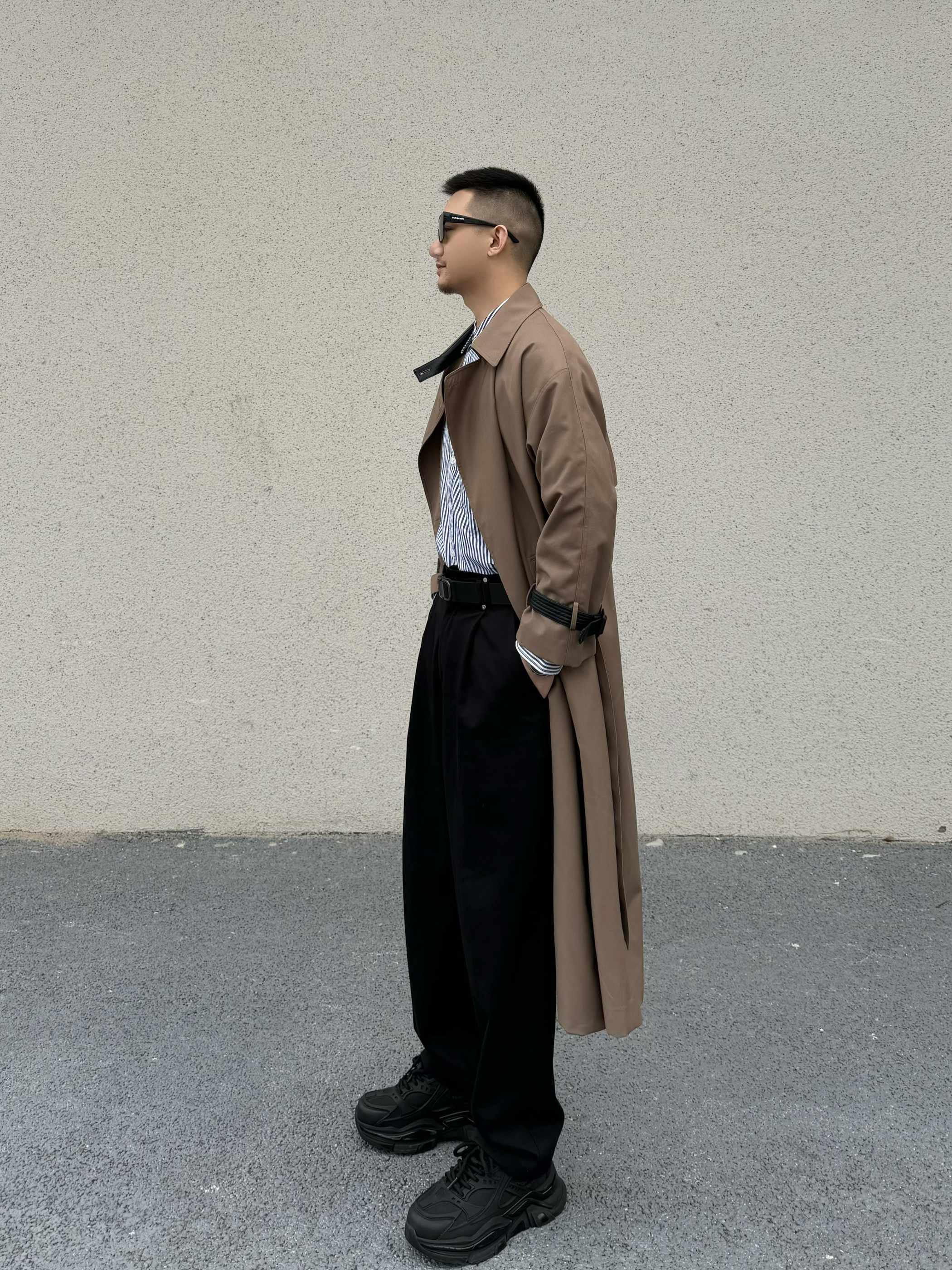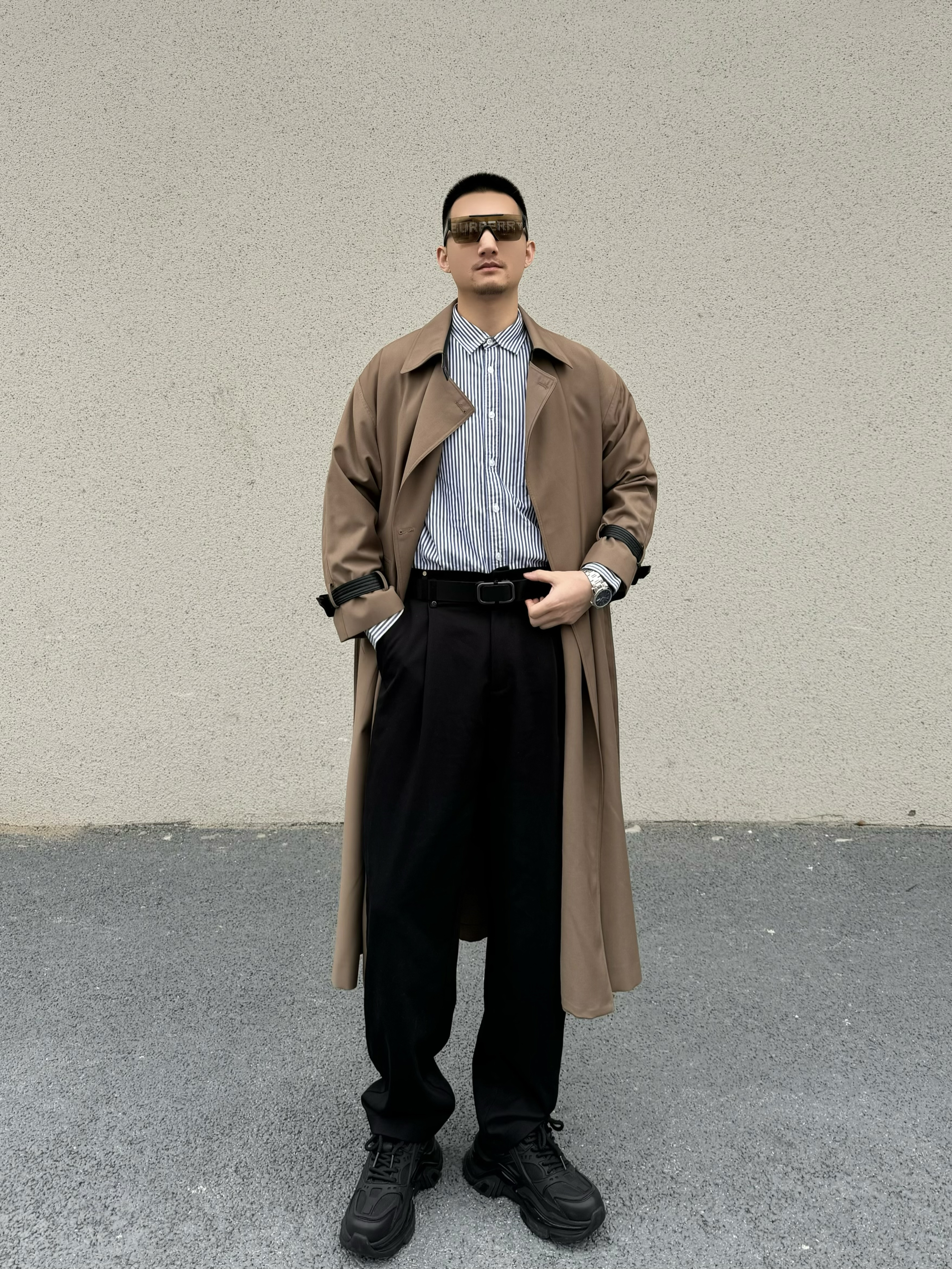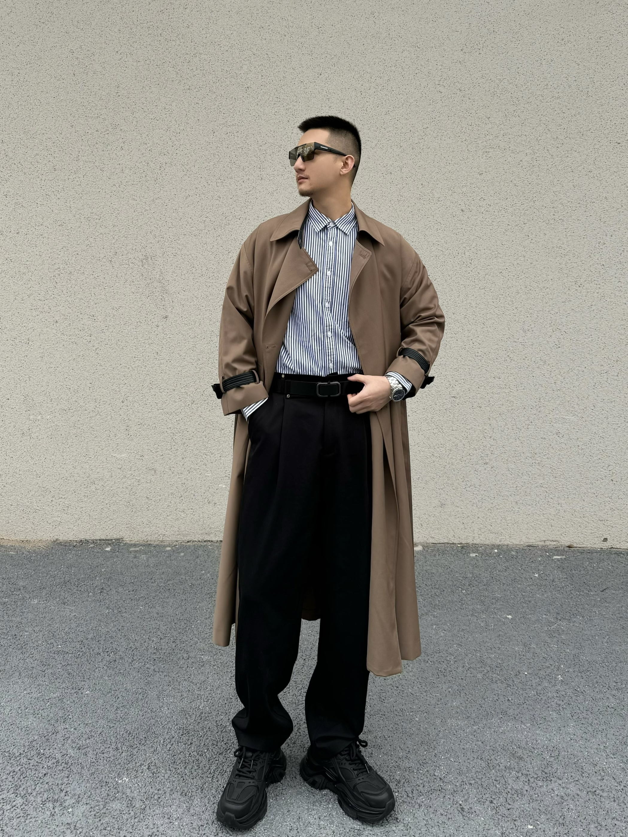 上身长款大风衣 垂感不易起皱 质感细腻 宽松的版型 松弛感一下子就上来啦 内搭一件条纹衬衫 气质感拉满 下身搭配一条直筒休闲裤 垂感面料 显高显瘦 今天的搭子是黑色的小皮带 整体是黑色的比较时尚百搭 无牙的卡扣设计 满满的高级感 通勤休闲商务都很适配哦 再搭配一双休闲鞋 脚感柔软舒适 帅气出门吧!
