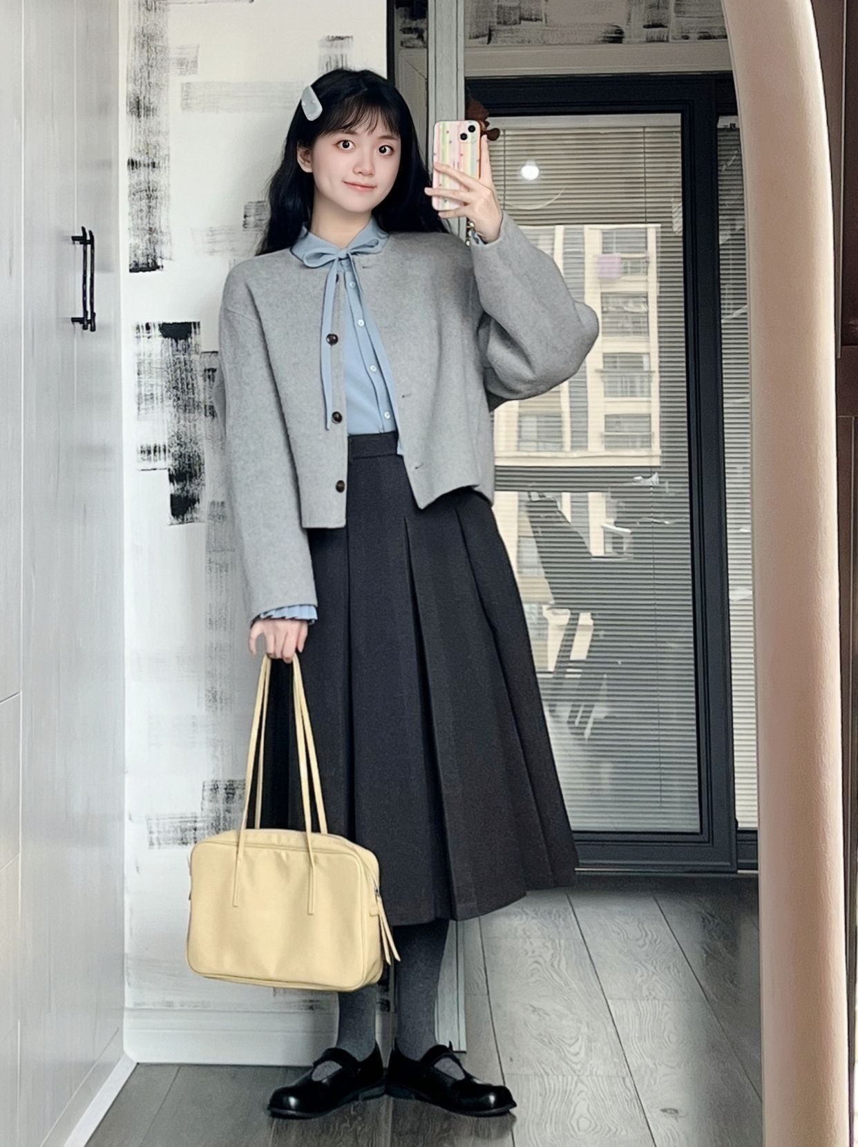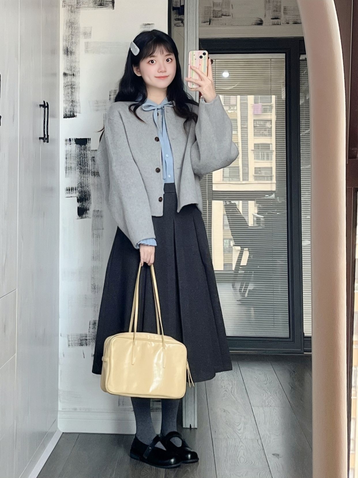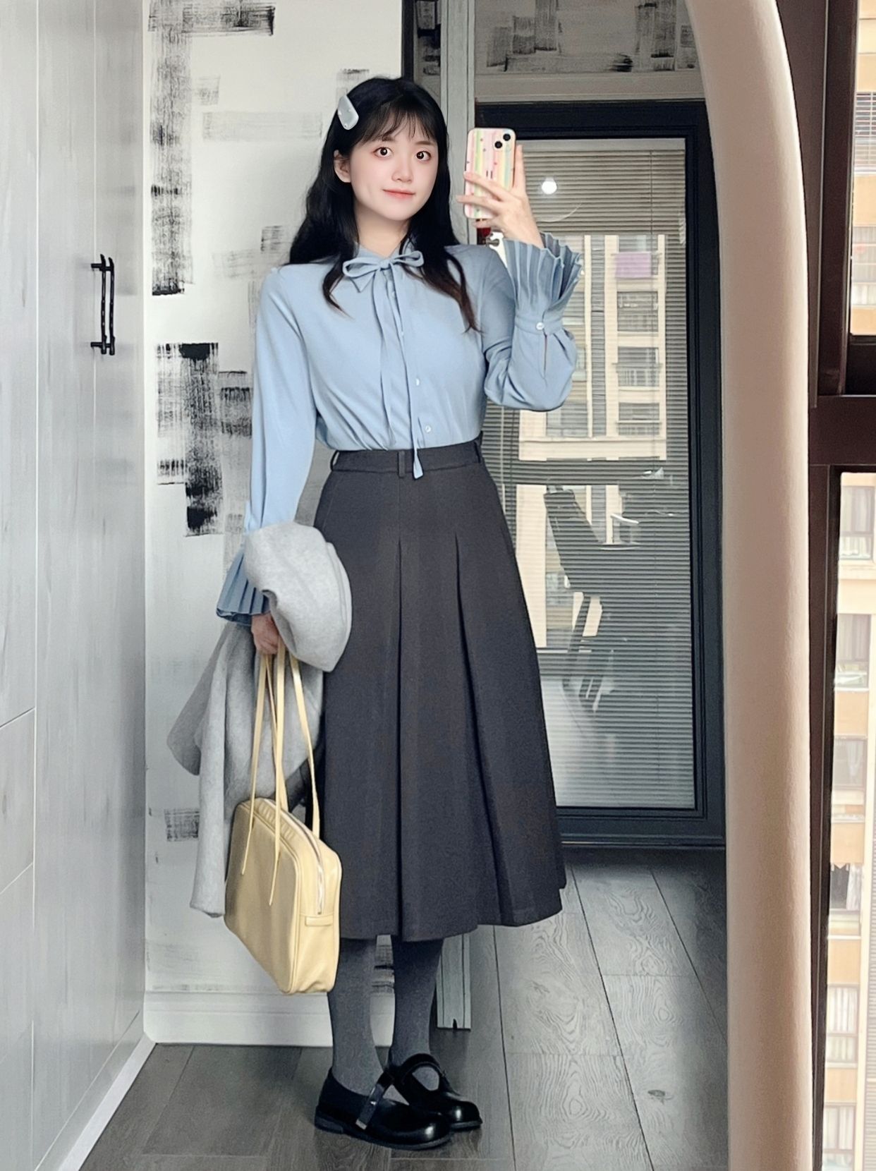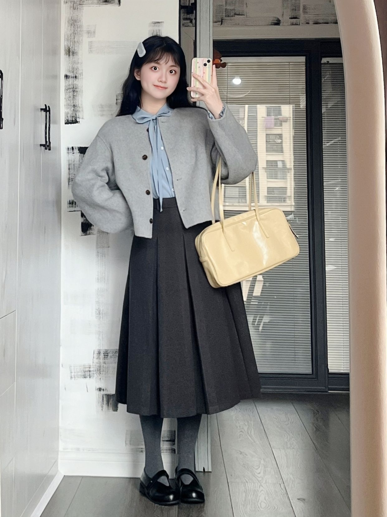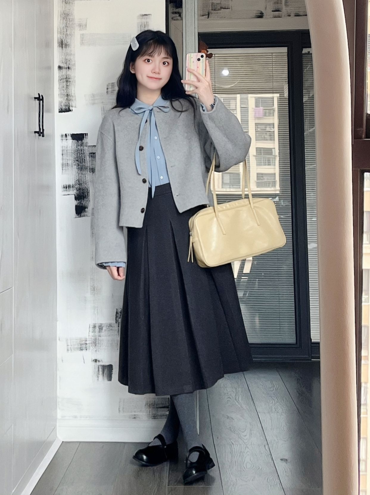 虽然又是工作日💼通勤也要敲精致!! 怕冷星人就是不露腿!主打一个敲保暖! 浅灰色大衣还蛮宽松,可以塞大毛衣的那种诶 深灰色百褶裙长度刚刚好,敲遮胯显瘦! 灰蓝色衬衫就是敲温柔显白! 还有点小miu氛围感!简约精致温柔还敲有范! 通勤保暖不露腿,这么穿就对啦!