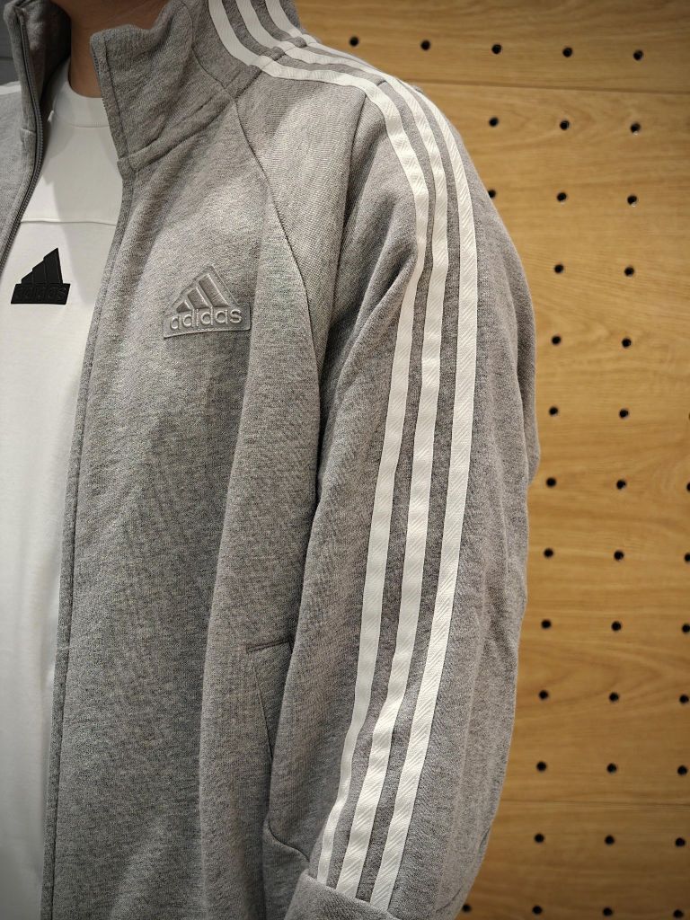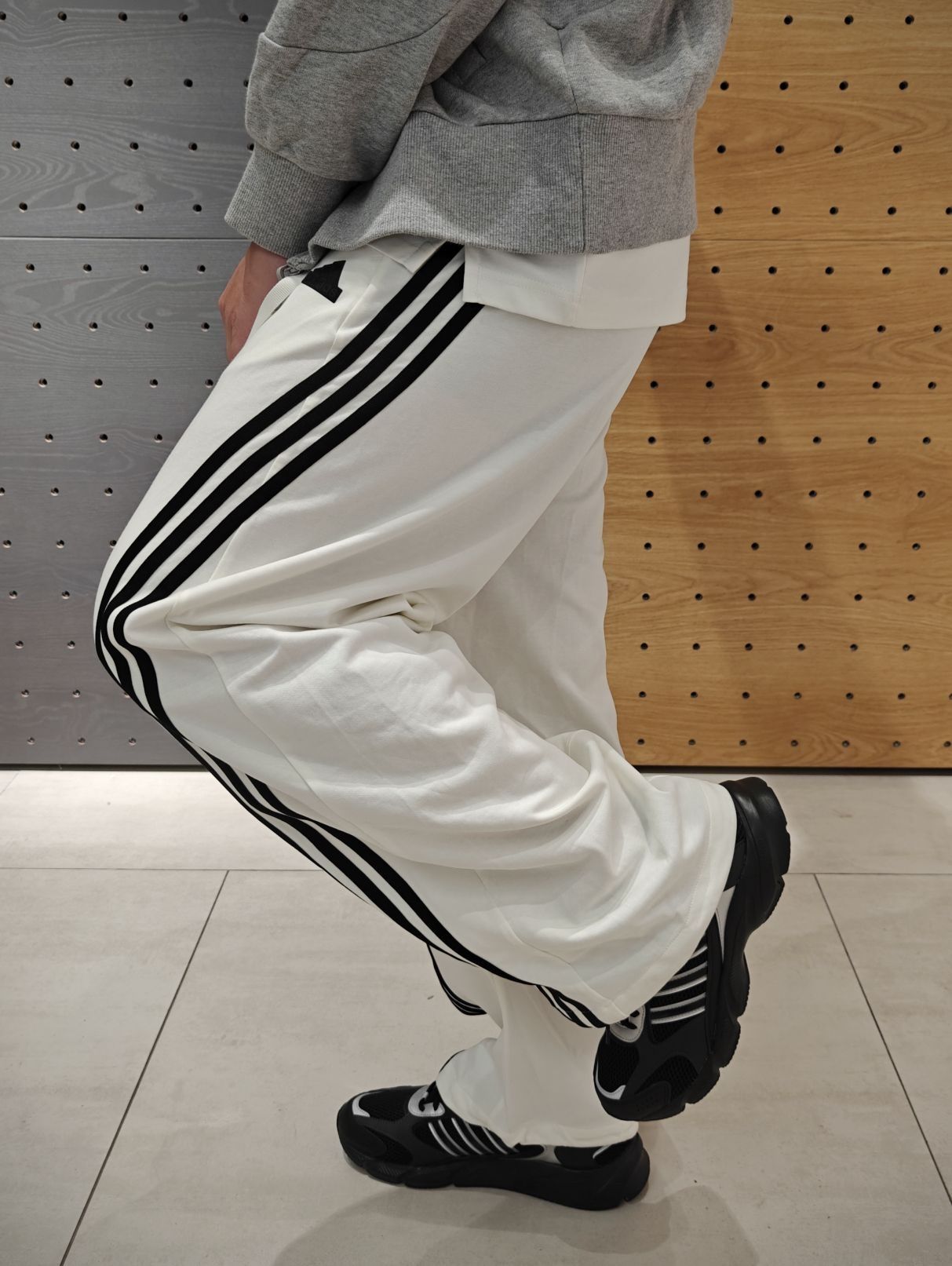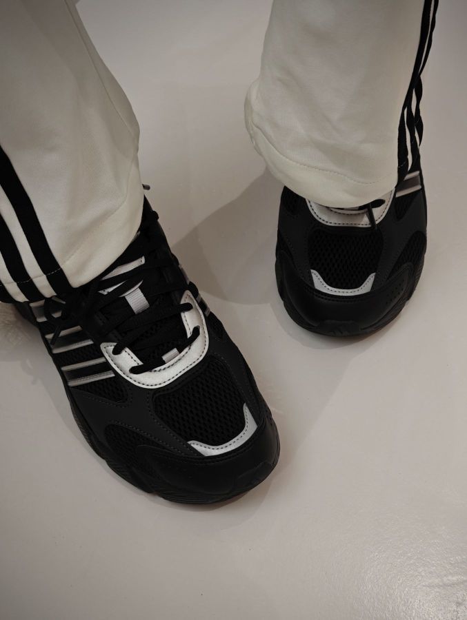 今天是三道杠元素拉满的一天 灰色的三道杠外套,棉质无帽小立领,完全就是职场通勤神器,上下班无障碍。 白色的香蕉裤,看腻了直直的三道杠,看这个扭曲的三道杠也别有一番风味。 CRAZYCHAOS 2000,黑银配色,帅到我的心窝了,脚感舒适而且自带的小增高,裤脚一盖画面太美了。