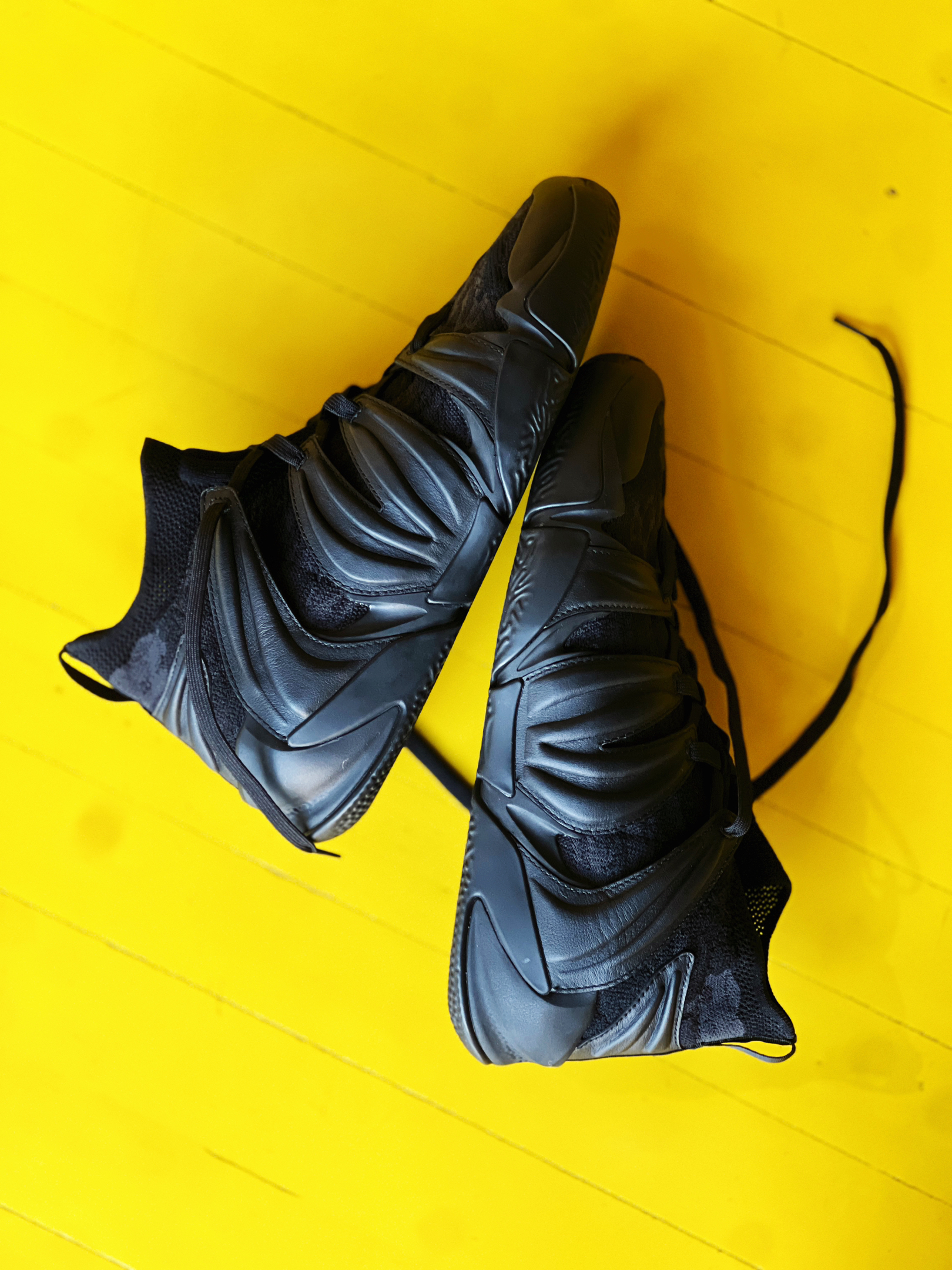 能够坚持不随波逐流的精神,是当下篮球鞋大环境里的一股清流! 上脚以后我是 45 的窄脚型 低脚背 扁平足 我穿 45 的鞋正合适,尺码正常不偏码,鞋楦做的正常标准,再加上鞋身大面积编织的材料,所以对脚型的宽容度很高,只要不是超级大宽脚都没问题,由于是袜套式的风格所以高脚背建议试穿一下,可能会压脚背!静态穿着的时候呈现出前低后高的重心感受,自然流畅不过分,整体重心算是偏低的类型,场地感还是...