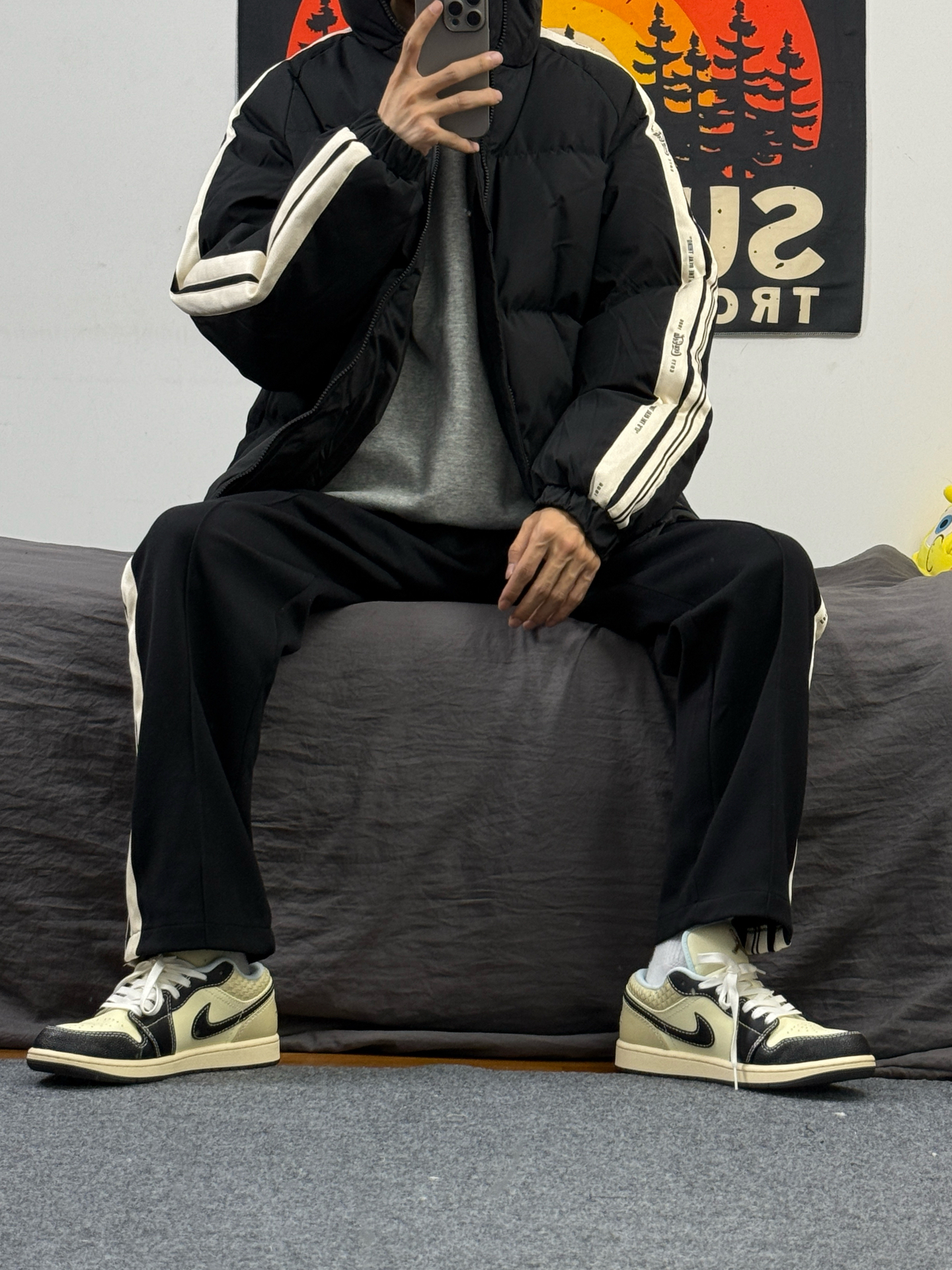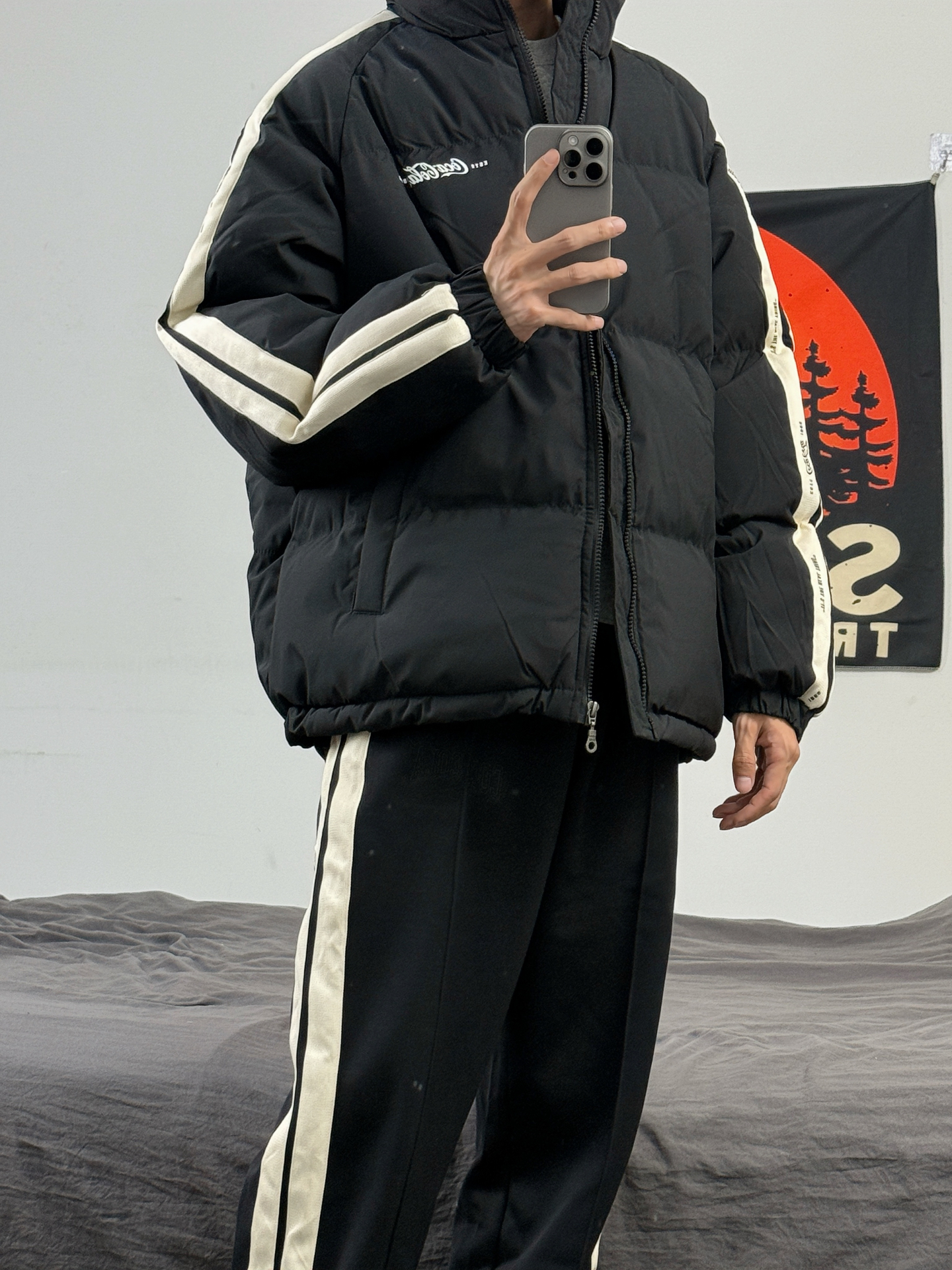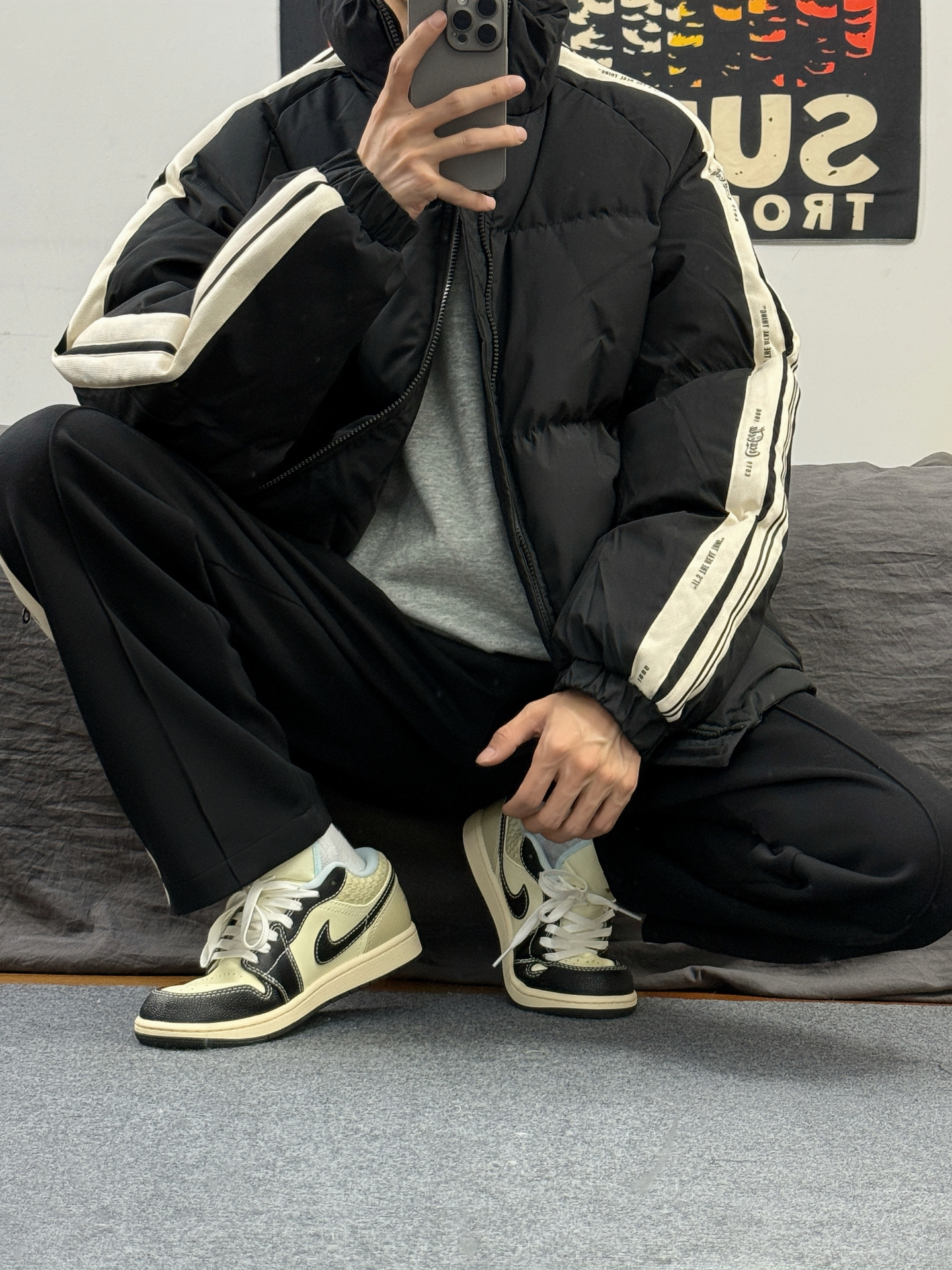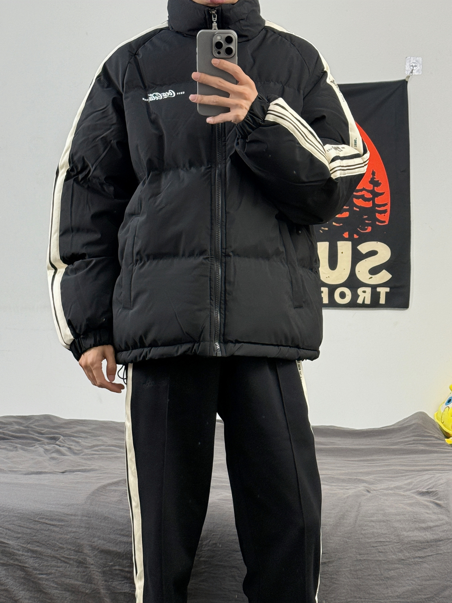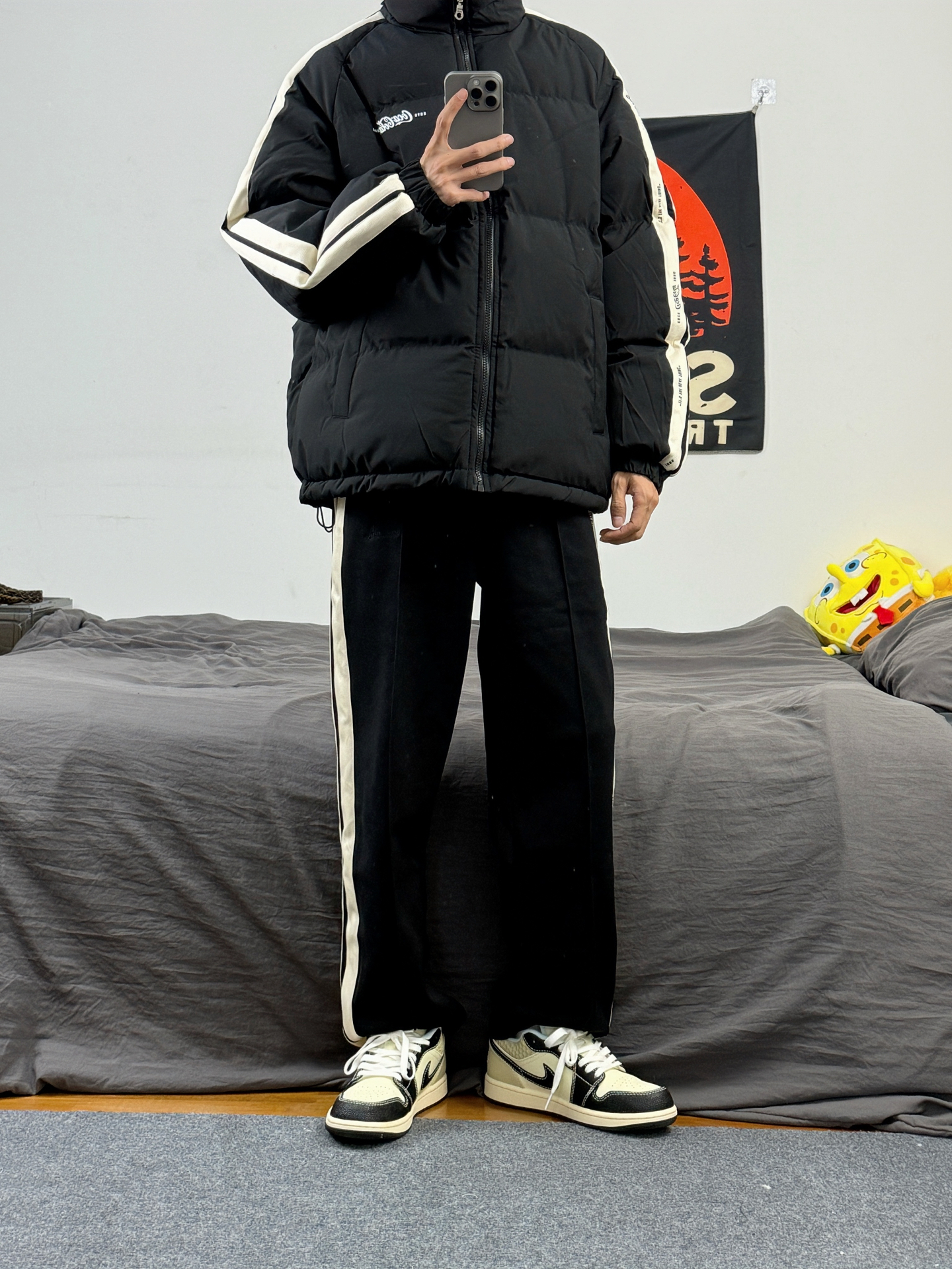 身高174体重48kg 今日上身 黑色棉服+黑裤子+aj1米黑 👔是 #可口可乐服饰 家的黑色面包服 宽松版型,上身蓬松 侧边有竖条纹的设计 款式简约还百搭 上身m码,偏宽松 👖搭配的是这种黑色直筒裤 裤口处有logo刺绣设计 侧边的竖条纹 视觉上有拉伸效果 显得腿又细又长 👟是aj1米黑 百搭的鞋子,配色超好看 #男生冬日穿搭OOTD #今日穿搭分享宝藏棉服 #时髦人士入冬版 #冬季实穿...