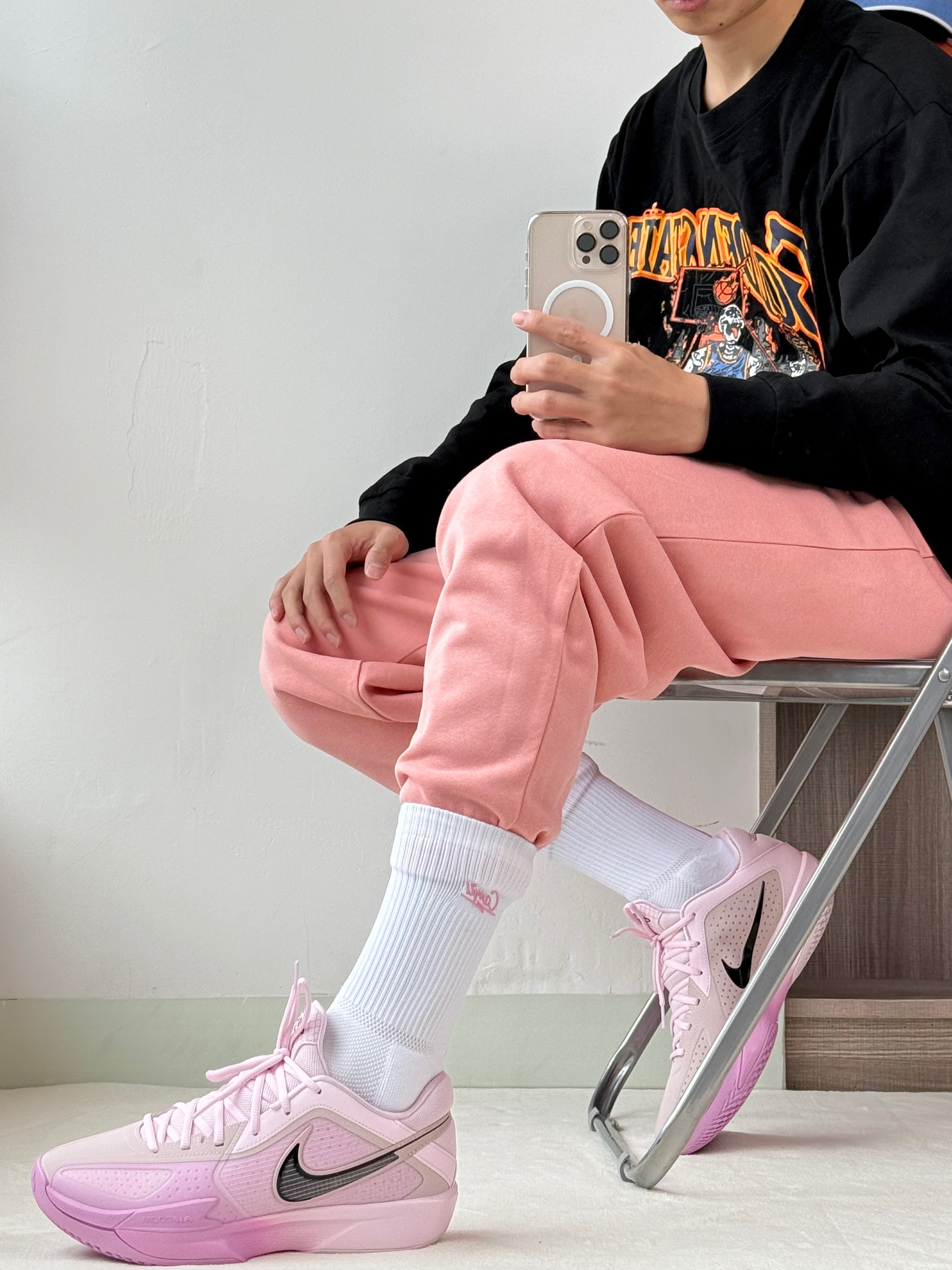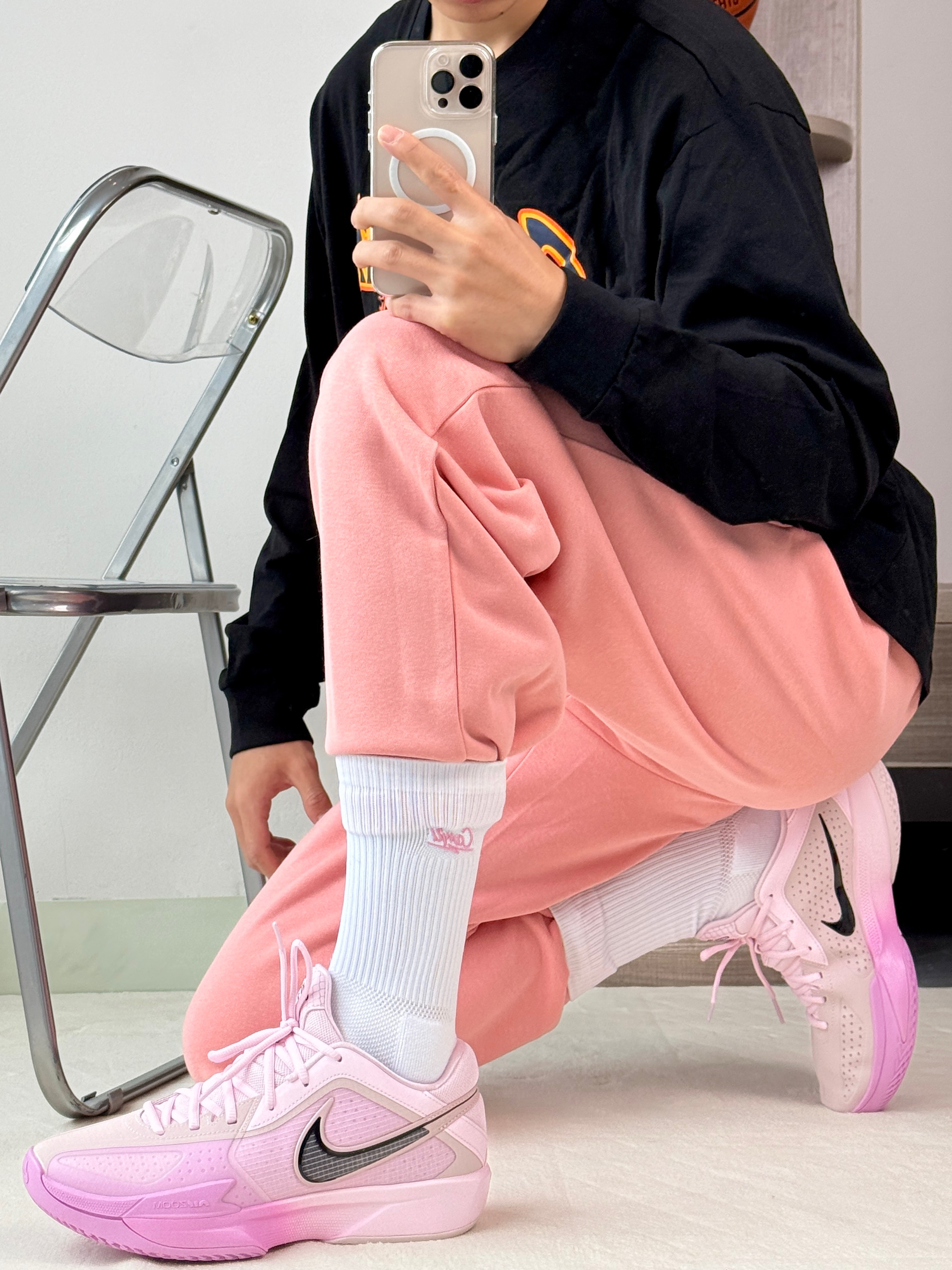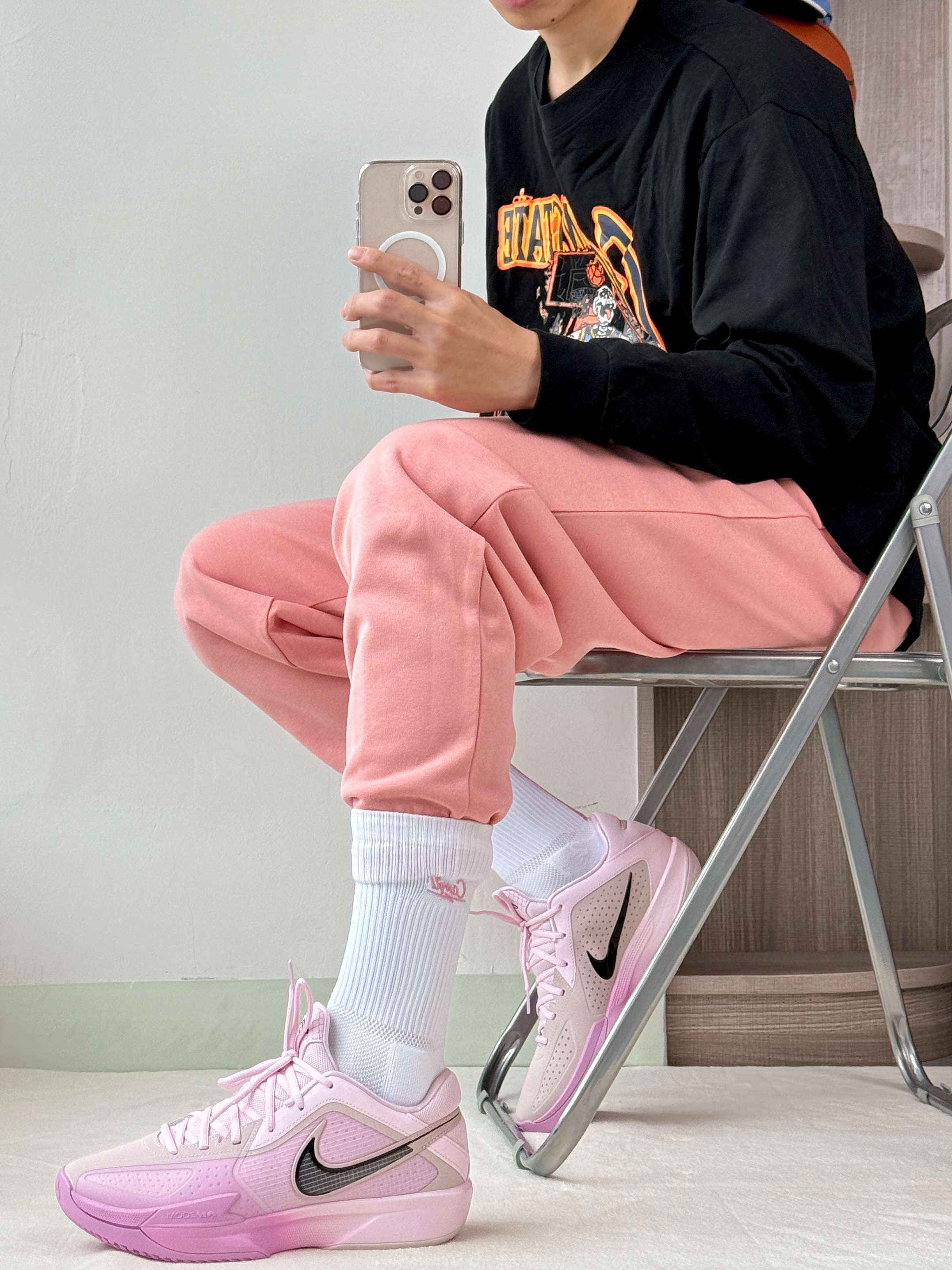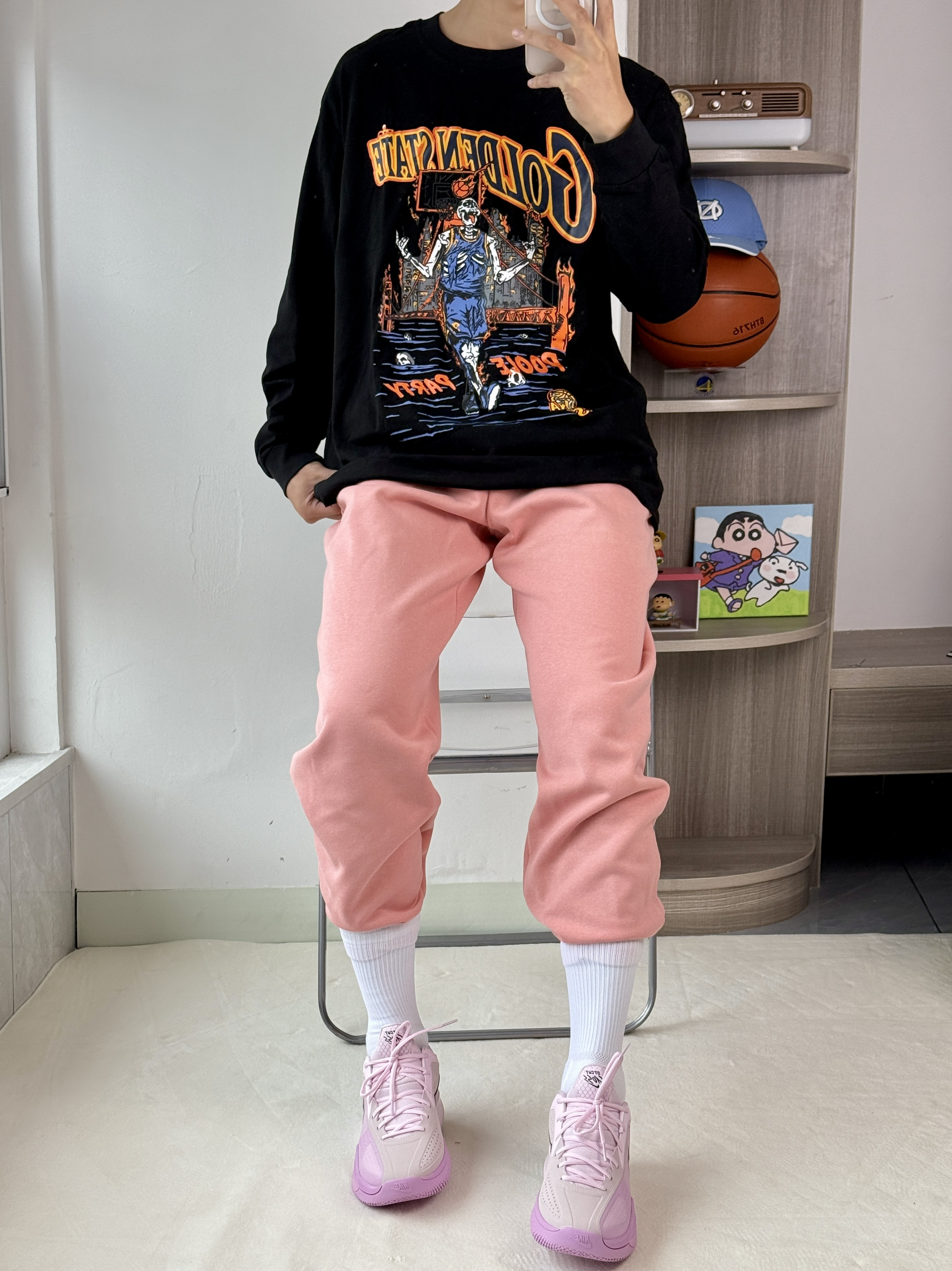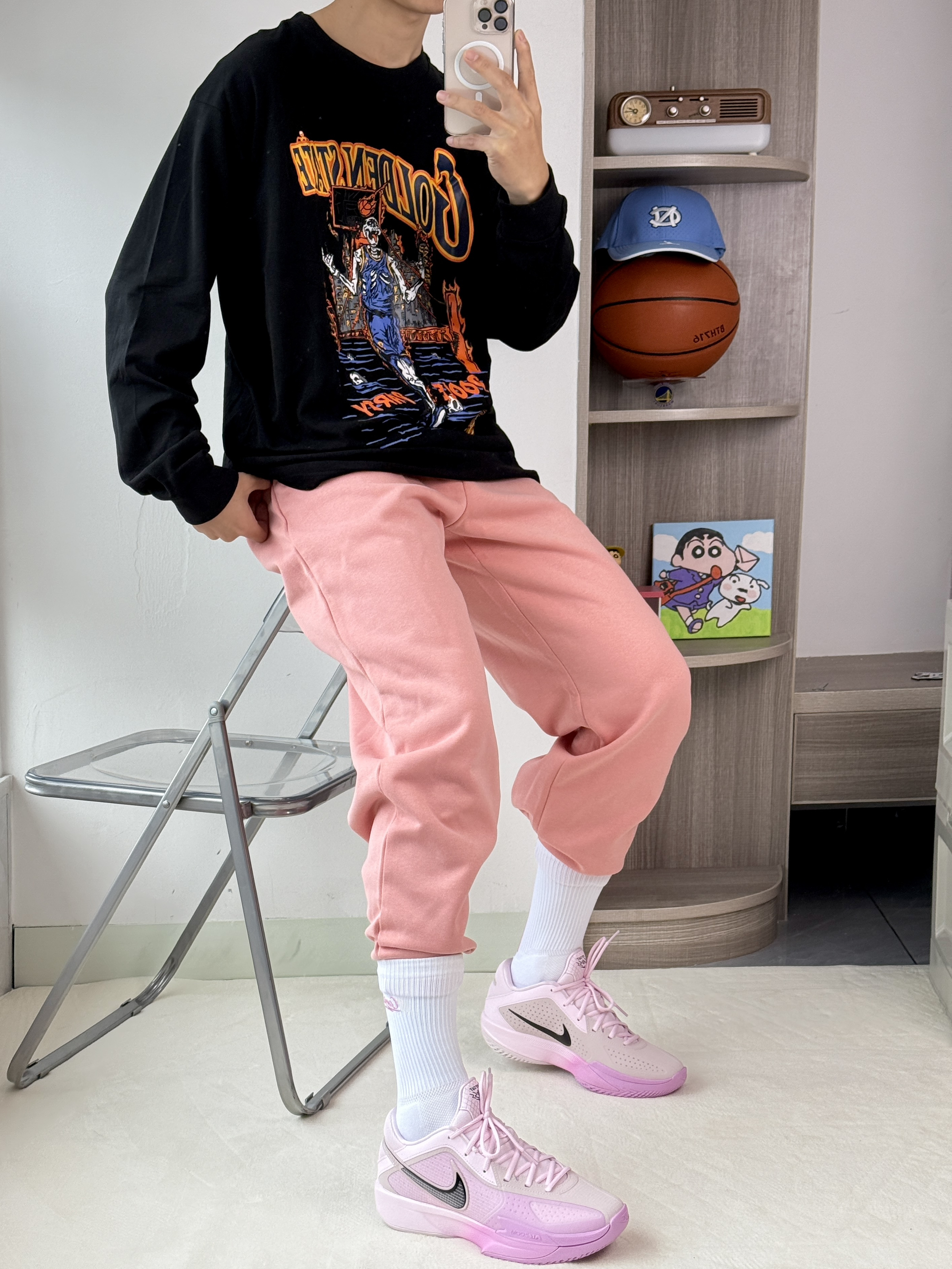 oi哈喽大家好这里是爱球鞋穿搭的小学生的故事 谁说男生就不可以穿粉我就觉得粉色是真的帅! 👔👖选择一件黑色长袖酷炫的美式印花嘎嘎帅 搭配一条宽松舒适的粉色长裤打球就这样穿 👟GT CROSS今日份又给大家分享上脚图喽很 能打黑粉的配色帅不帅大家来参考参考吧