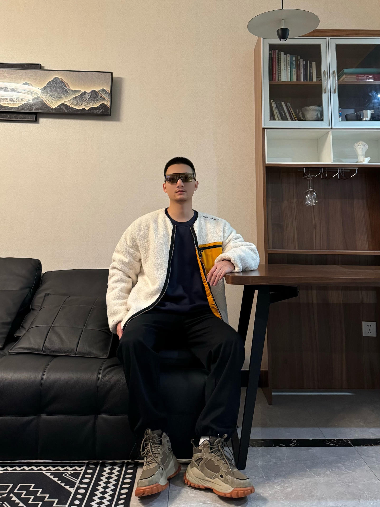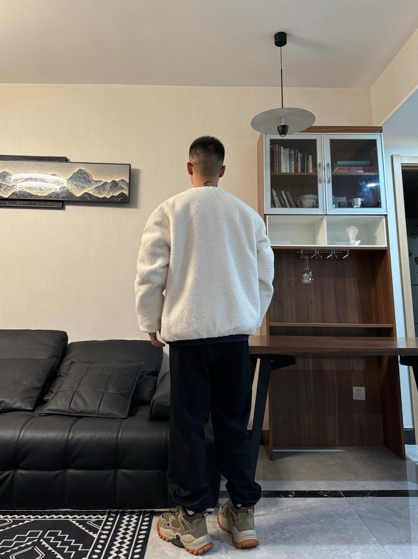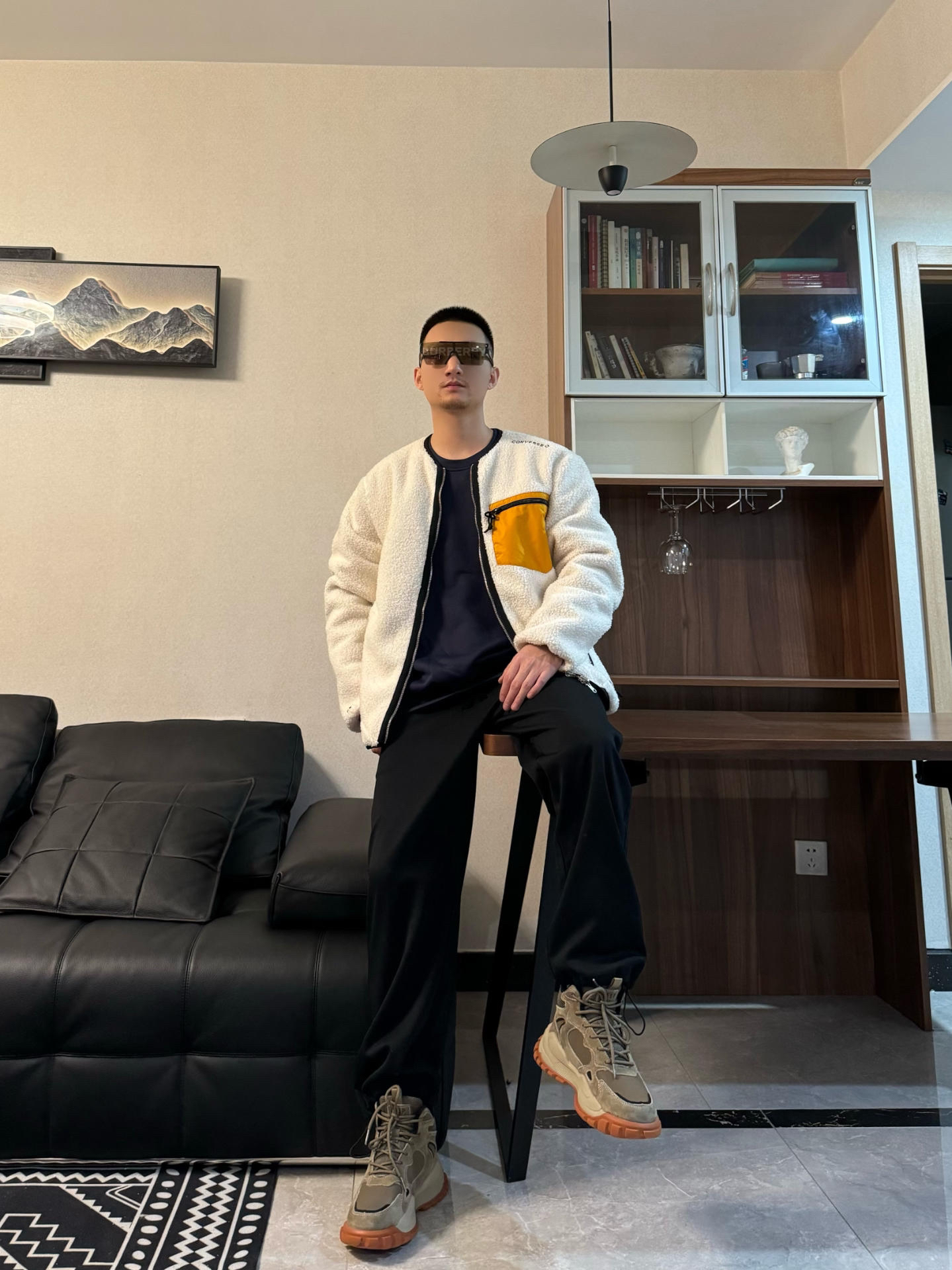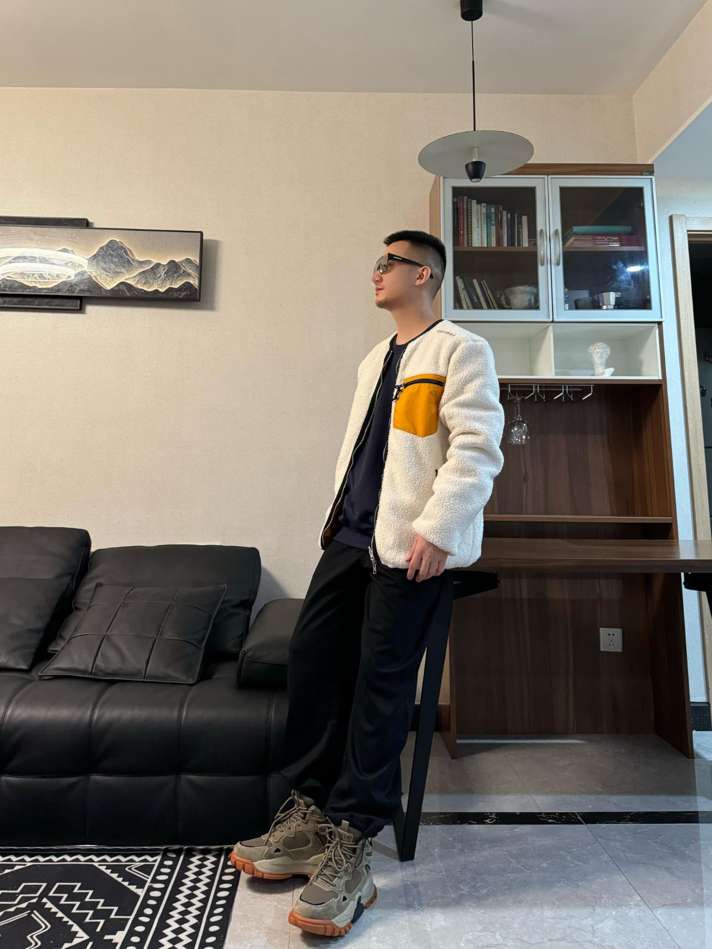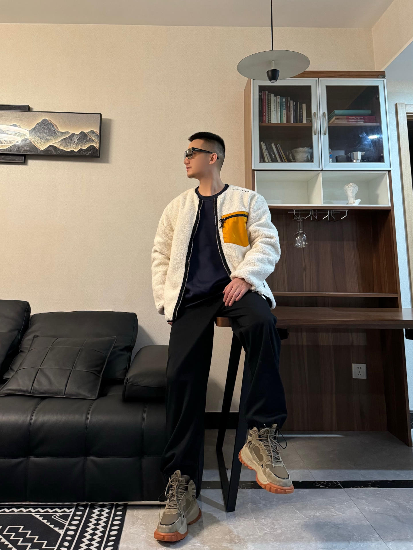 上身羊羔绒夹克外套 拼接的设计 很细节 还是两面穿的哦 版型是宽松的 给了内搭很大发挥空间 来一件黑色卫衣打底层次感轻松拿捏! 下身来一条黑色休闲裤 裤型很修饰身材 时尚百搭~ 再搭配一双雪地靴 脚感柔软舒适 美拉德配色满满的秋冬氛围感 内里加绒加厚的设计 保暖度很在线 和上身来个浅浅的呼应 帅气出街!