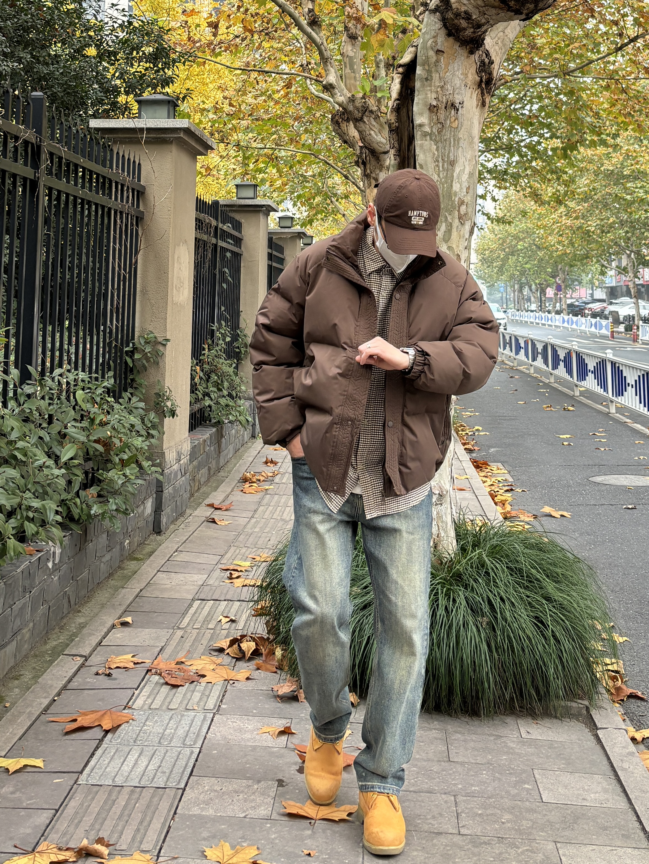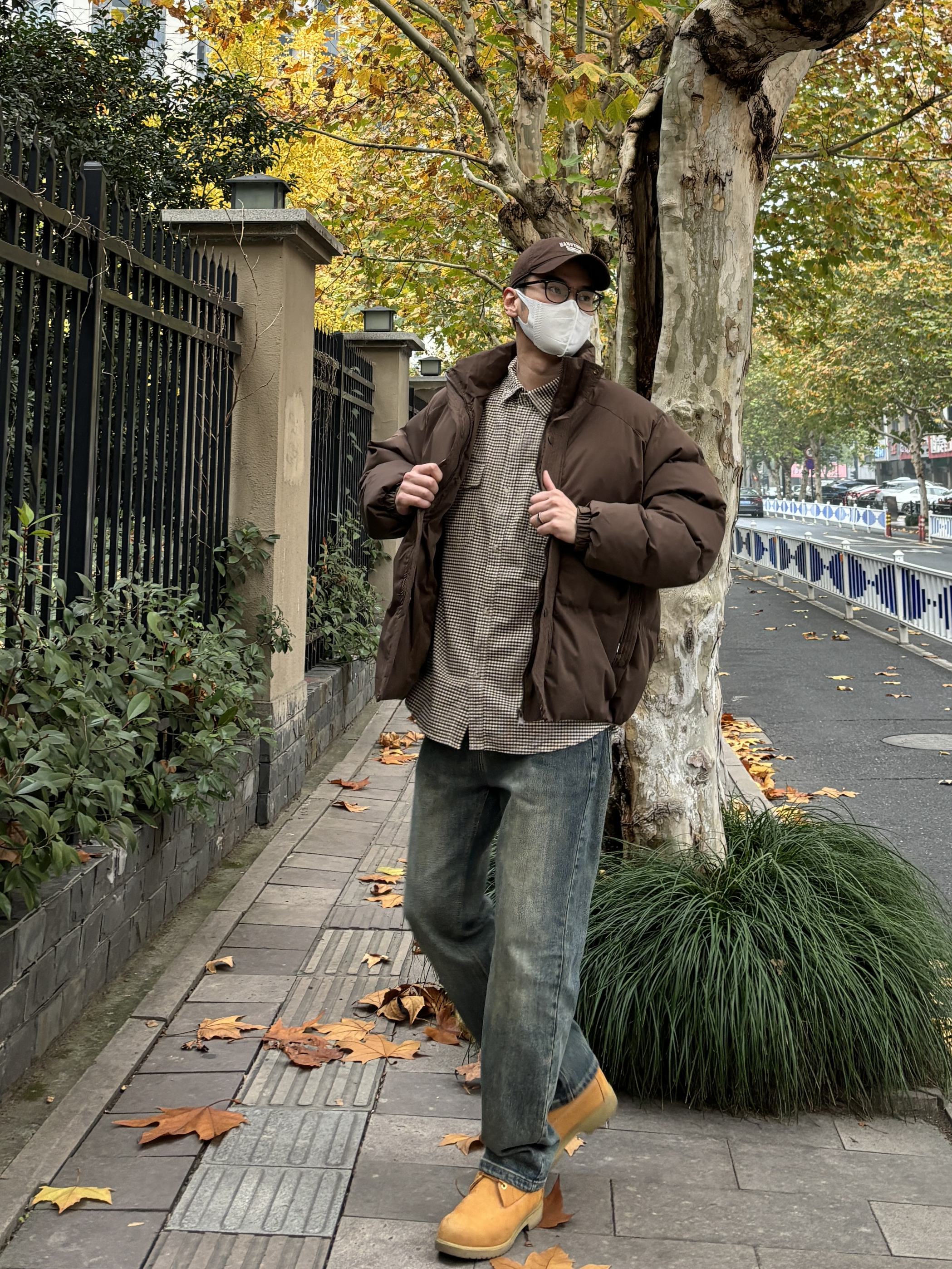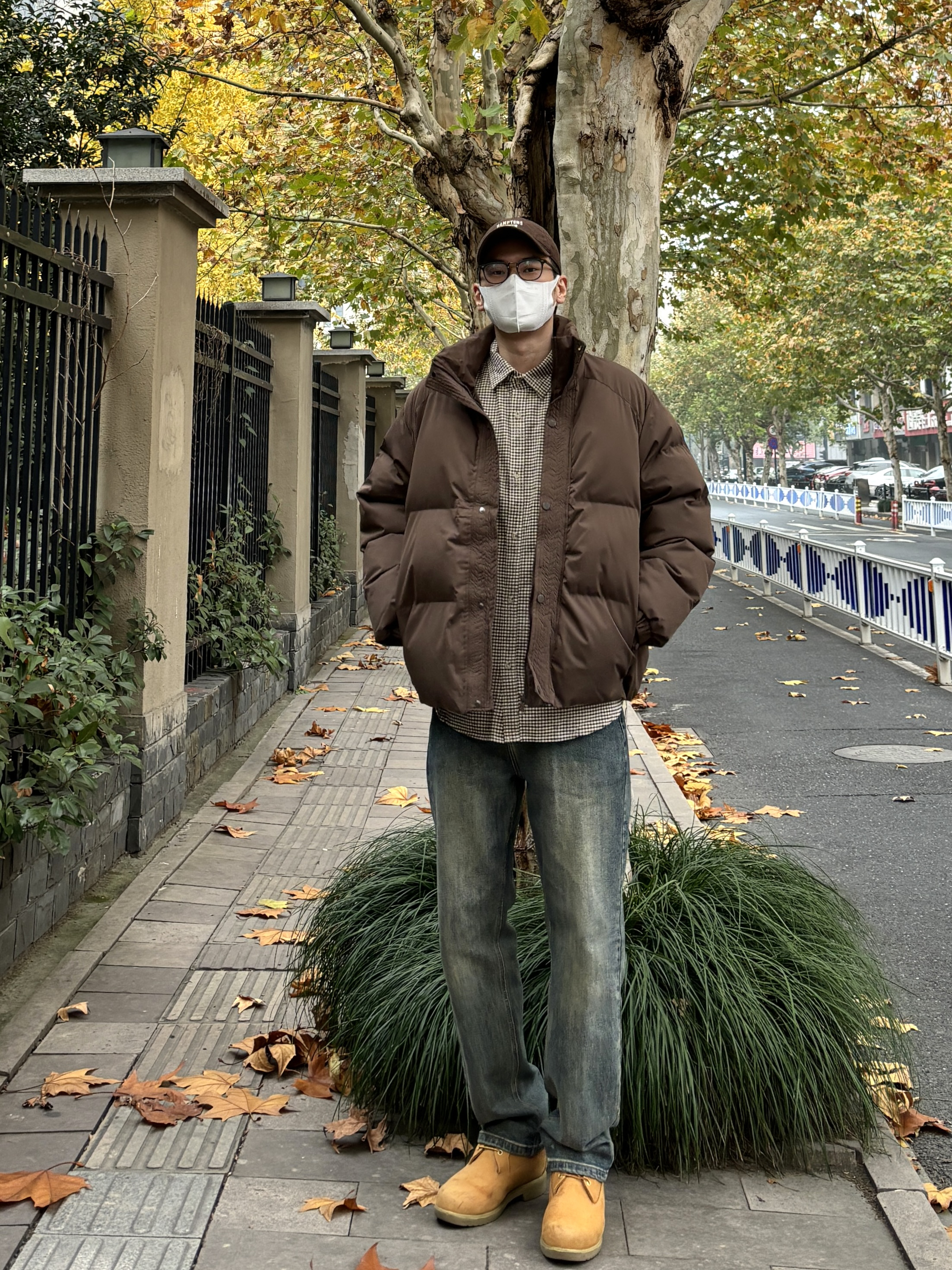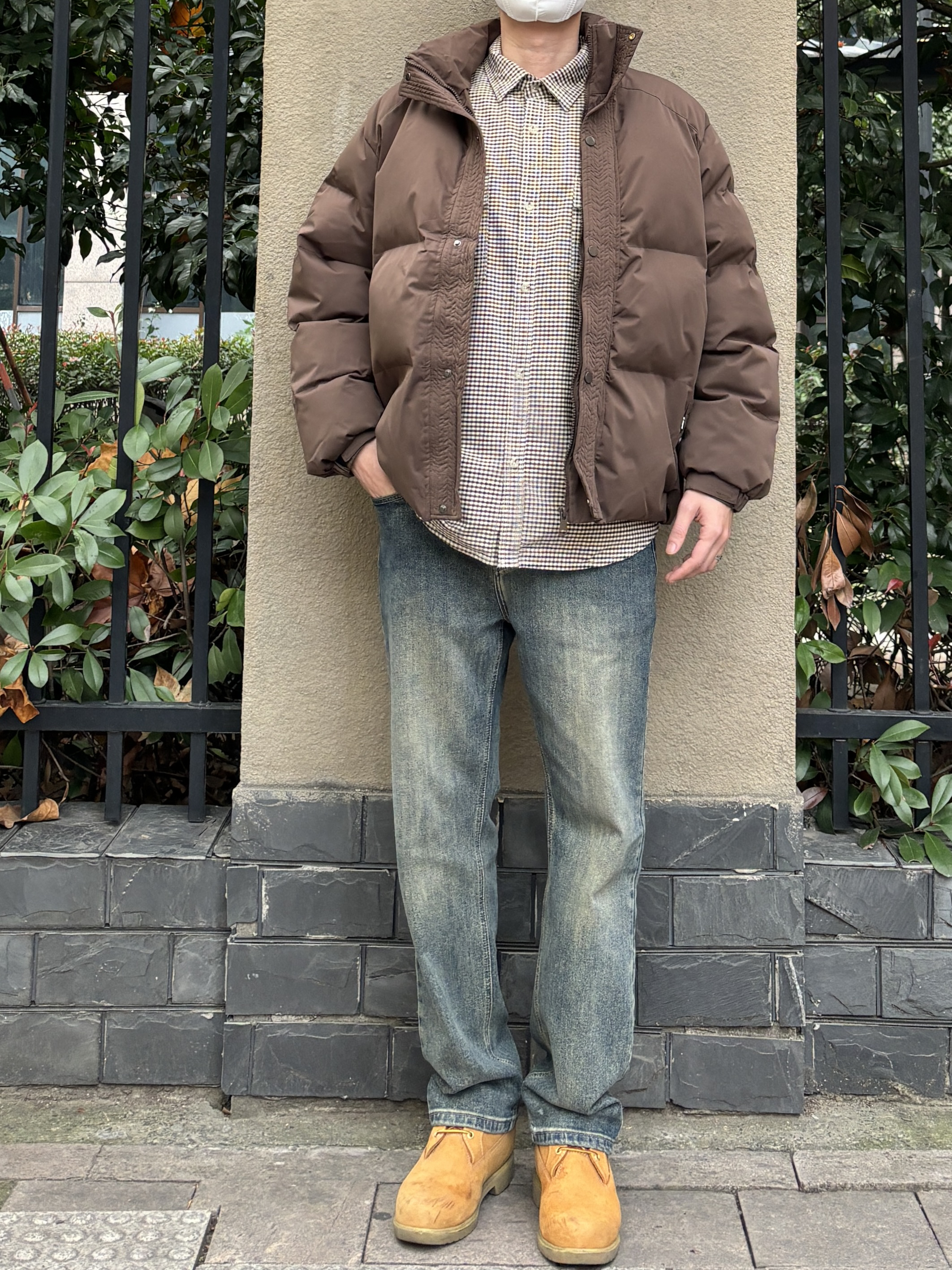 今天这套先用咖啡色细格子休闲衬衫做内搭 ⬇️ 裤子选择简约大方的水洗直筒牛仔裤 ⬇️ 鞋子上脚经典百搭的timberland复古工装靴 ⬇️ 接着套上棕色宽松阔版立领加厚保暖棉服 ⬇️ 最后戴一顶棒球帽呼应下衣服的颜色 - 今日搭配 衣服裤子:NICE LILI 鞋子:timberland