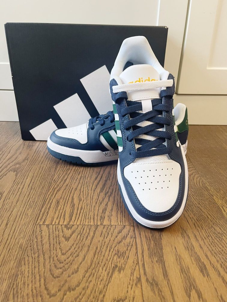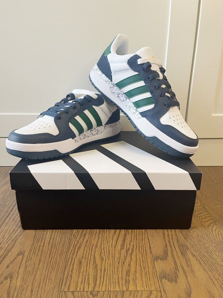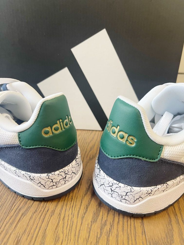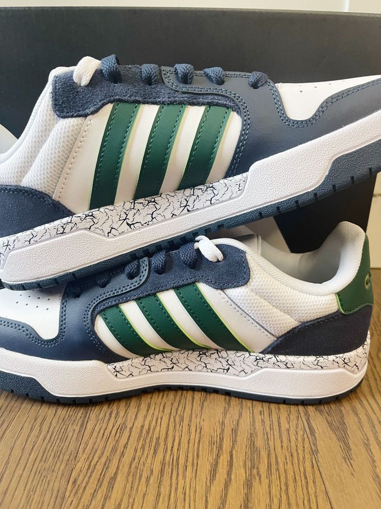 hi这里是新一说鞋!,今天开箱阿迪达斯entrap白蓝绿配色,特别受学生欢迎。首先,这双鞋配色百搭,白色鞋身配绿色三道杠,鞋底也是绿色,有点像耐克的黑曜石配色。细节上,鞋舌和后跟有阿迪达斯logo,后跟还有金标,中底纹路独特。鞋面材质是牛二层革、合成革和织物,大部分是光滑皮革,触感细腻,容易打理。蓝色皮革部分是麂皮,质感好但打理稍难。 学生喜欢这双鞋,一是配色和鞋型适合搭配校裤或直筒裤,二是价格亲...
