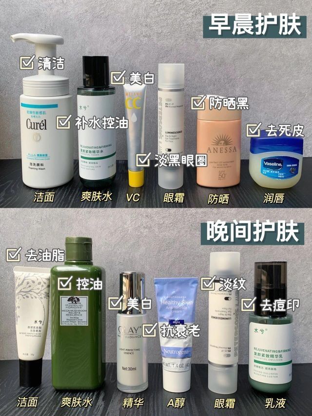 早晨护肤步骤:清洁-爽肤水-VC精华-眼霜-防晒 晚间护肤步骤:清洁-爽肤水-美白精华-A醇面霜-眼霜-乳液