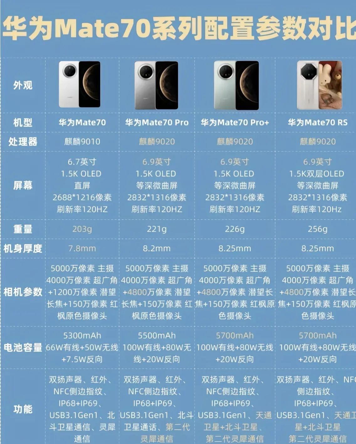 华为 Mate70 系列重磅登场,四款机型各显神通。 外观上,Mate70 直屏轻盈,重 203g。Mate70 Pro 起则是微曲屏,配置升级致重量增加但可控。Mate70 RS 非凡大师版将华为精致与保时捷设计融合,陶瓷机身撞色设计奢华无比,不过追求实用的选 Mate70 或 Mate70 Pro 更合适。 性能方面,Mate70 配麒麟 9010 处理器,Mate70 Pro 等搭载...