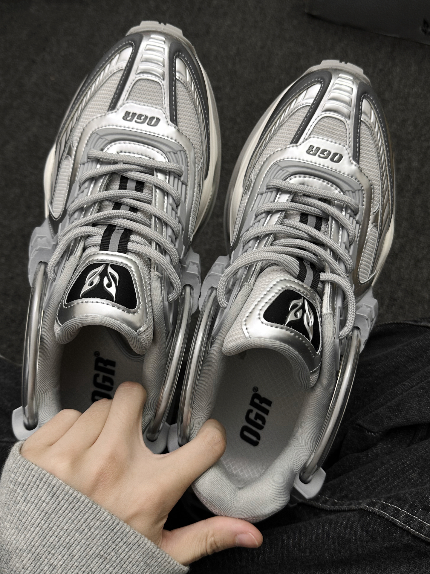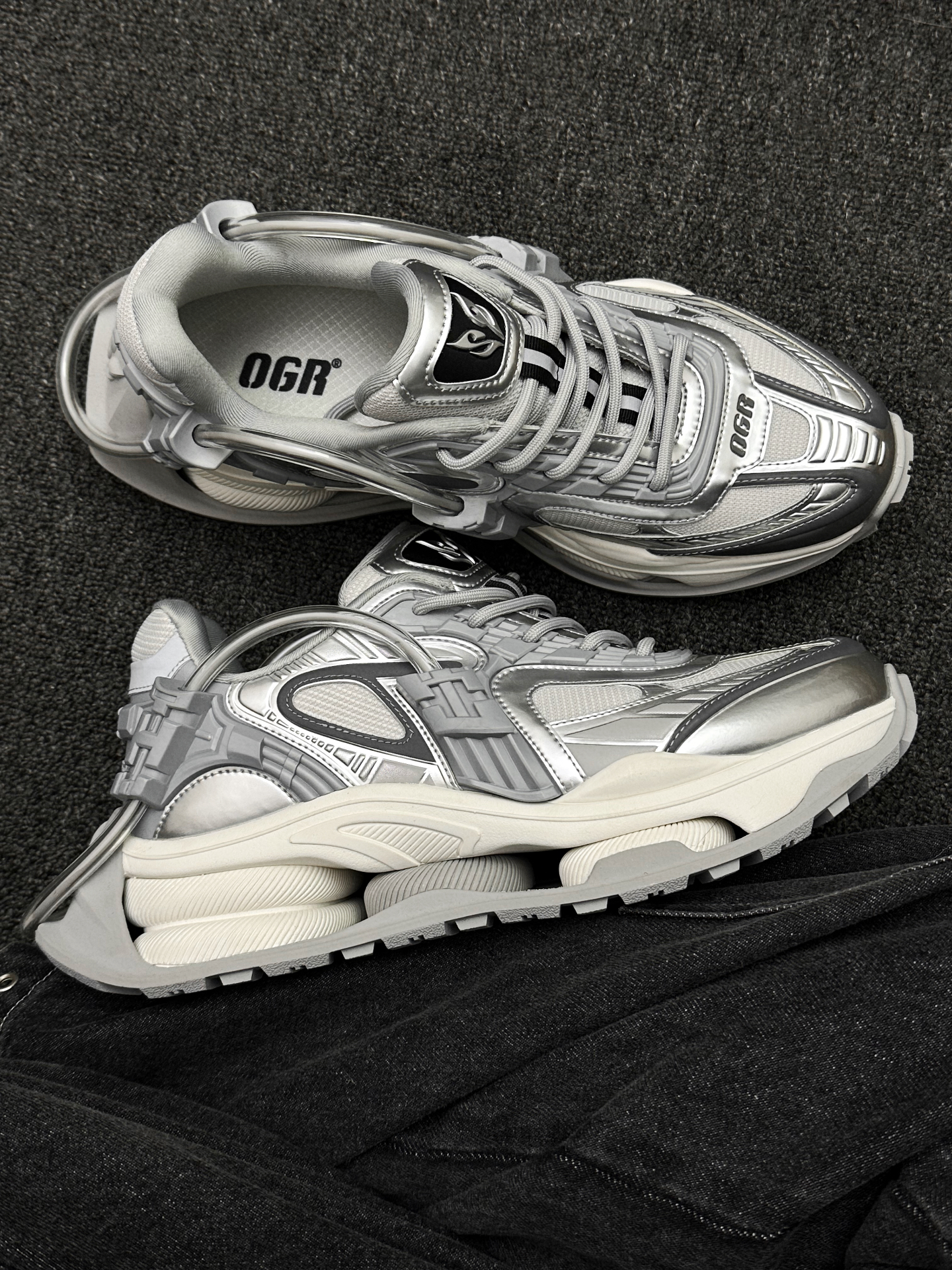 OGR 新出的这双穿梭者真的不要太帅 银灰色很有千禧复古氛围感 搭配机甲模块和夸张的鞋型 未来感十足 镂空的中底设计 好像糯叽叽的大福 上脚脚感软弹 有一种踩在☁️上的感觉 5cm的大厚底 上脚巨增高很显腿长 #OGR机甲鞋 #我的双旦接头时刻 #双旦仪式感跟我学 #FOOTINDUSTRY足下工业 #一脚踏入冬 #积极入冬的仪式感 #入冬装备准备好了 ...